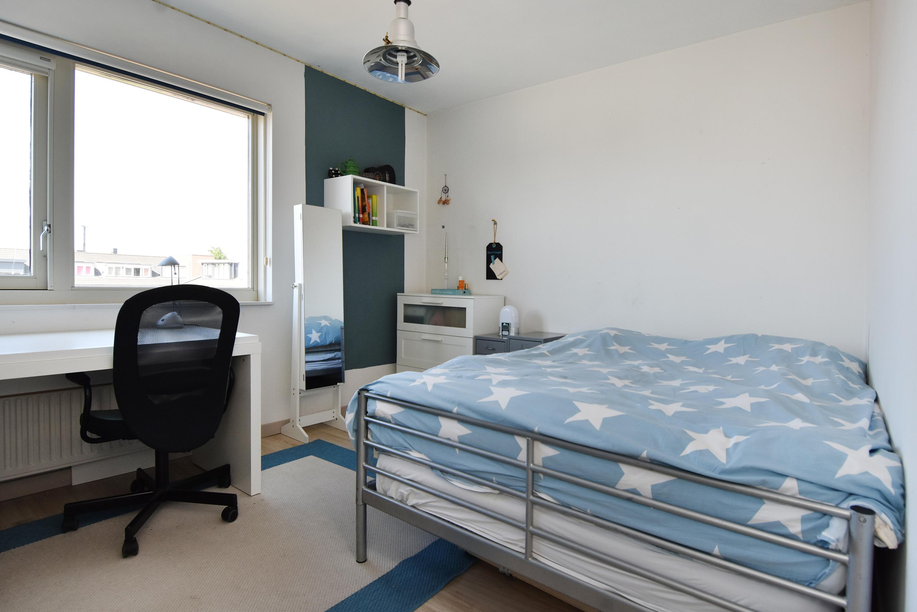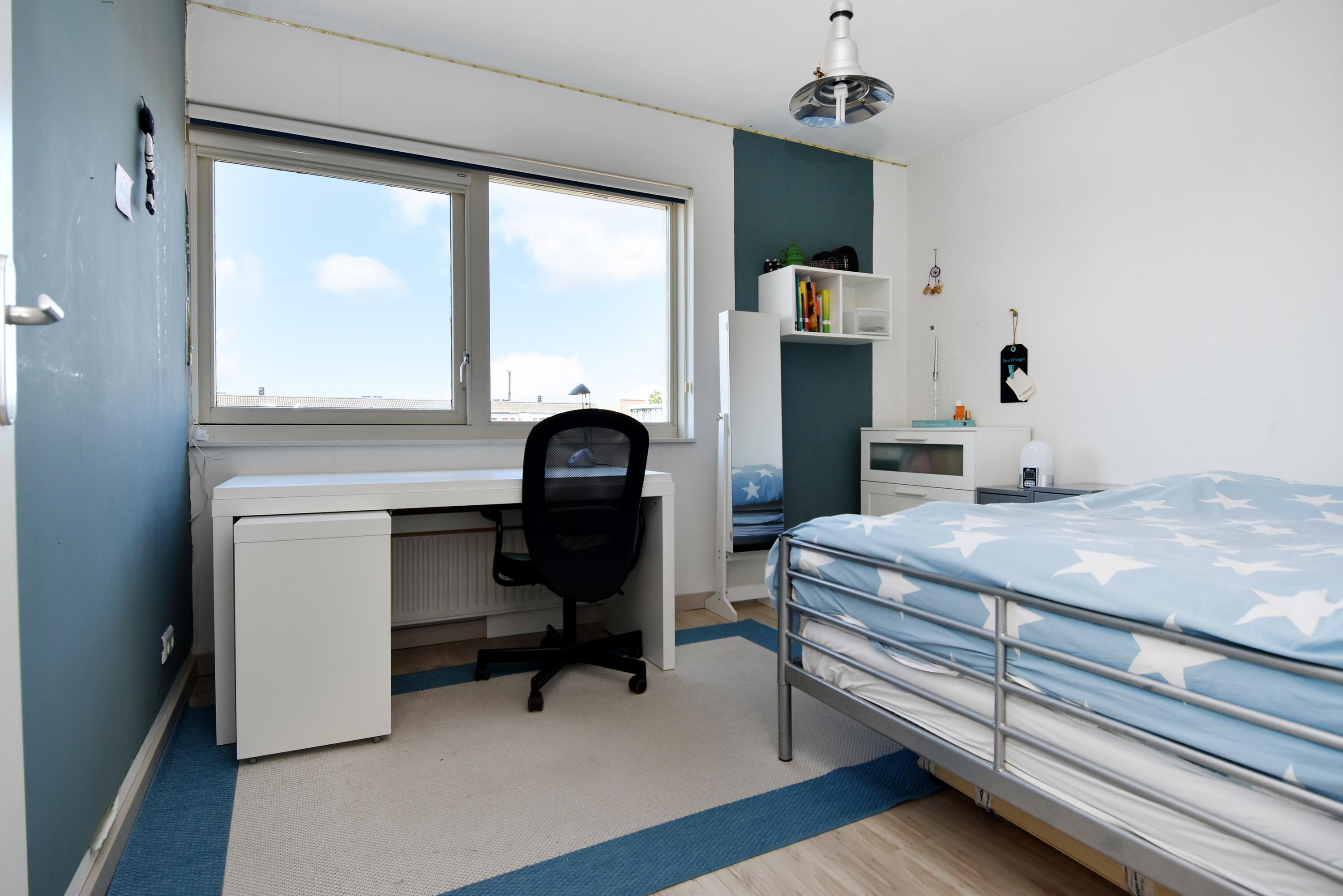 Op de eerste verdieping vind je maar liefst vijf volwaardige slaapkamers, waarvan één momenteel als kastenkamer wordt gebruikt. De moderne badkamer met dubbele wastafel en twee inloopdouches zorgt voor comfort en gemak, terwijl een apart toilet extra praktisch is voor een groot gezin.