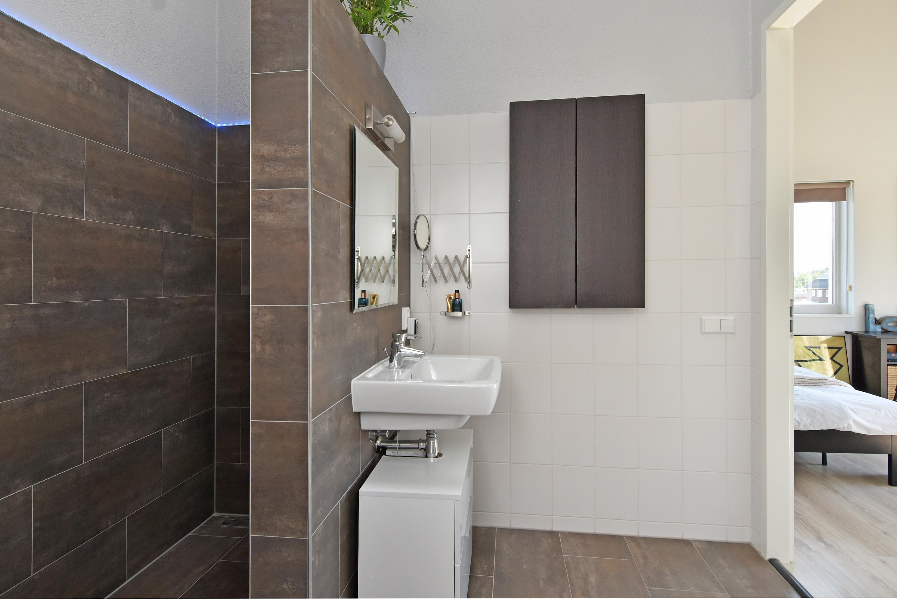 De tweede badkamer is modern en beschikt over een wastafel, een ruime inloopdouche en een derde toilet.