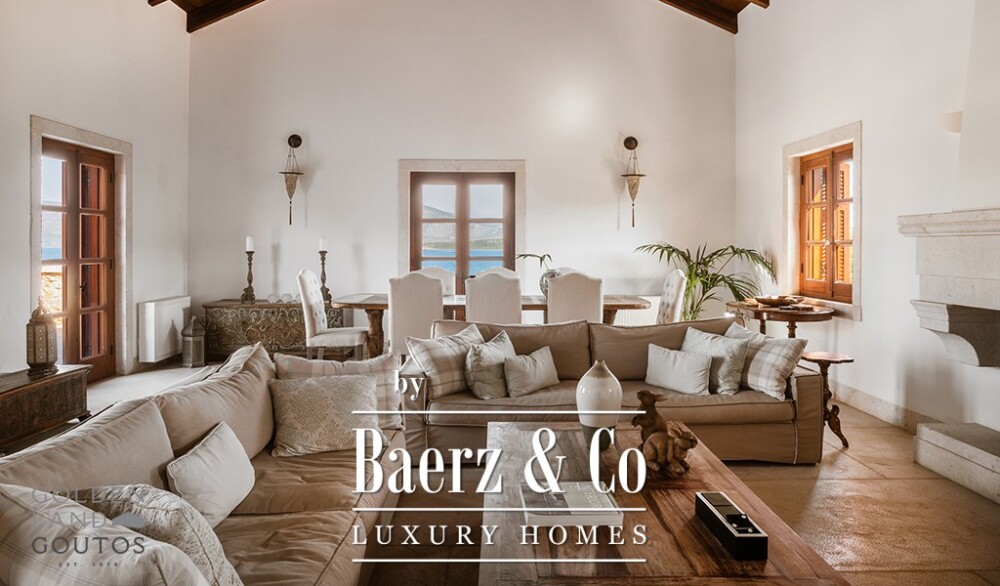 Seafront villa Doroufi grenst direct aan het kristalheldere water van Griekenland en biedt 700 m² verfijnd wooncomfort op een weelderig perceel van 11.000 m². Deze woning ligt aan een semi-privéstrand met eigen aanlegsteiger, wat zeldzame privacy en directe toegang tot de zee garandeert. De architectuur combineert Franse landelijke elegantie met het authentieke karakter van Griekenland; de natuurstenen gevel leidt naar een interieur waar ingetogen luxe en verfijning de toon zetten. Acht slaapkamers bieden ruimte aan familie en gasten en profiteren stuk voor stuk van de doordachte oriëntatie van de villa, waardoor lichtinval en weids uitzicht op zonsondergangen optimaal zijn.