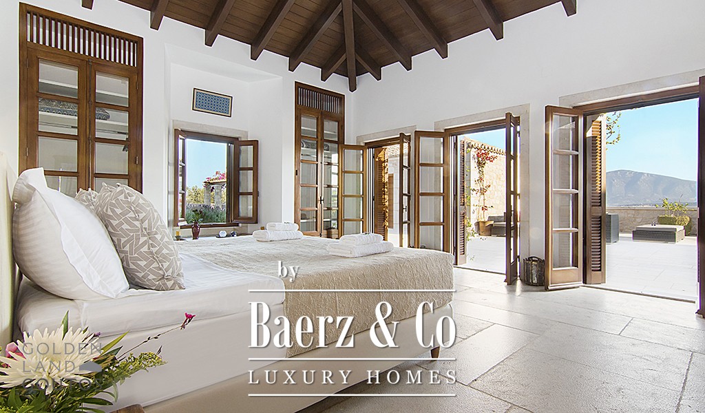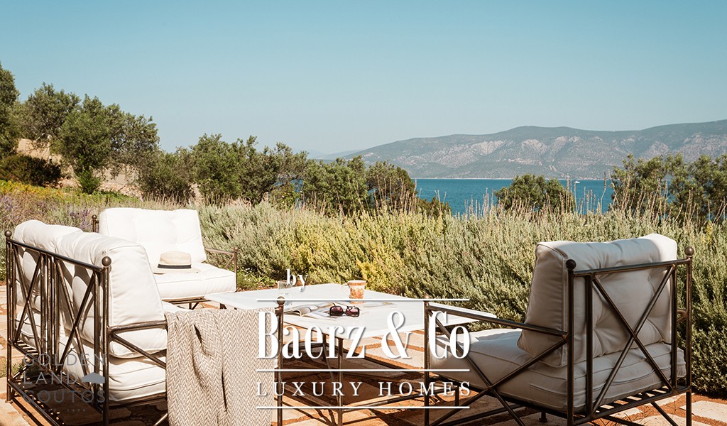 Binnen heerst een koele, serene sfeer met hoge plafonds, een open haard en subtiele afwerkingen die bijdragen aan het gevoel van moeiteloos comfort. Airconditioning, royale leefruimtes, een interne trap en volop bergruimte zorgen voor ultiem gemak. Buiten omringen olijfbomen de terrassen, is er een pergola, zijn er tuinen, een barbecue en een privézwembad – elk onderdeel harmonieert met het zeezicht. Water en panoramische uitzichten bepalen de beleving, terwijl het toegangshek discretie waarborgt.