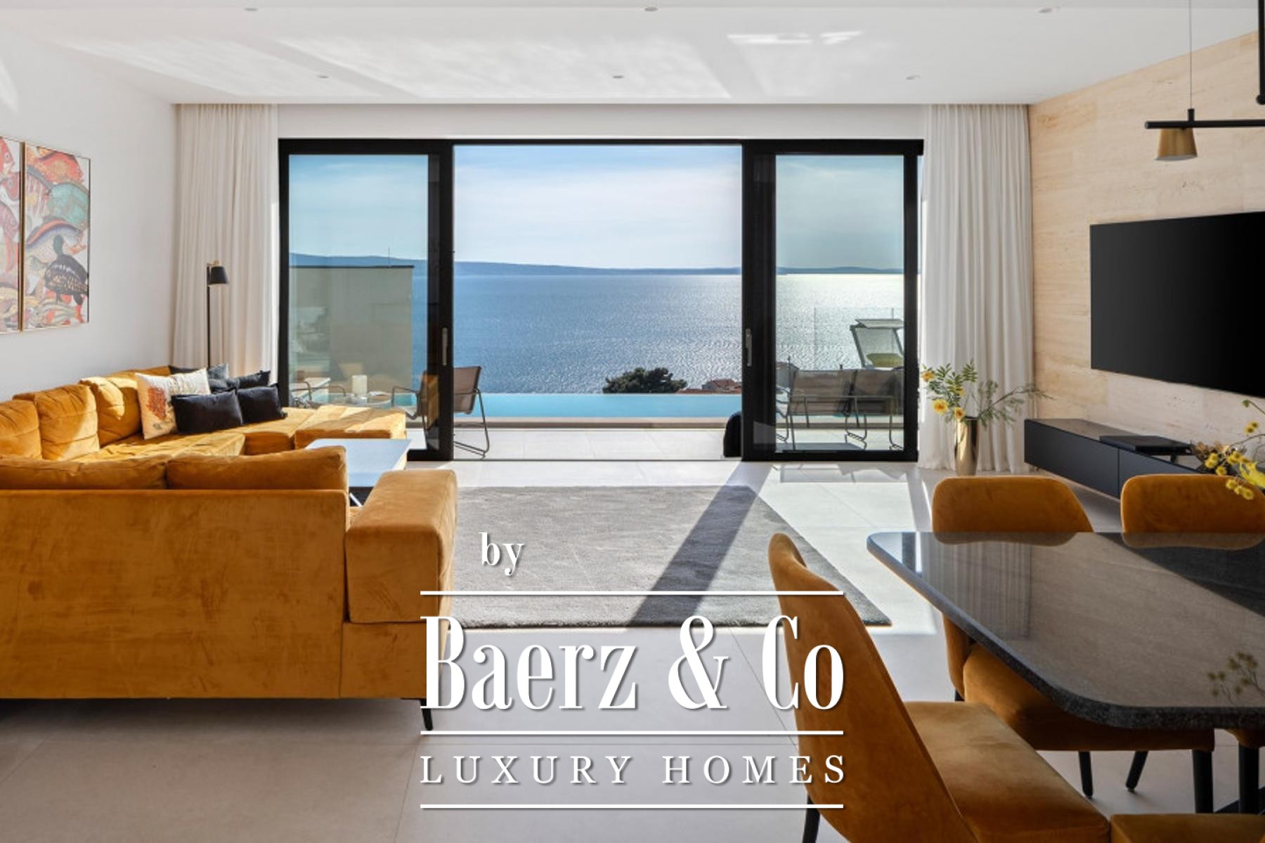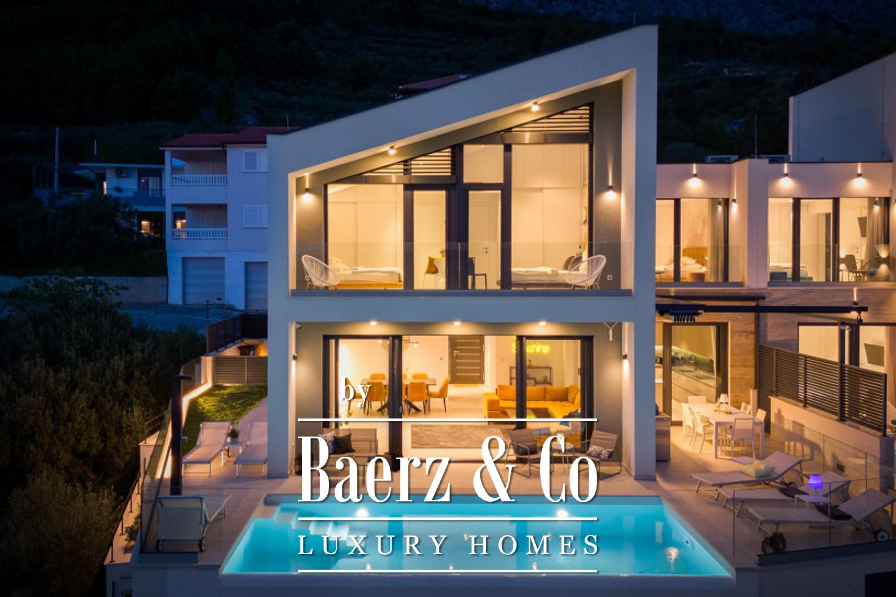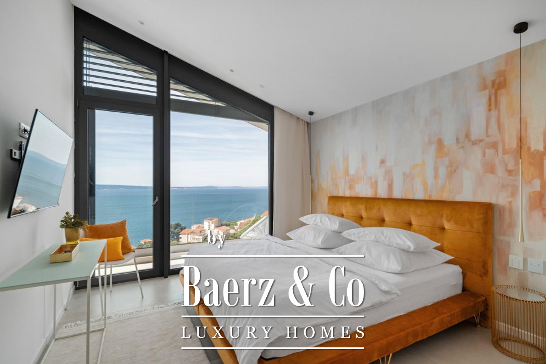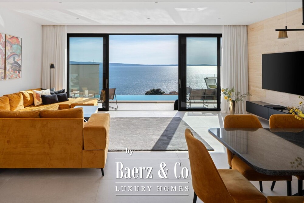 De halfvrijstaande villa in Dugi Rat straalt verfijnde rust uit en is ontworpen om vanuit alle drie zorgvuldig ingedeelde verdiepingen een weids uitzicht op zee te bieden. Deze eigentijdse woning van 222 m² verwelkomt met een open leefruimte, waar woonkamer, eetkamer en royale keuken naadloos overlopen in een ruim terras. Schuifpuien van vloer tot plafond laten het uitzicht op de Adriatische Zee optimaal tot zijn recht komen en brengen het licht en de kalmte van deze unieke kustlocatie naar binnen.