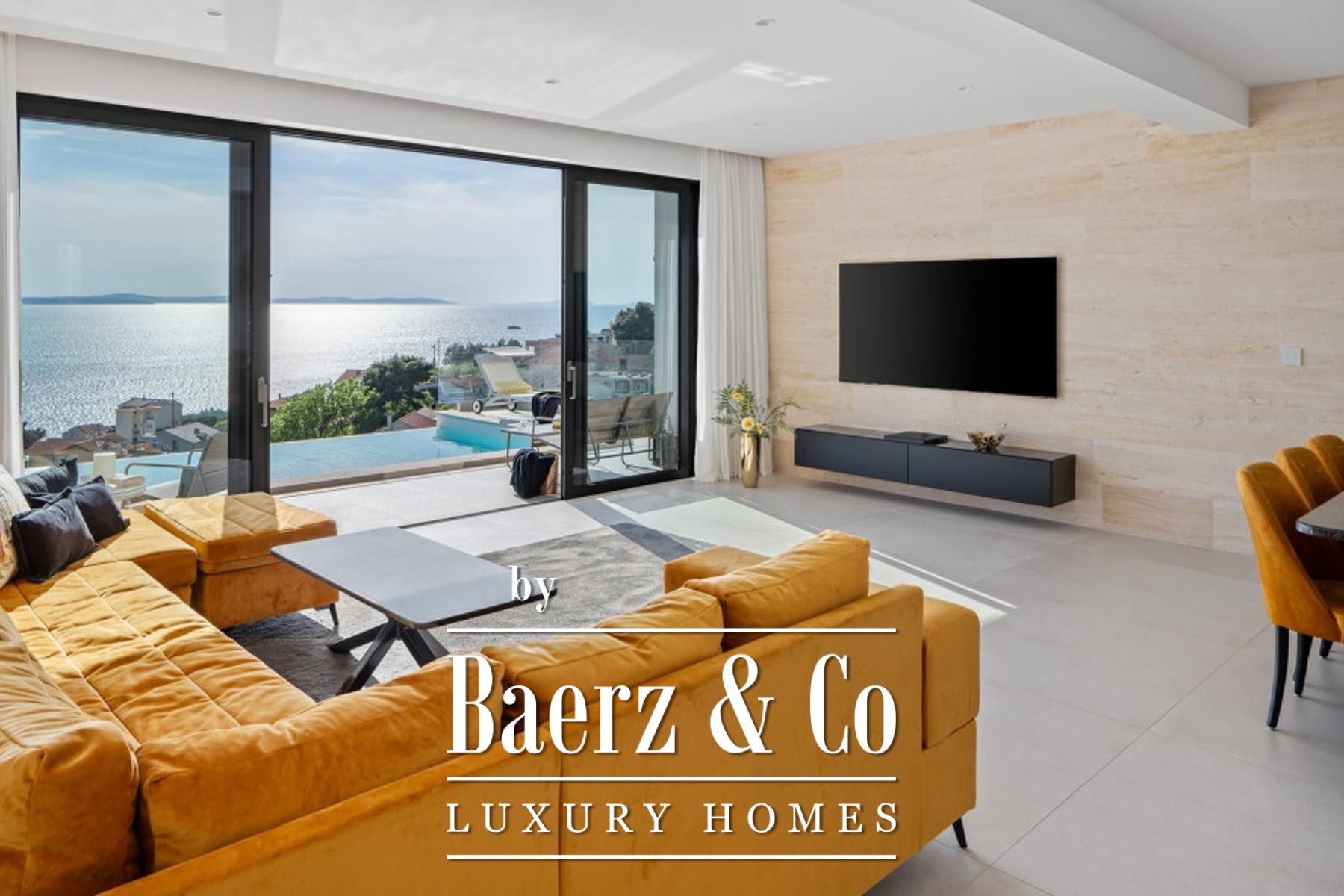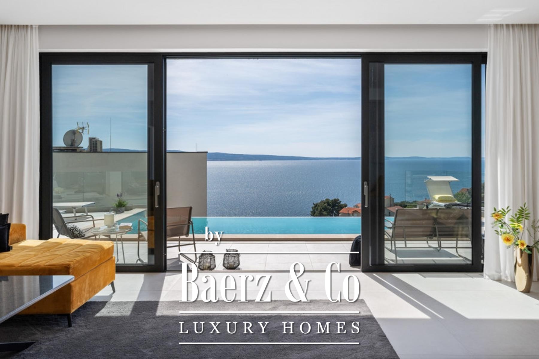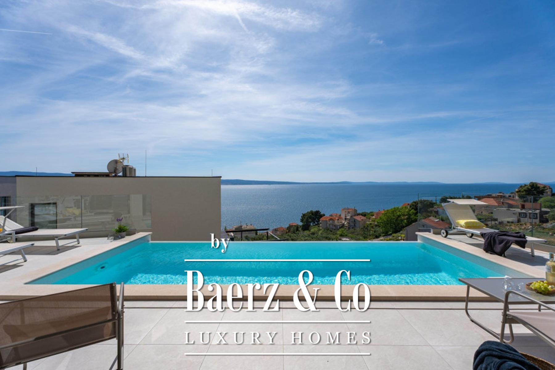 De halfvrijstaande villa in Dugi Rat straalt verfijnde rust uit en is ontworpen om vanuit alle drie zorgvuldig ingedeelde verdiepingen een weids uitzicht op zee te bieden. Deze eigentijdse woning van 222 m² verwelkomt met een open leefruimte, waar woonkamer, eetkamer en royale keuken naadloos overlopen in een ruim terras. Schuifpuien van vloer tot plafond laten het uitzicht op de Adriatische Zee optimaal tot zijn recht komen en brengen het licht en de kalmte van deze unieke kustlocatie naar binnen.
