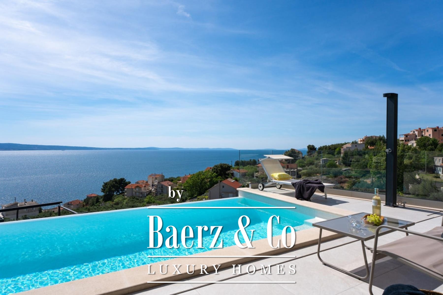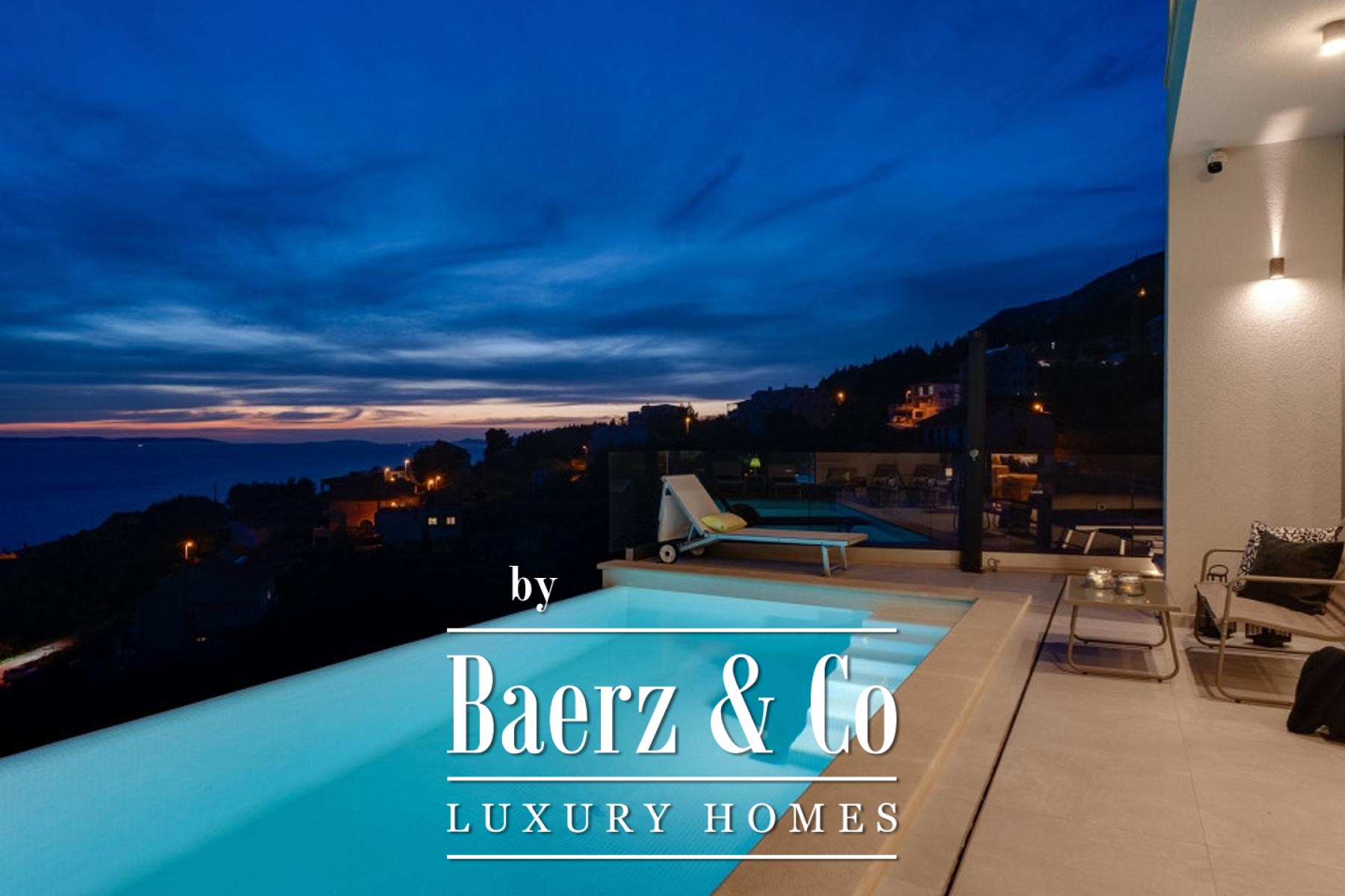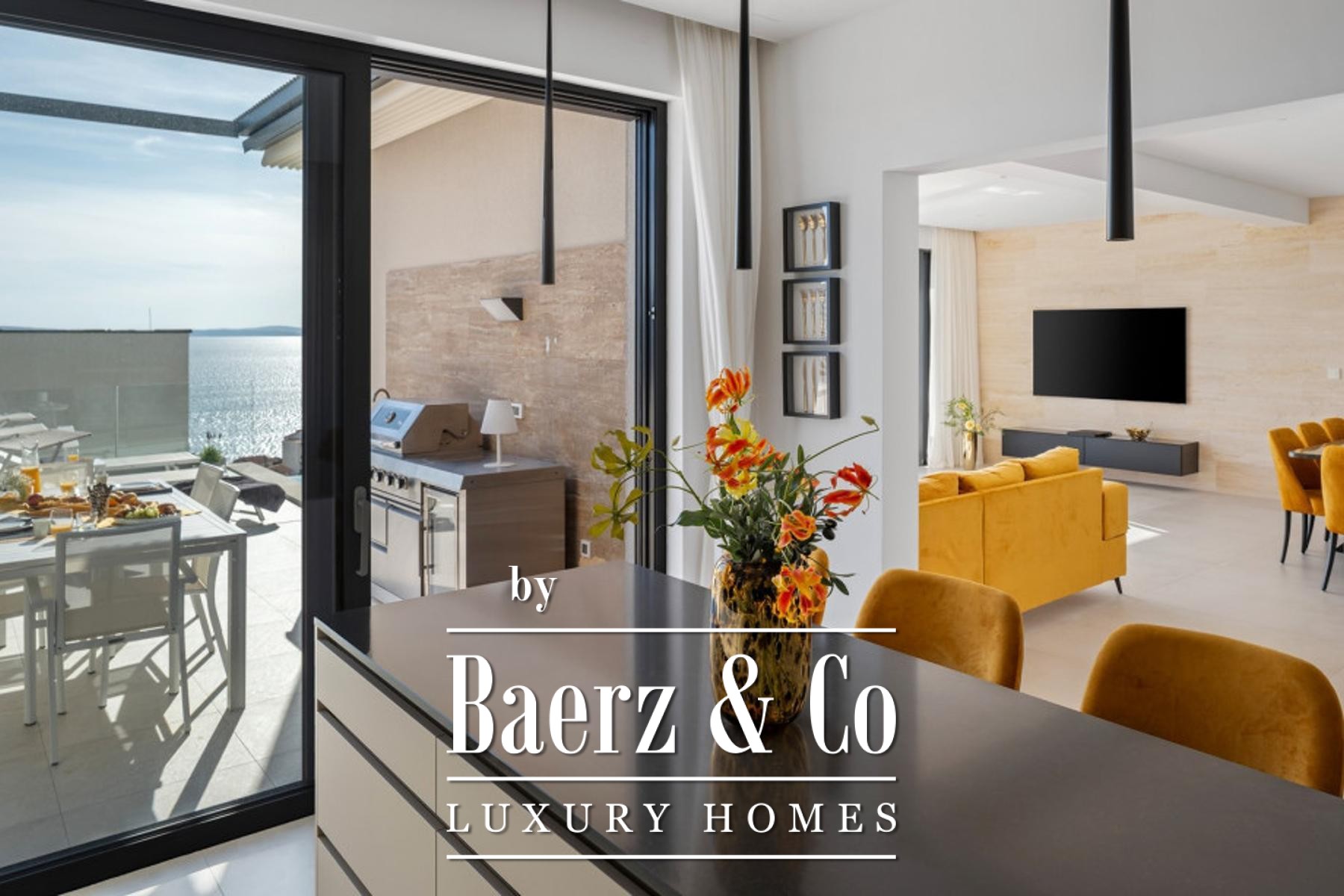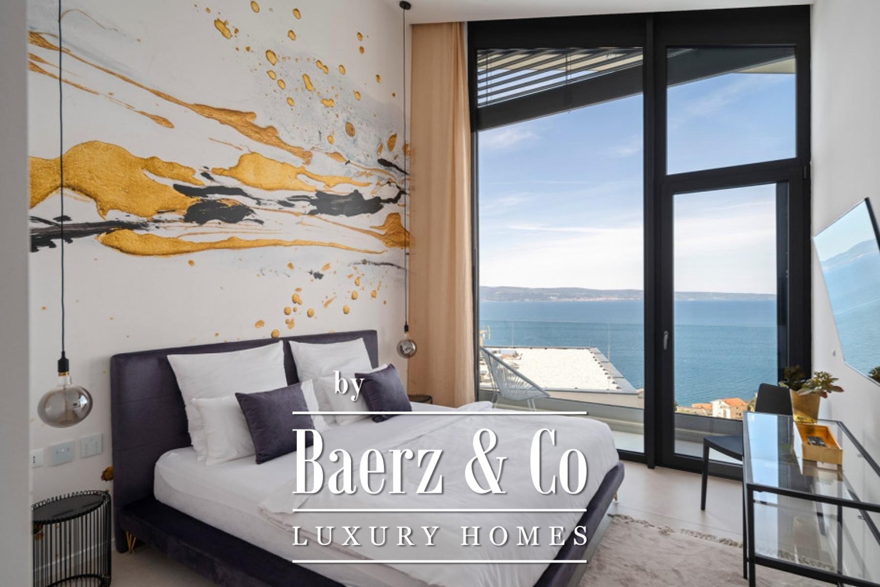 De halfvrijstaande villa in Dugi Rat straalt verfijnde rust uit en is ontworpen om vanuit alle drie zorgvuldig ingedeelde verdiepingen een weids uitzicht op zee te bieden. Deze eigentijdse woning van 222 m² verwelkomt met een open leefruimte, waar woonkamer, eetkamer en royale keuken naadloos overlopen in een ruim terras. Schuifpuien van vloer tot plafond laten het uitzicht op de Adriatische Zee optimaal tot zijn recht komen en brengen het licht en de kalmte van deze unieke kustlocatie naar binnen.