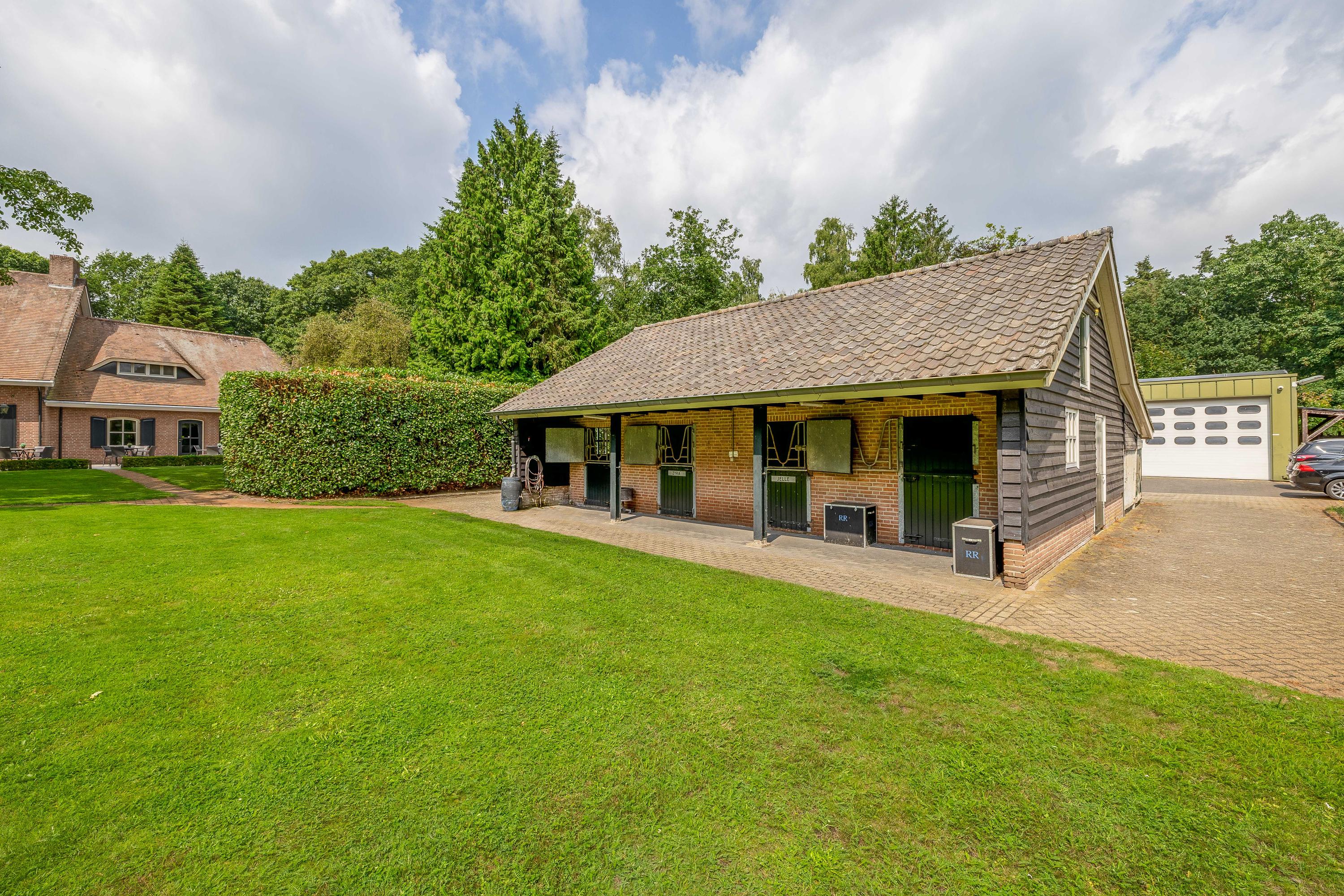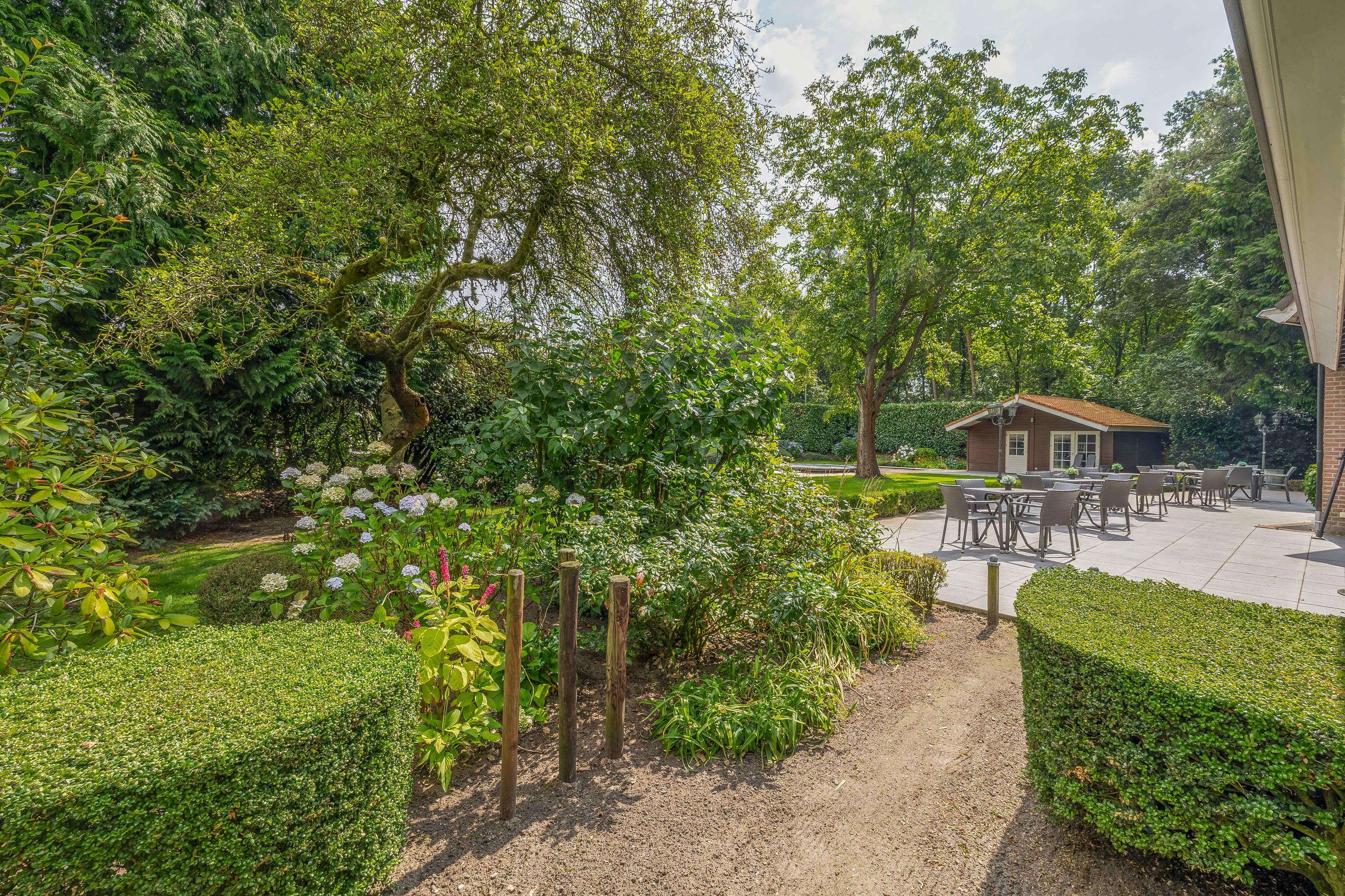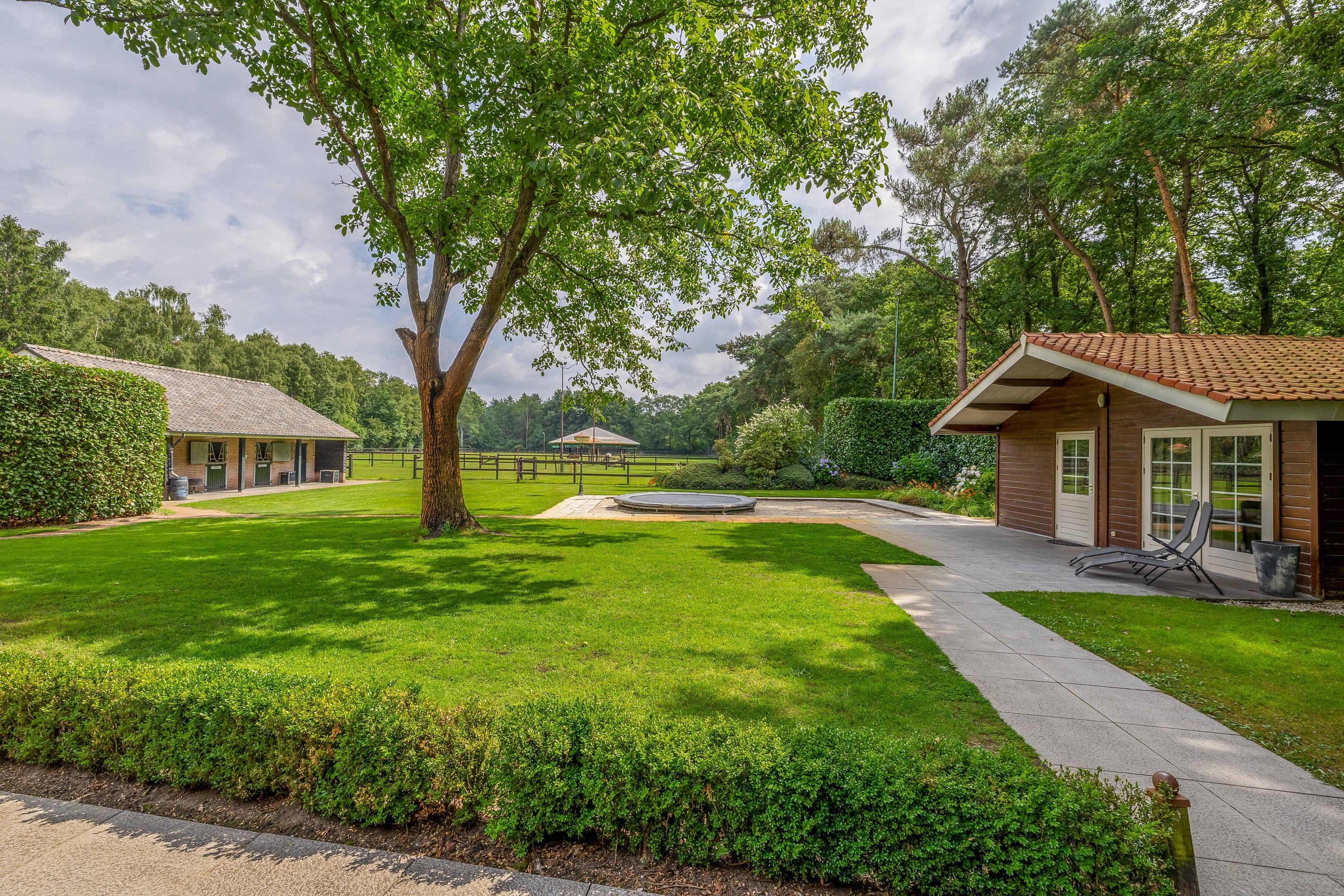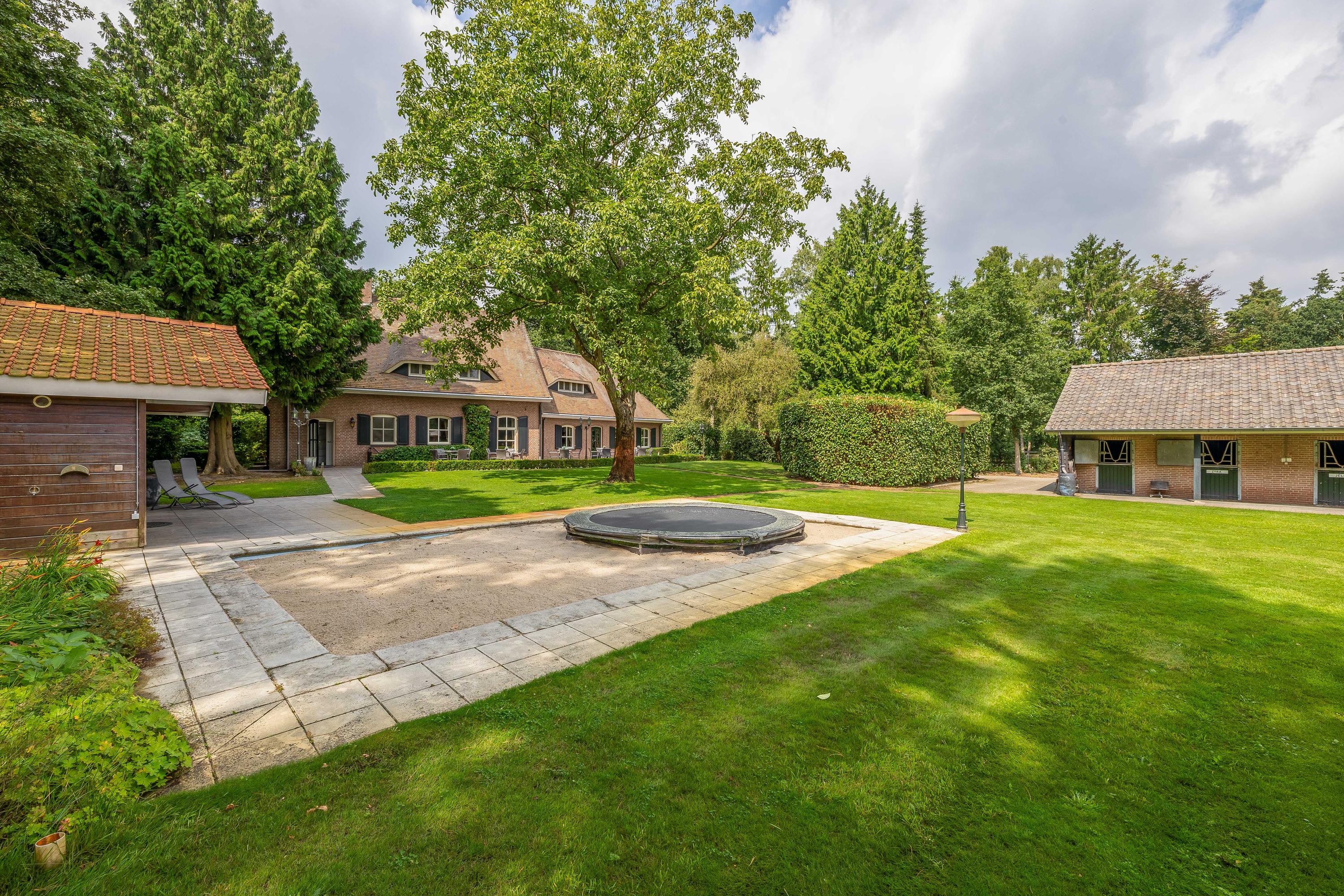 Rondom het woonhuis ligt een fraai aangelegde tuin met groot terras, speelweide, volwassen bomen en beplanting en een prachtig uitzicht over de aangrenzende weilanden. Het aanwezige tuinhuis is ingericht als wellness ruimte met sauna, relaxruimte, badkamer en toilet – een perfecte plek om te ontspannen. Het voormalige zwembad is momenteel ingericht als zandbak met trampoline, maar is eenvoudig weer in ere te herstellen. De tuin sluit naadloos aan op het omliggende privébos, ideaal voor een wandeling of buitenrit op eigen terrein.