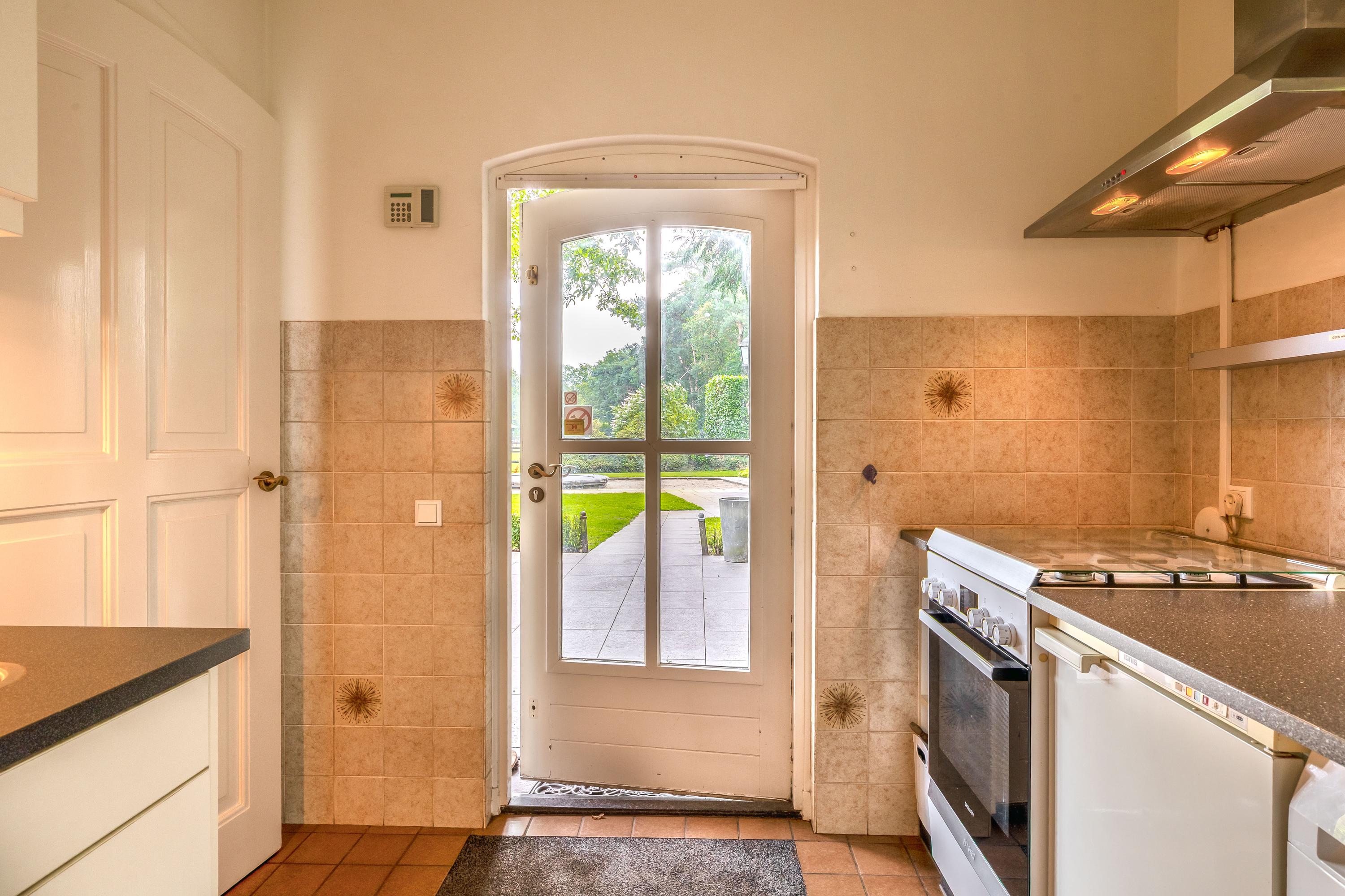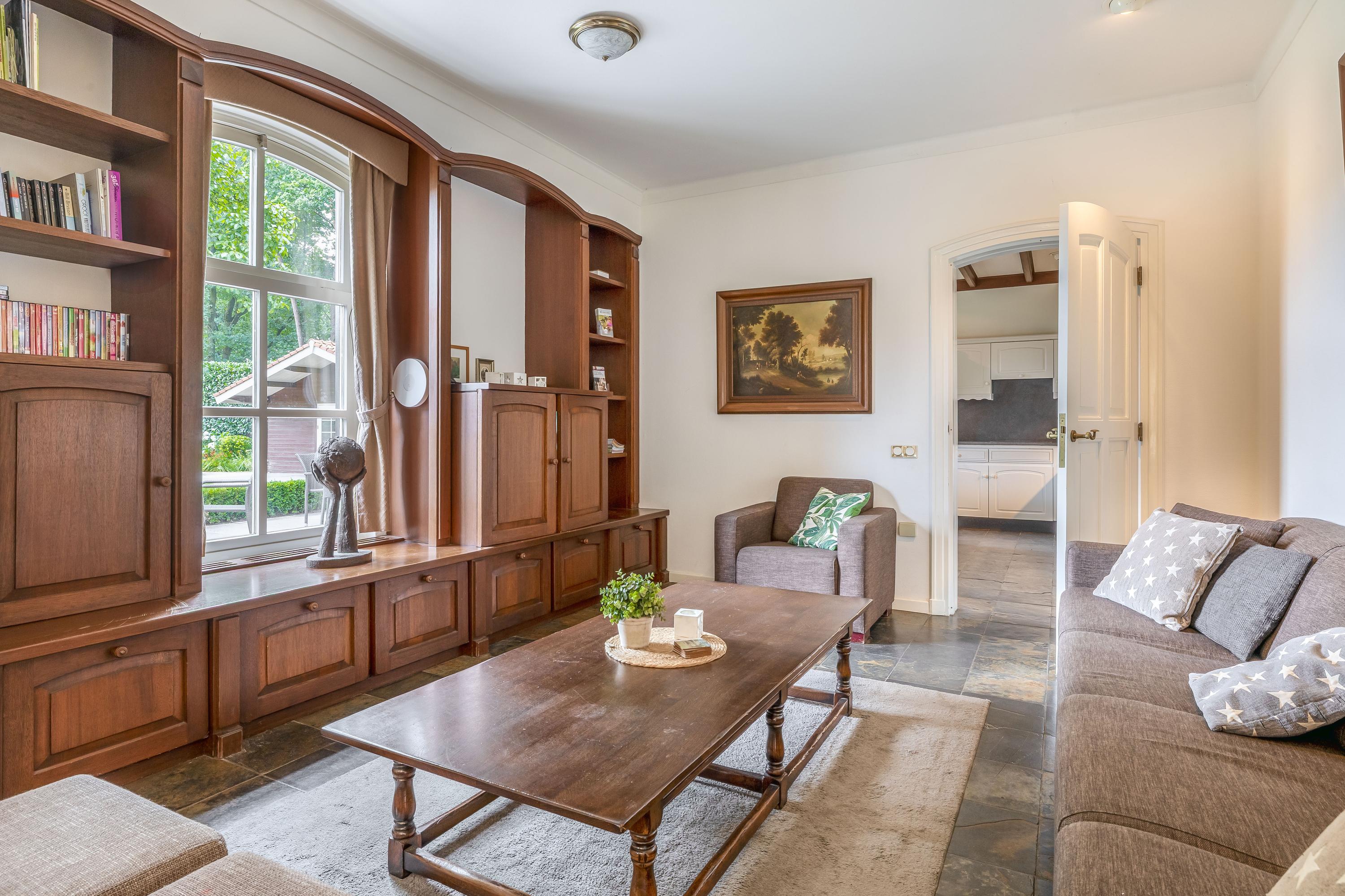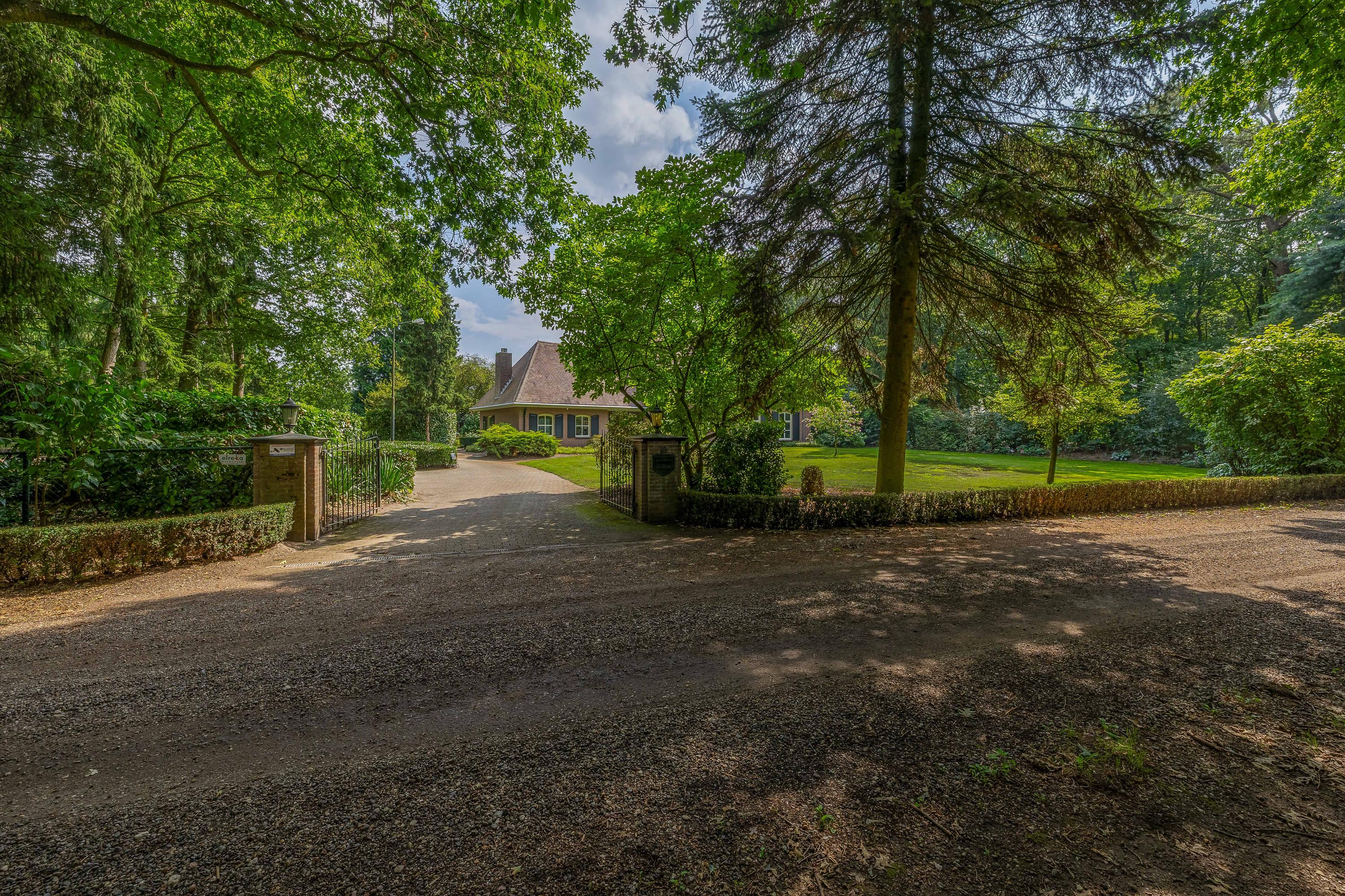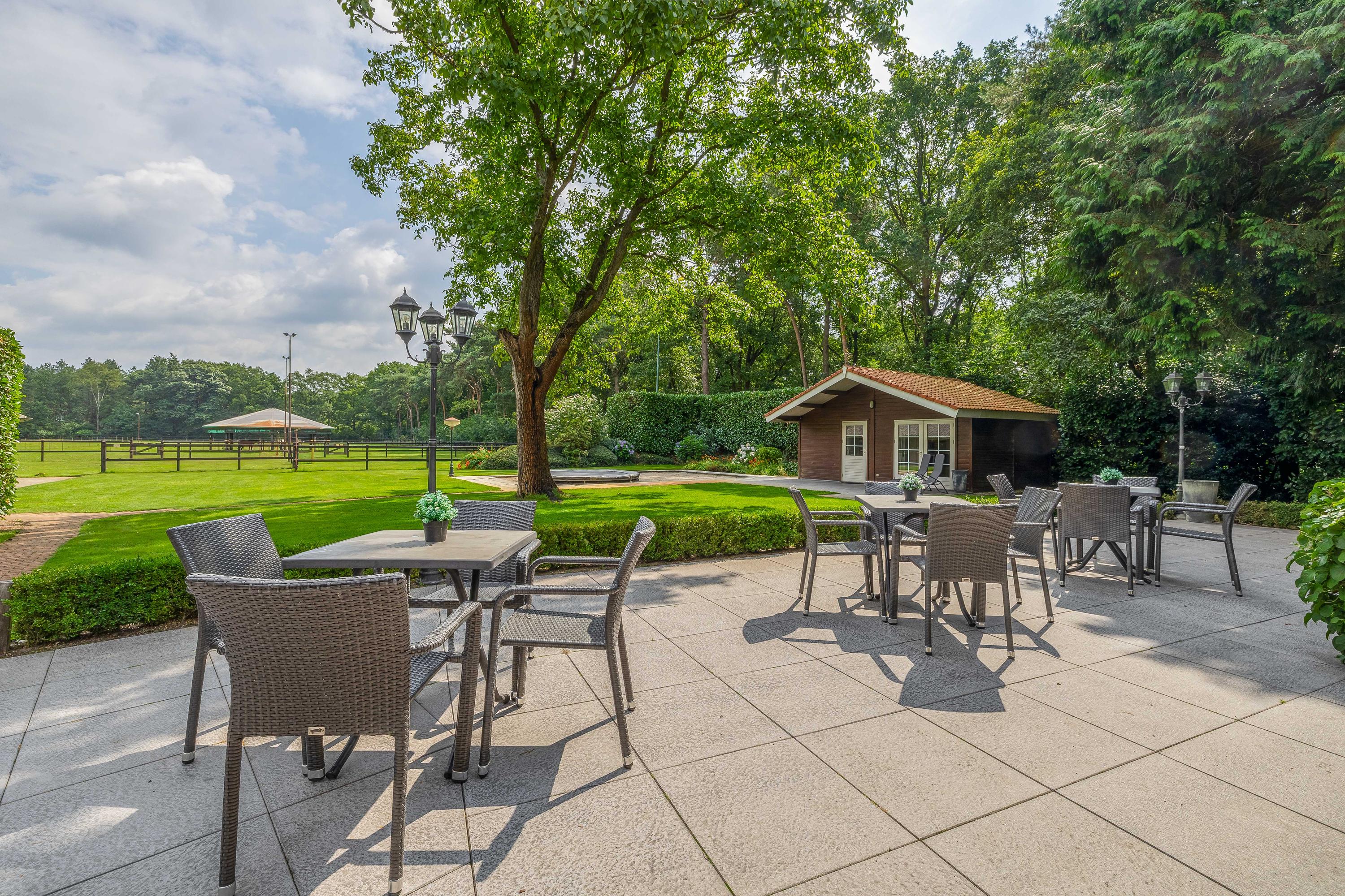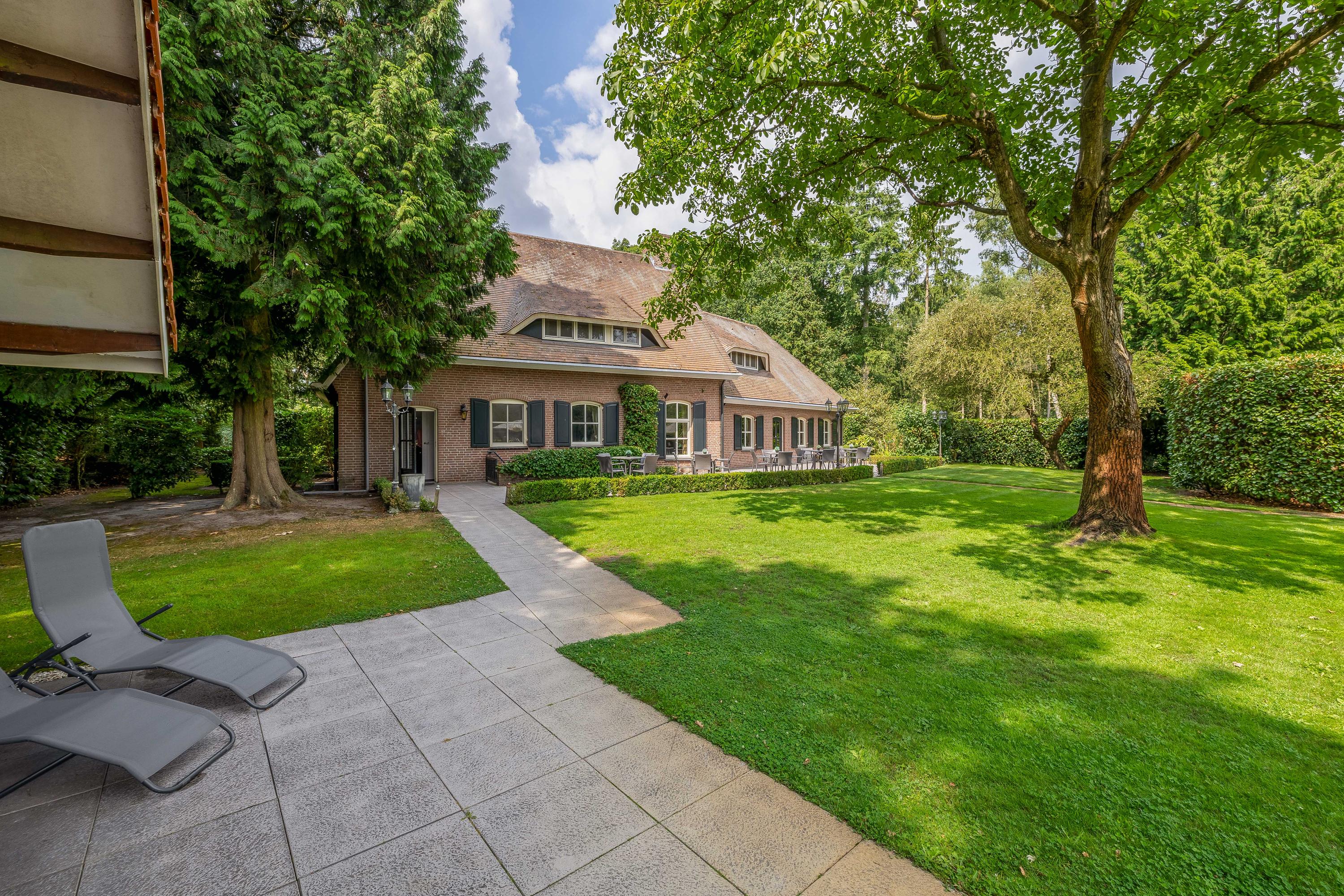 Rondom het woonhuis ligt een fraai aangelegde tuin met groot terras, speelweide, volwassen bomen en beplanting en een prachtig uitzicht over de aangrenzende weilanden. Het aanwezige tuinhuis is ingericht als wellness ruimte met sauna, relaxruimte, badkamer en toilet – een perfecte plek om te ontspannen. Het voormalige zwembad is momenteel ingericht als zandbak met trampoline, maar is eenvoudig weer in ere te herstellen. De tuin sluit naadloos aan op het omliggende privébos, ideaal voor een wandeling of buitenrit op eigen terrein.