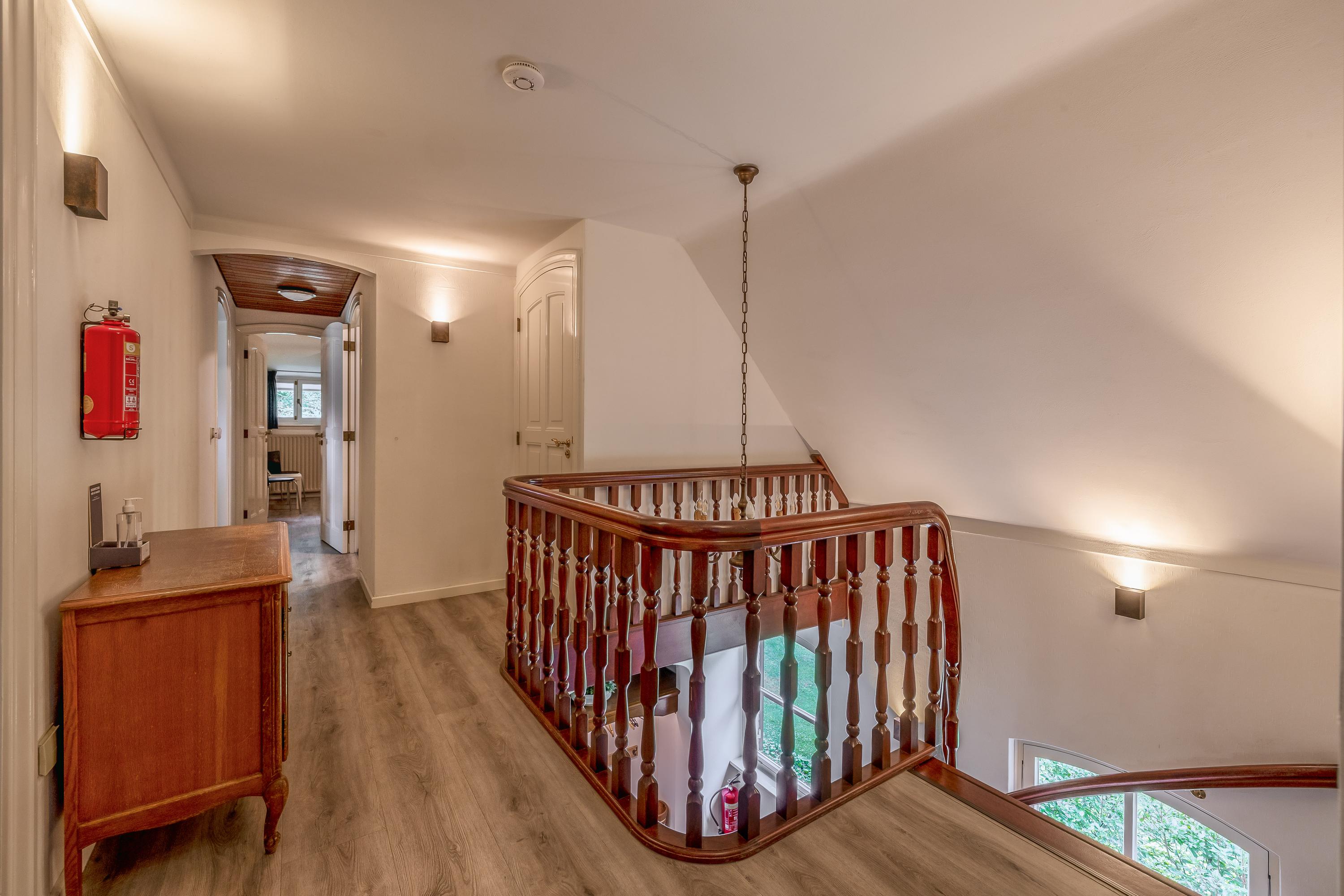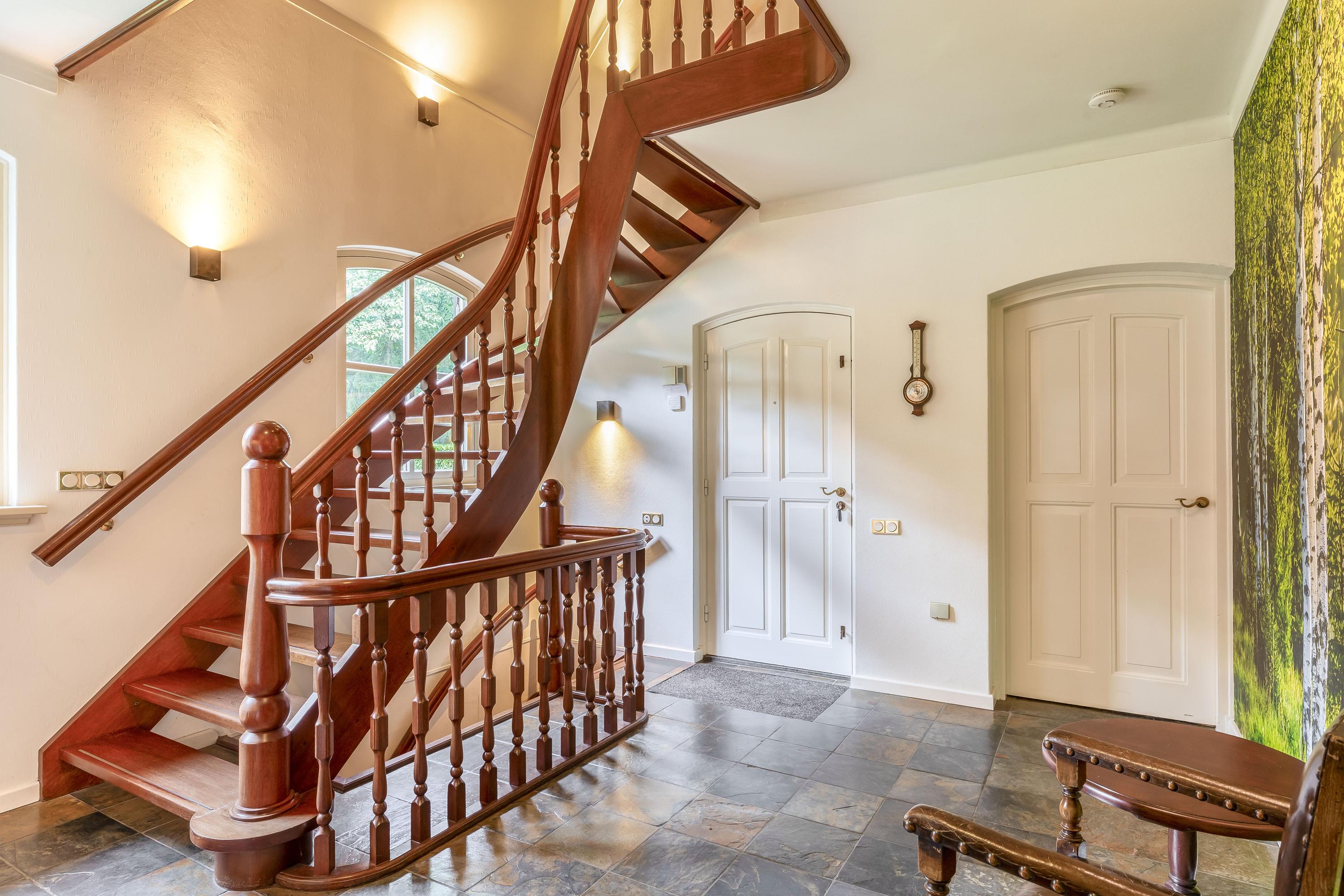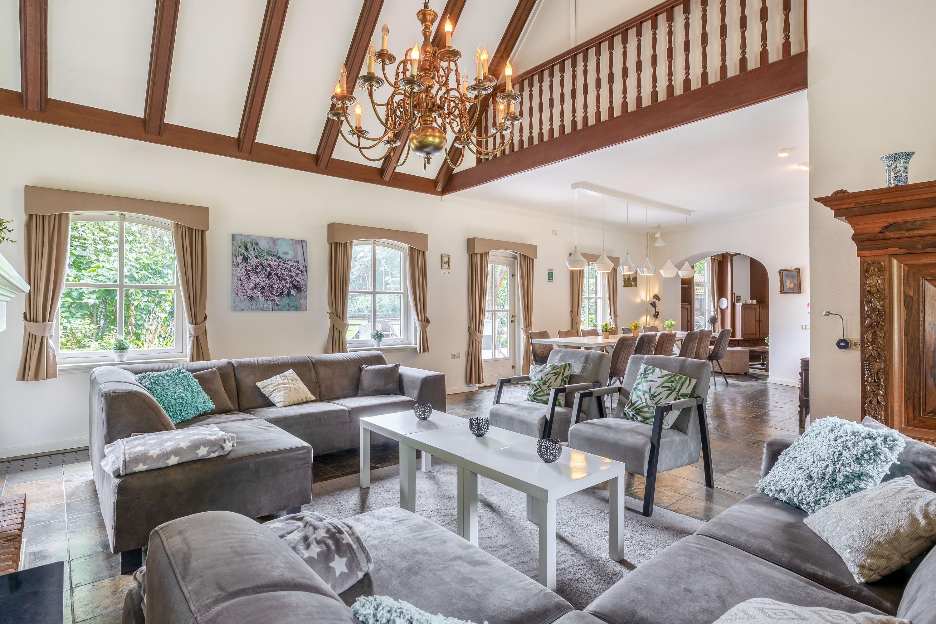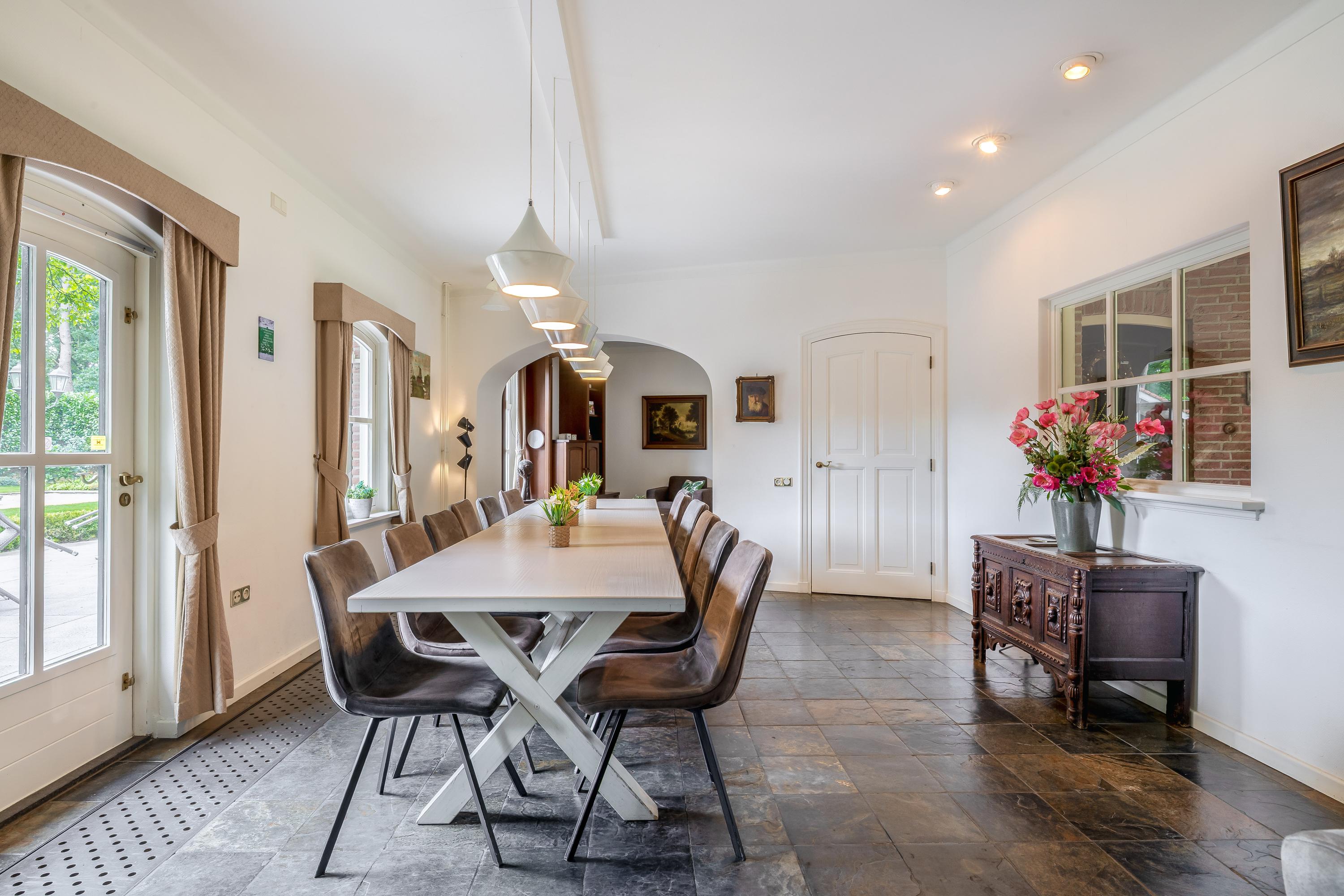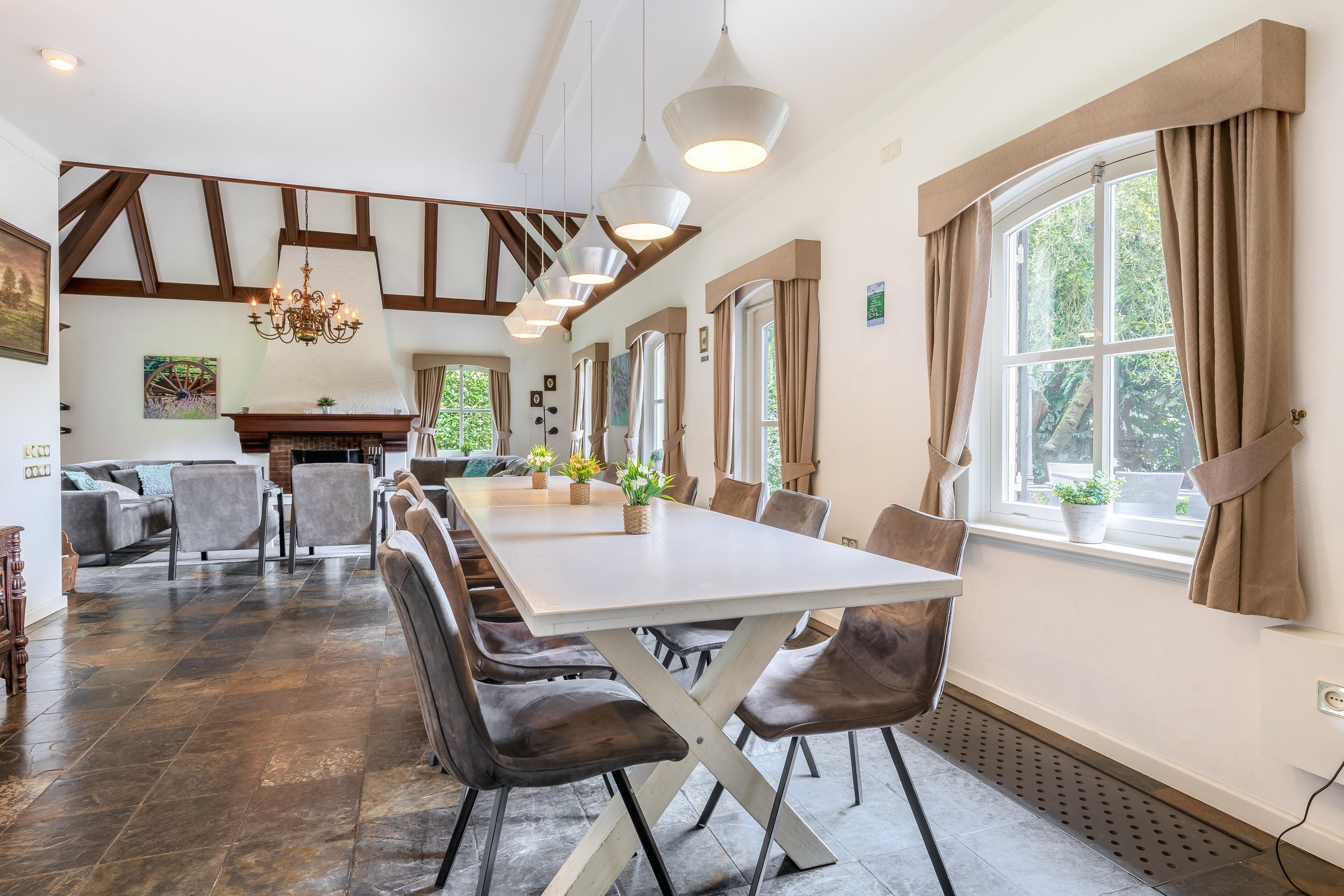 Het landhuis ademt sfeer en comfort. Op de begane grond treft u onder meer een indrukwekkende ontvangsthal met vide, een royale woonkamer met een zithoek met sfeervolle open haard, eetgedeelte en een aparte televisiekamer, een ruime leefkeuken, bijkeuken en een slaapkamer met en-suite badkamer. De authentieke details zoals houten balkenplafonds en natuurstenen vloeren versterken het landelijke karakter. Op de eerste verdieping bevinden zich vier grote slaapkamers, waarvan één met en-suite badkamer, een tweede badkamer en een separaat toilet. Alle kamers zijn voorzien van daglicht, wastafels en twee slaapkamers hebben vaste opbergkasten – ideaal voor gastenverblijf of gezinsbewoning. In het souterrain vindt u nog meer ruimte: een extra slaapkamer, een recreatie-/feest-/hobbyruimte met bar, badkamer, berging, CV-ruimte en aparte ingang naar buiten. Dit maakt het souterrain uitermate geschikt als gastenverblijf of praktijkruimte.
