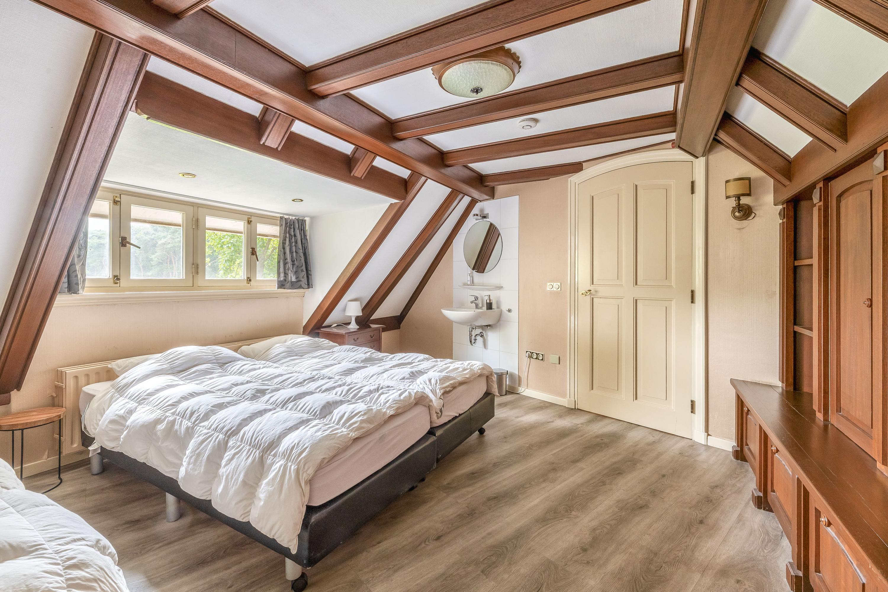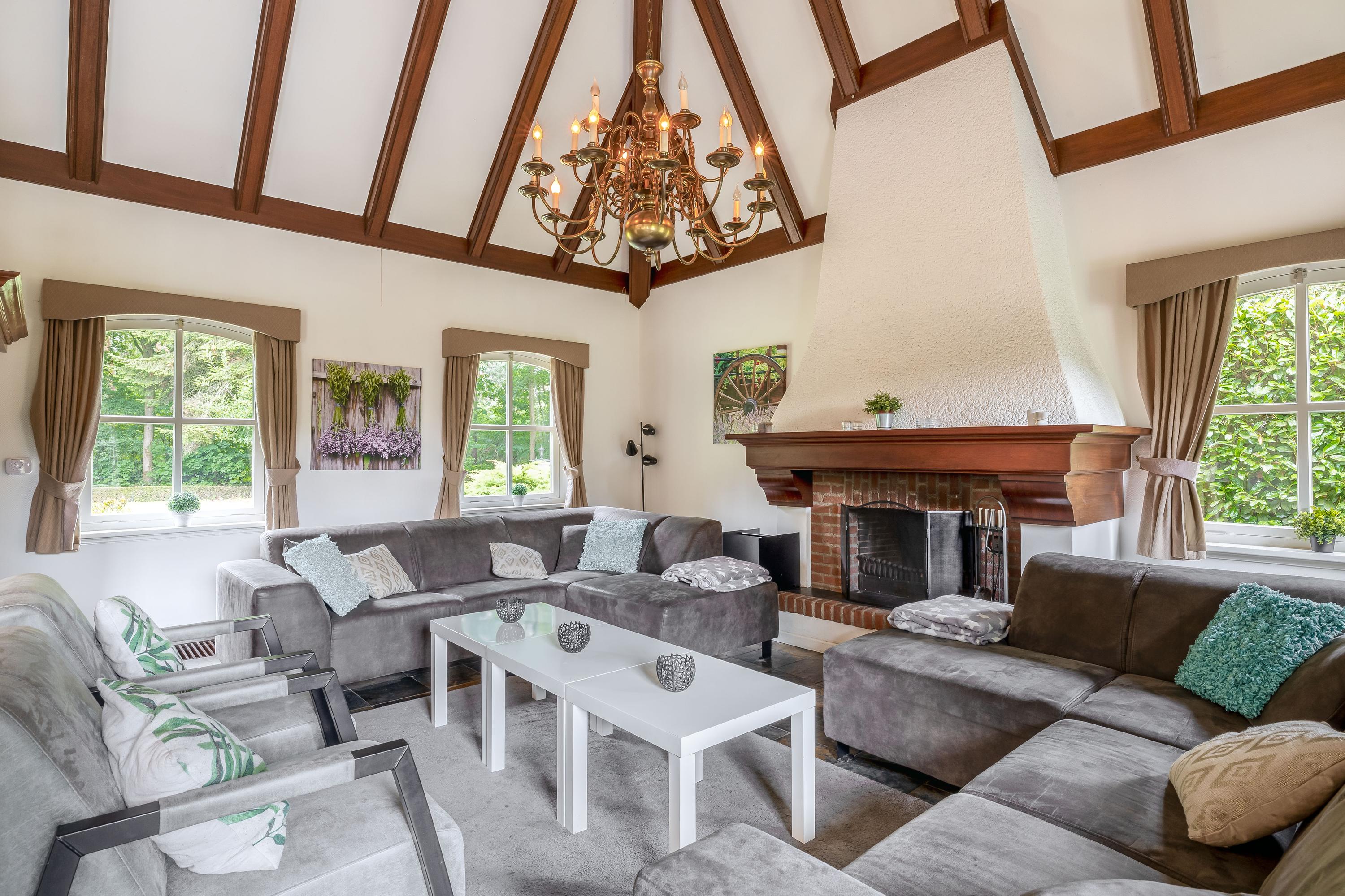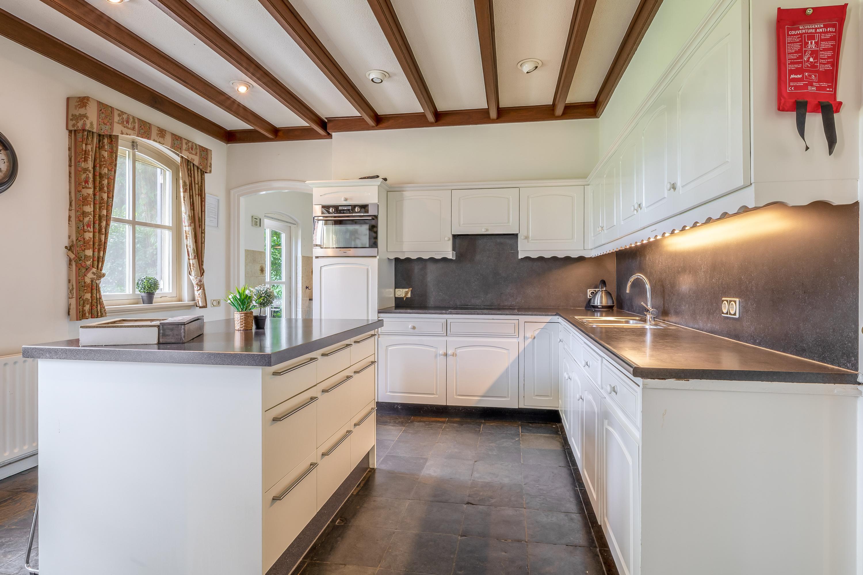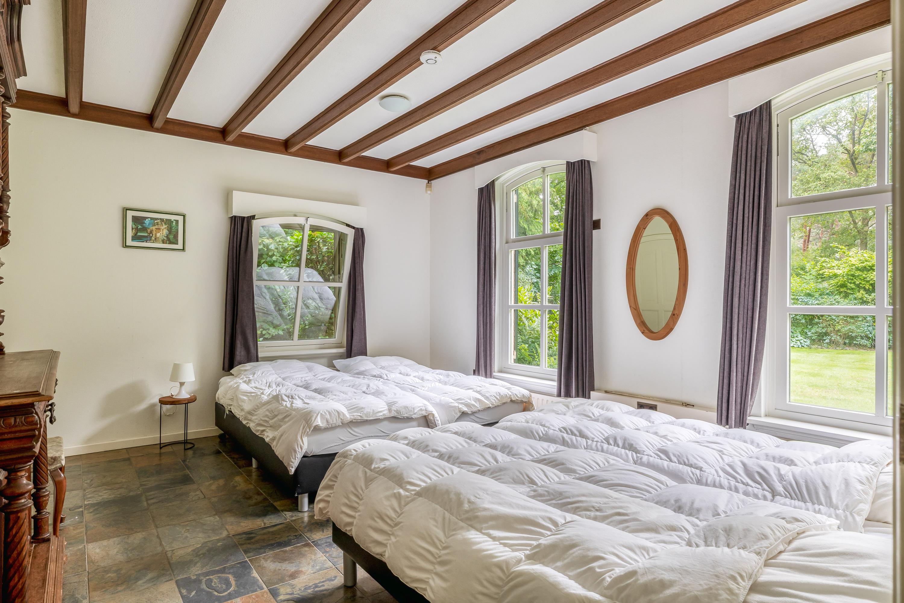 Het landhuis ademt sfeer en comfort. Op de begane grond treft u onder meer een indrukwekkende ontvangsthal met vide, een royale woonkamer met een zithoek met sfeervolle open haard, eetgedeelte en een aparte televisiekamer, een ruime leefkeuken, bijkeuken en een slaapkamer met en-suite badkamer. De authentieke details zoals houten balkenplafonds en natuurstenen vloeren versterken het landelijke karakter. Op de eerste verdieping bevinden zich vier grote slaapkamers, waarvan één met en-suite badkamer, een tweede badkamer en een separaat toilet. Alle kamers zijn voorzien van daglicht, wastafels en twee slaapkamers hebben vaste opbergkasten – ideaal voor gastenverblijf of gezinsbewoning. In het souterrain vindt u nog meer ruimte: een extra slaapkamer, een recreatie-/feest-/hobbyruimte met bar, badkamer, berging, CV-ruimte en aparte ingang naar buiten. Dit maakt het souterrain uitermate geschikt als gastenverblijf of praktijkruimte.