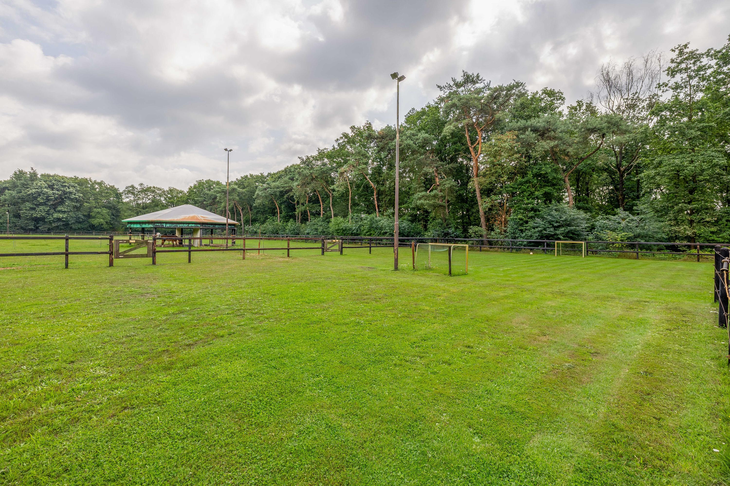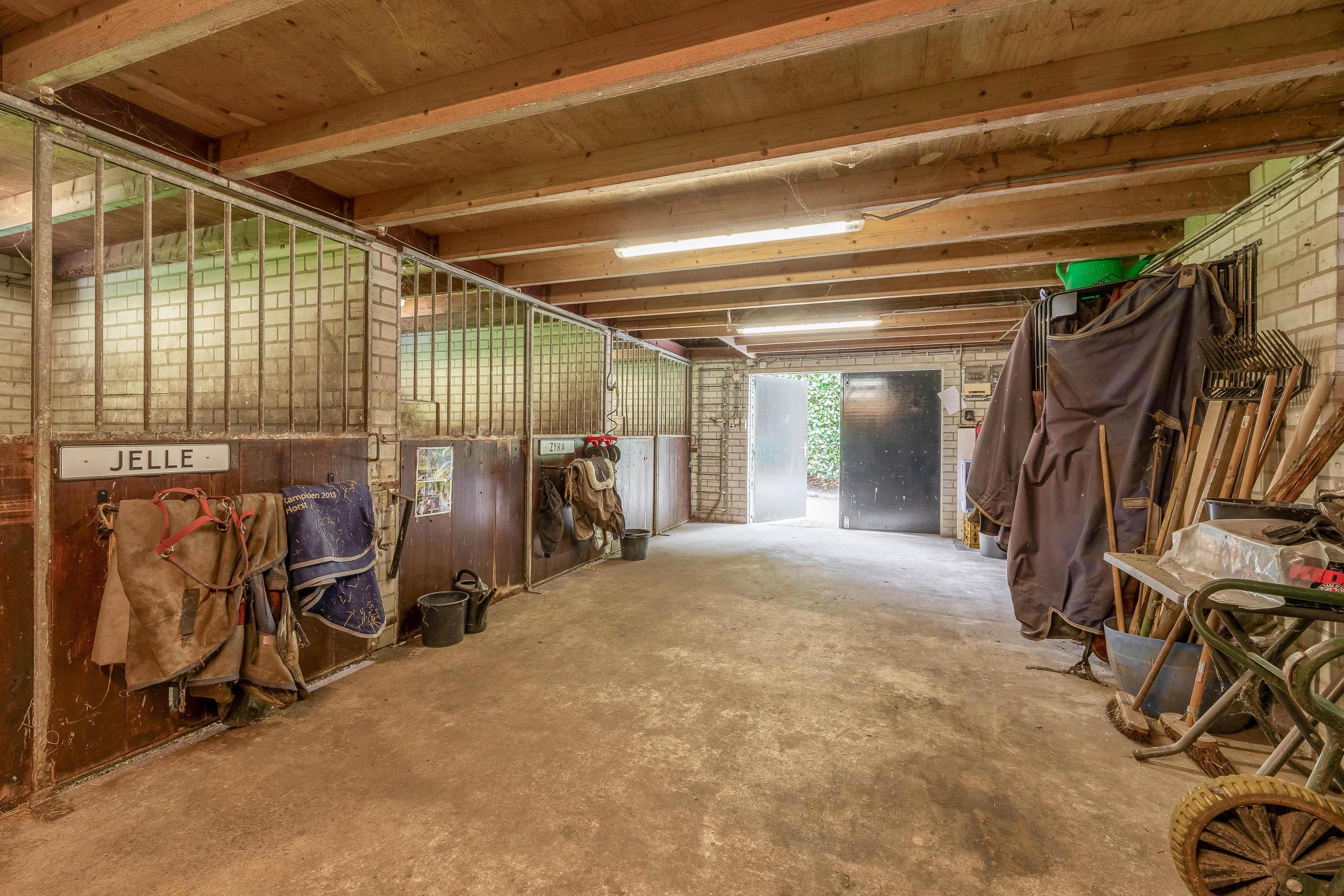 De vrijstaande paardenstal is voorzien van 5 boxen met buitenluiken en weefrekken, een hooizolder, weidegang en extra voorzieningen zoals een schuilstal en een gedraineerde buitenpiste (20 x 40 meter) met professionele bodem. Alles is tot in de puntjes verzorgd, inclusief verlichting, beregening en omheining.