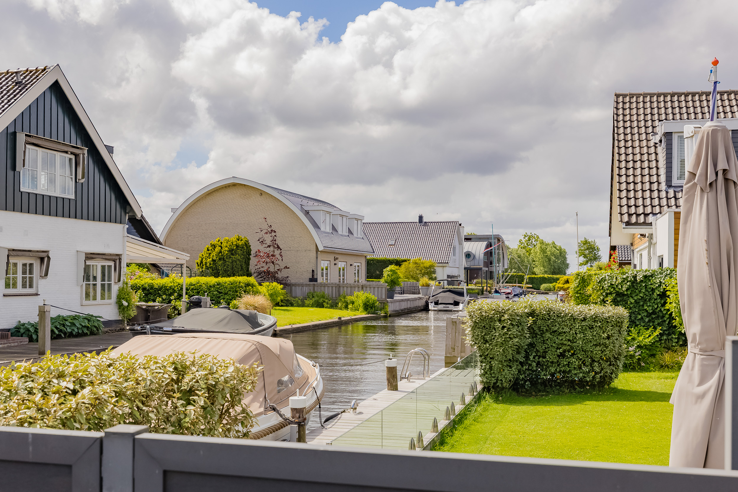 De fraai aangelegde voortuin met hagen, sierpaden en sierhekwerk biedt volop rust en parkeergelegenheid op eigen terrein. Achter de woning ligt het royale kunststof vlonderterras, een heerlijke plek om te ontspannen in de zon of juist in de schaduw. Uw eigen boot legt u eenvoudig aan bij uw eigen steiger – varen wordt zo wel héél verleidelijk. Een handige berging maakt het plaatje compleet.