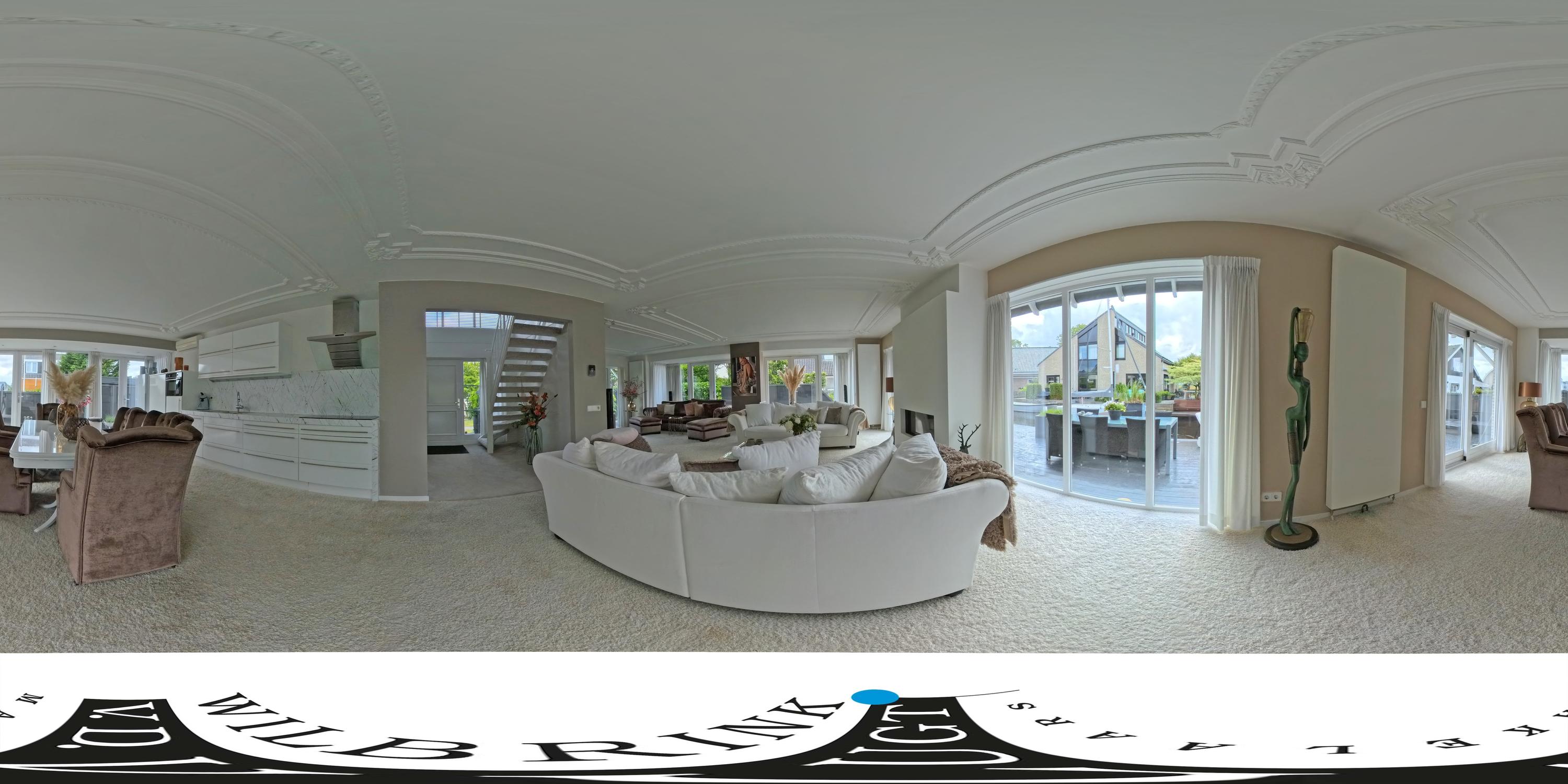 U betreedt de woning via een royale hal met vide en de trap naar boven. Een garderobe-nis met toiletruimte en meterkast zorgen voor een praktische indeling. De woonkamer is ruim, licht en sfeervol en voorzien van een grote erker, klassieke sierlijsten aan het plafond en een gezellige gashaard. Dankzij drie paar dubbele openslaande deuren én een schuifpui staat de living in directe verbinding met het zonnige terras aan het water.
