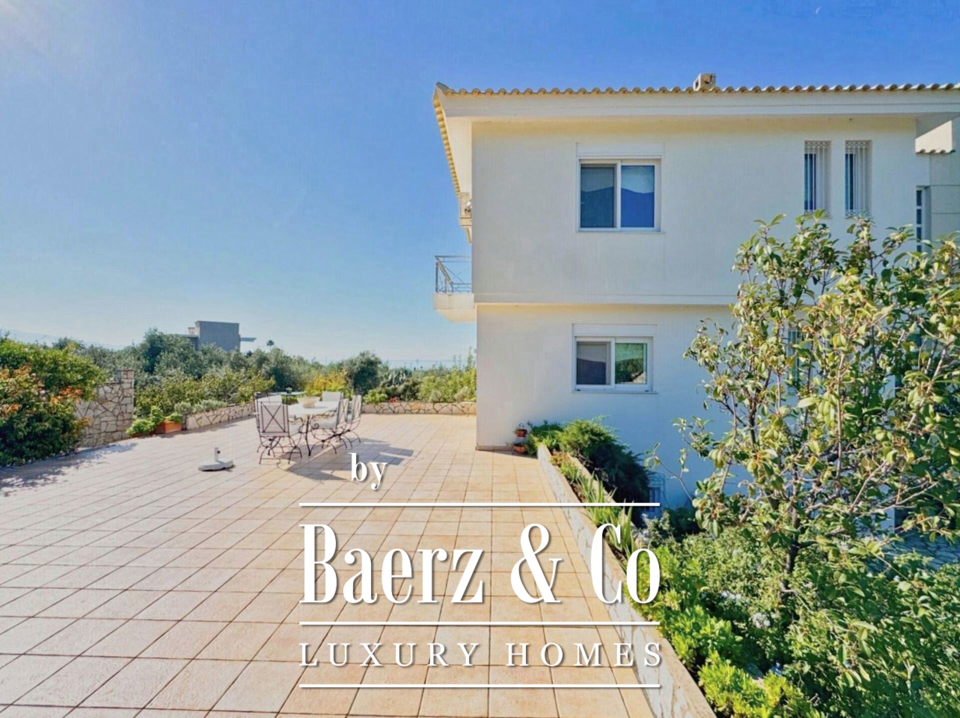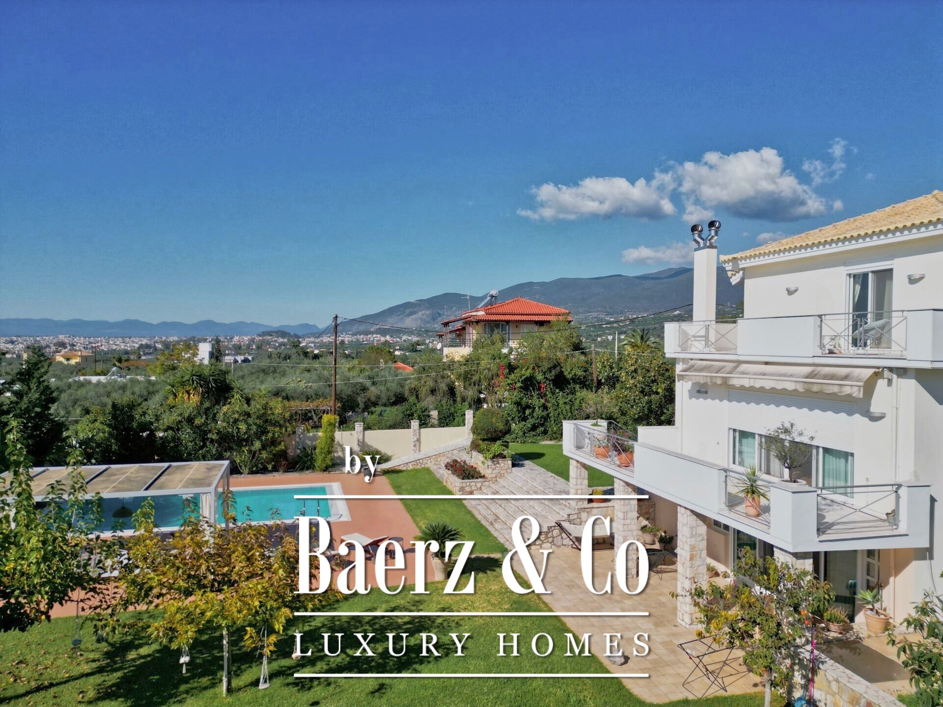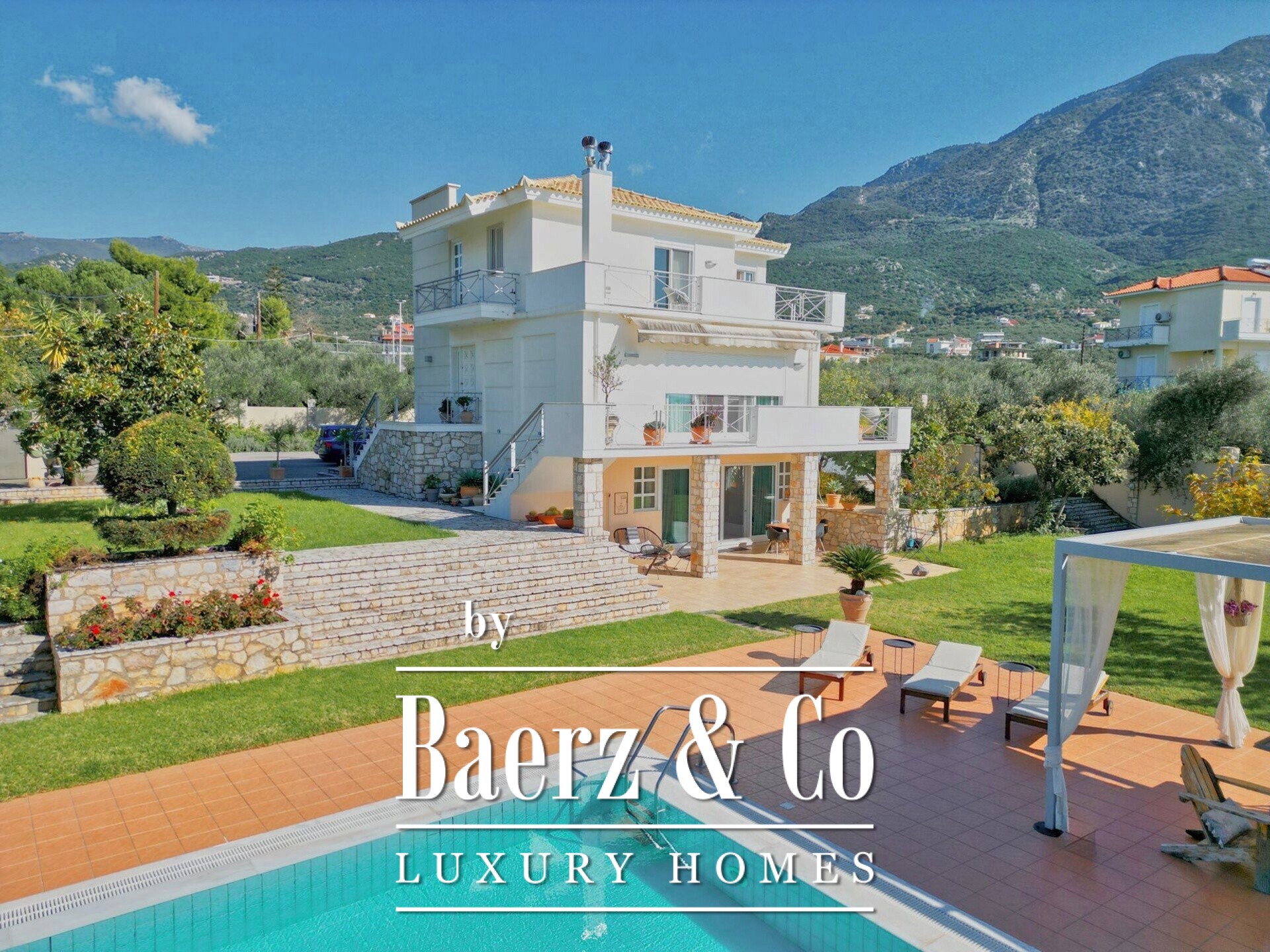 Vrijstaande woning in Kalamata biedt een indrukwekkend gevoel van ruimte en privacy over 370 m² en vier woonlagen. Het perceel van 2.000 m² voorziet in een perfecte balans tussen verfijnd comfort en een adembenemend panoramisch uitzicht op zee en bergen. Buiten nodigen het zwembad, de pergola en de compleet ingerichte barbecuezone uit tot ontspannen middagen of levendige bijeenkomsten, omgeven door weelderige tuinen en volwassen bomen. Er is voldoende parkeergelegenheid en een afgesloten garage, wat comfort en veiligheid waarborgt.