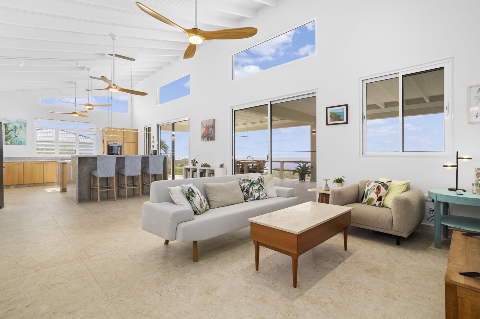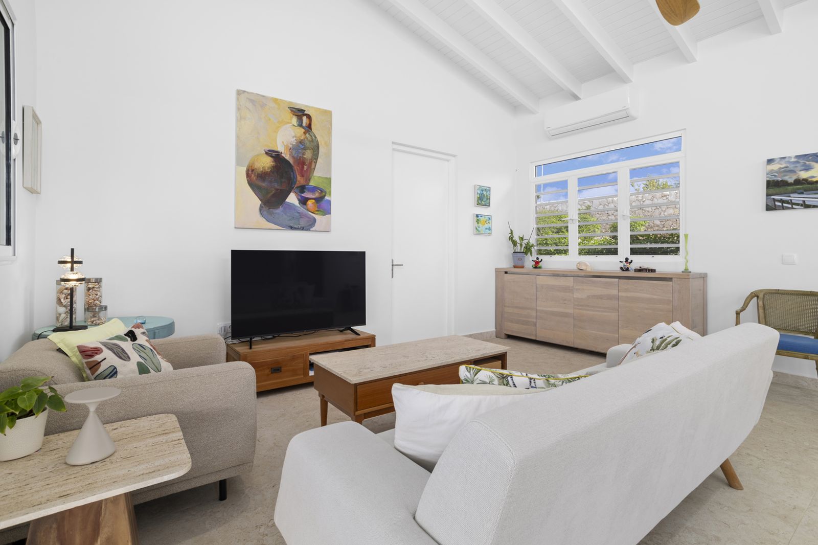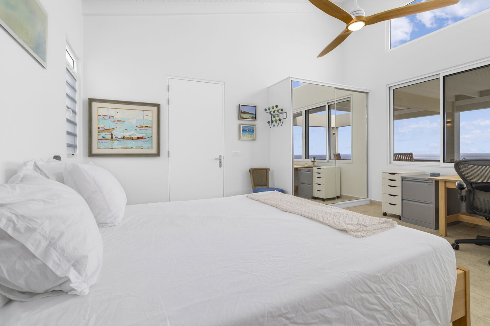 De woonkamer voelt open en luchtig aan en is uitgerust met airconditioning en plafondventilatoren voor optimaal comfort gedurende het hele jaar. De elegante slaapkamer beschikt over grote ramen met uitzicht op het terras en de oceaan, evenals een eigen badkamer met dubbele wastafel en douche.
