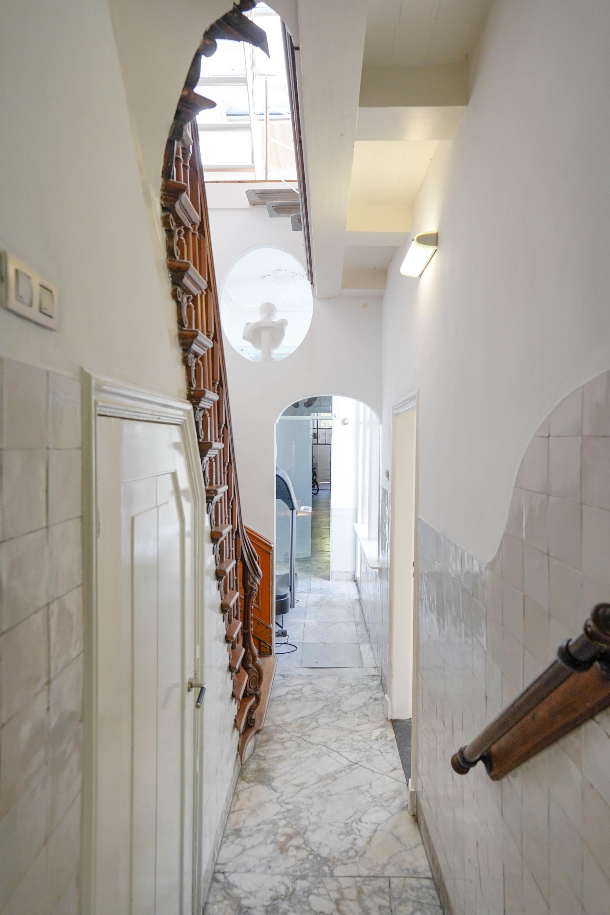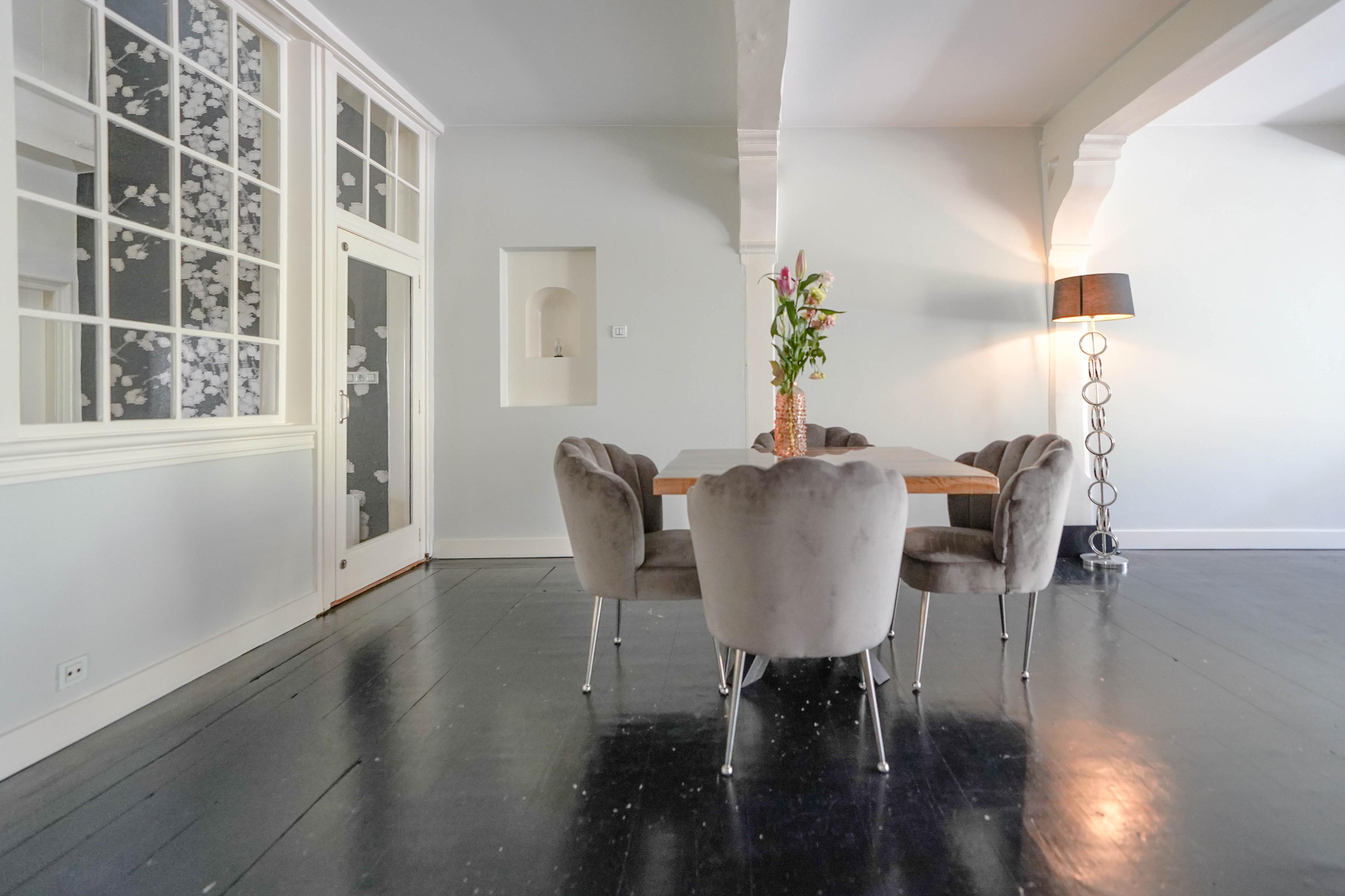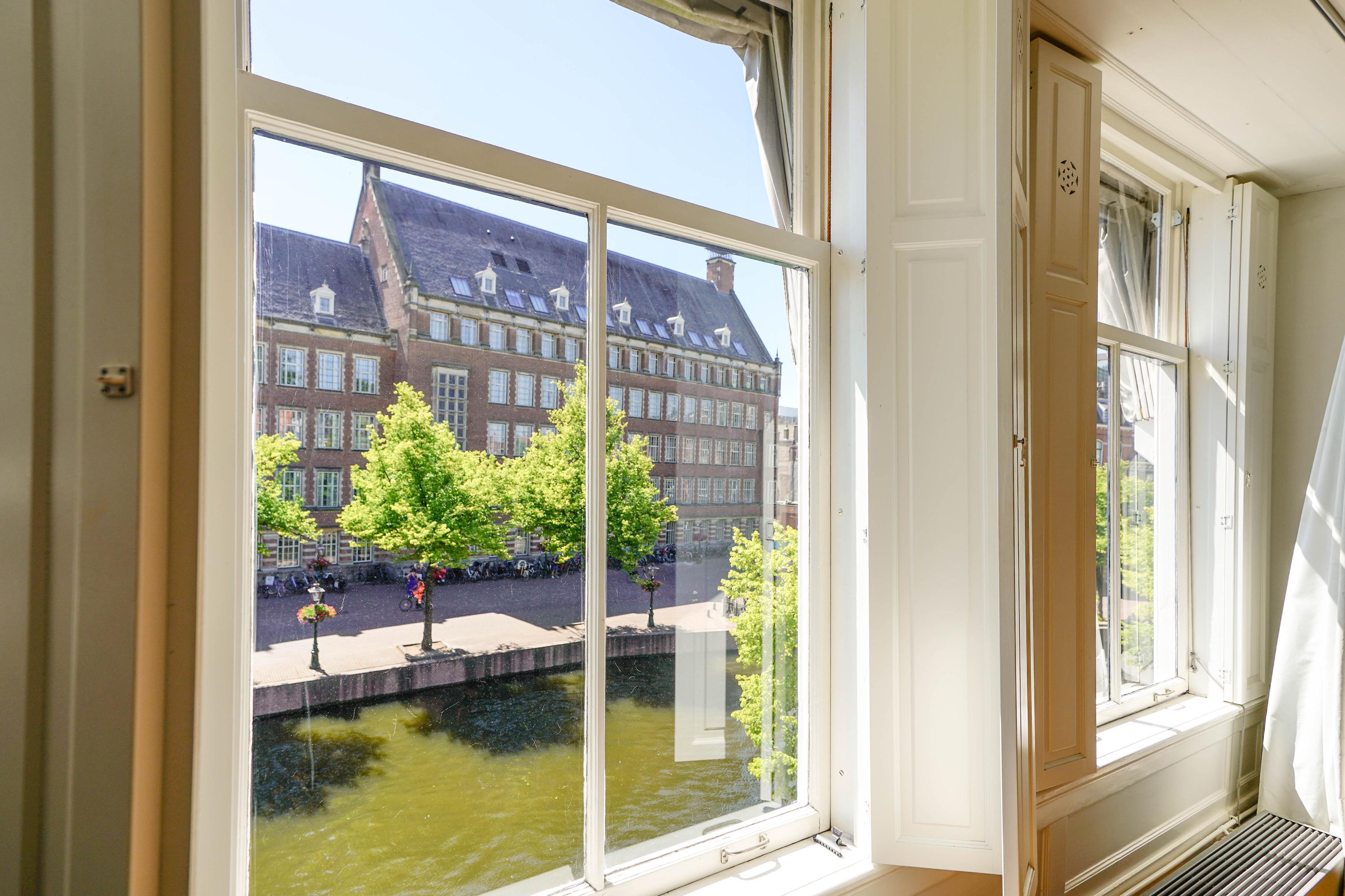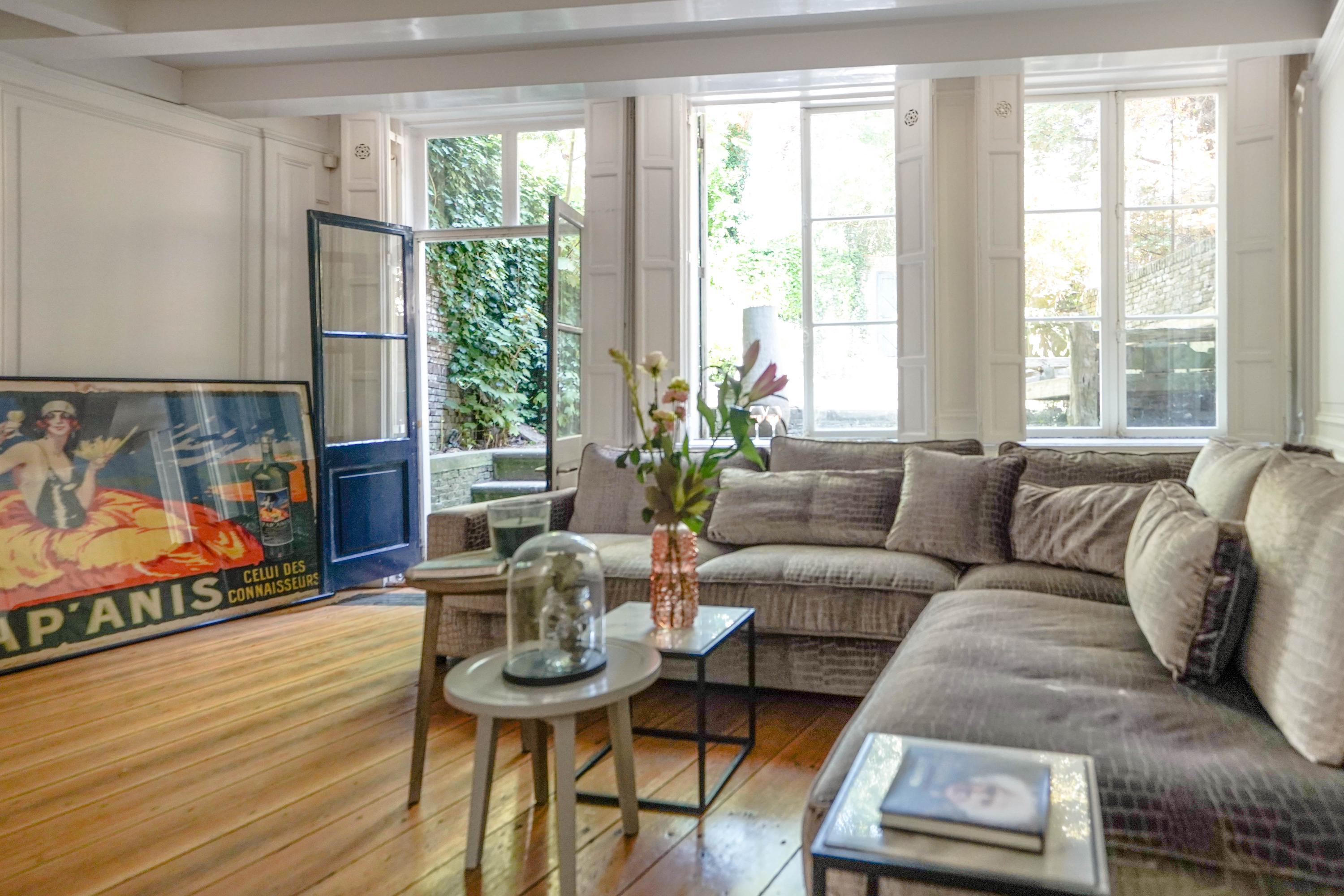 Het achterhuis is gericht op de tuin en de burchtheuvel. Vanuit de verschillende ruimtes zie je het oude onderkomen van de Burggraaf door mooie hoge raampartijen: een 800 jaar oude oase van groen midden in de binnenstad. Hier heeft de huidige eigenaar op de begane grond een tuinkamer met daarbij een extra keuken. Deze heb je ook wel nodig, want om elke keer het hele pand weer door te moeten voor een hapje of drankje als je in de tuin zit is wel wat veel gevraagd. Het zijn nogal afstanden die je hier kan afleggen. Op de 1e etage bevindt zich nu een tweede woonkamer. met hoge plafonds, een haard en het beste zicht op de Burcht. Het zou ook een heerlijk kantoor of een bibliotheek kunnen zijn. Boven is een apart gastenverblijf met eigen badkamer en wc. Een au pair zou hier ook een heel fijn plekje kunnen hebben.