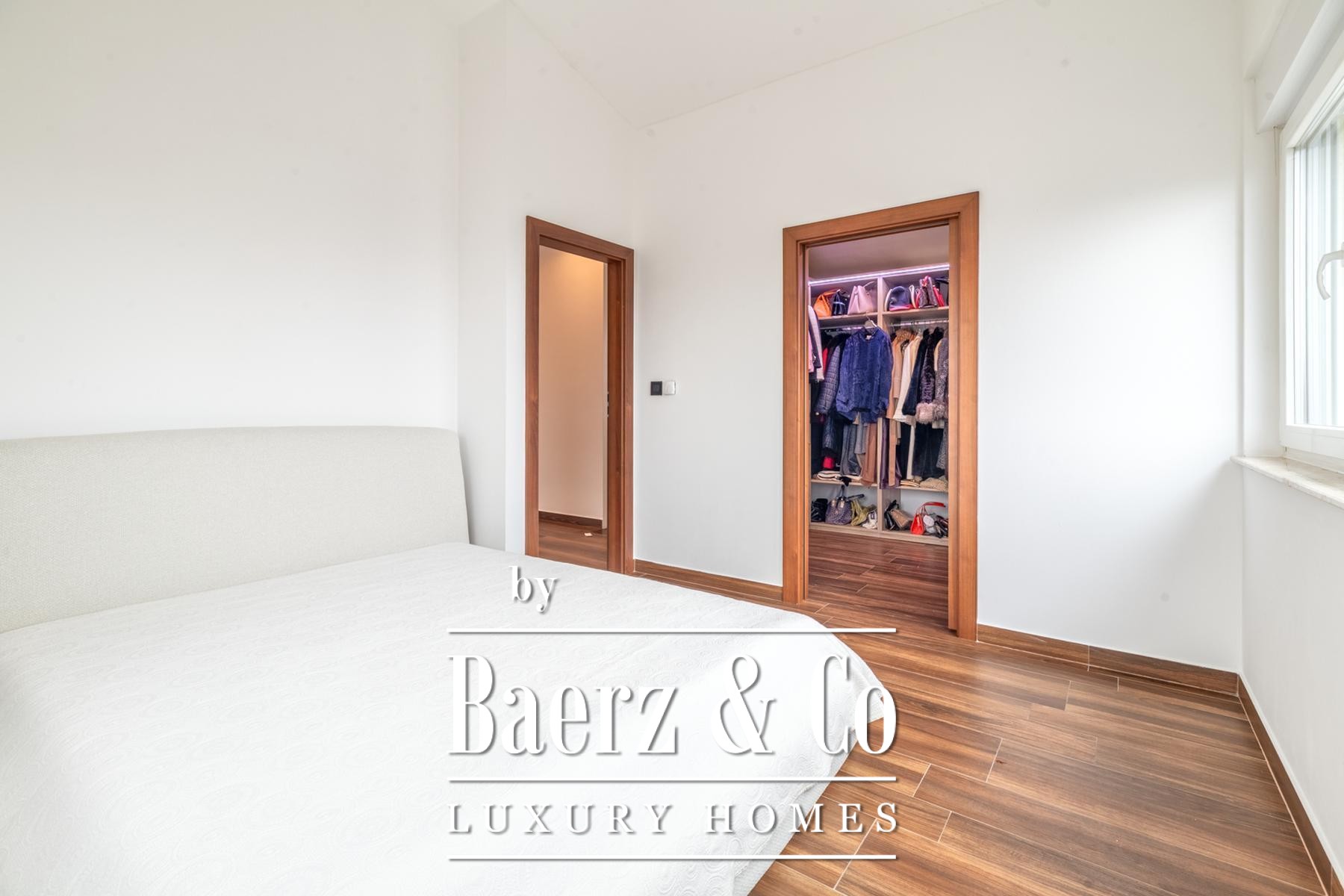 Het interieur getuigt van doordachte architectonische keuzes: een open woon- en eetruimte sluit naadloos aan op het grote terras, terwijl de keuken met bijkeuken en drie slaapkamers het hoofdniveau verankeren. Twee badkamers en een wasruimte zorgen voor praktisch gezinscomfort. Boven is de zolderverdieping ingericht met een slaapkamer, een garderobe en een woonkamer die toegang biedt tot een overdekt terras voor rust en ontspanning.