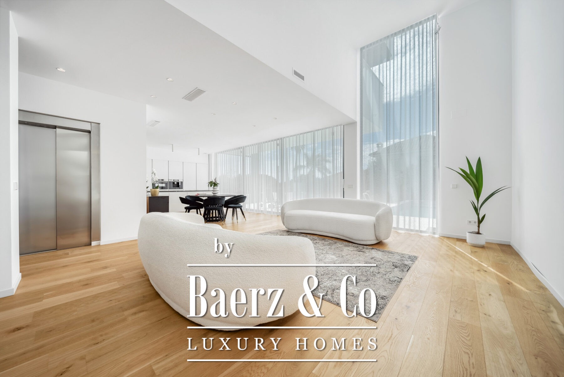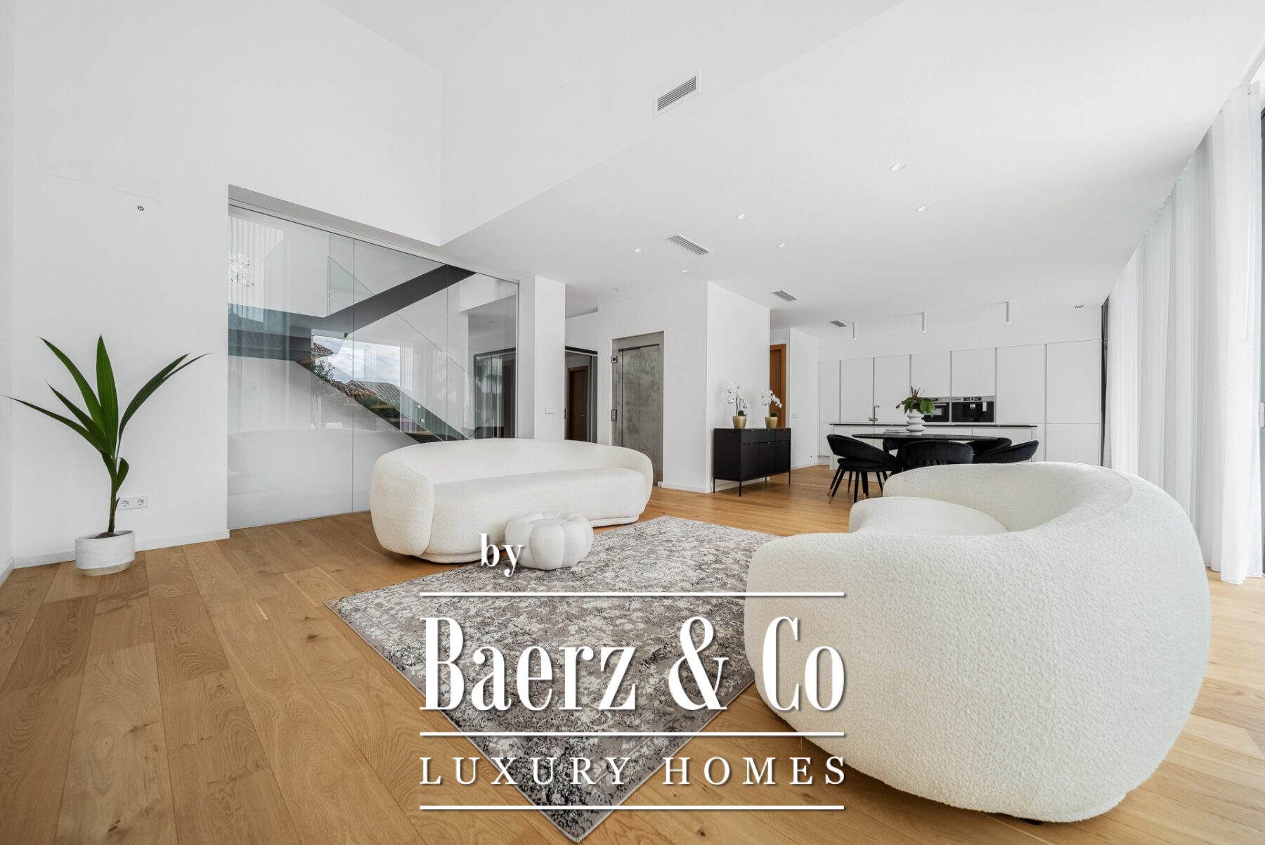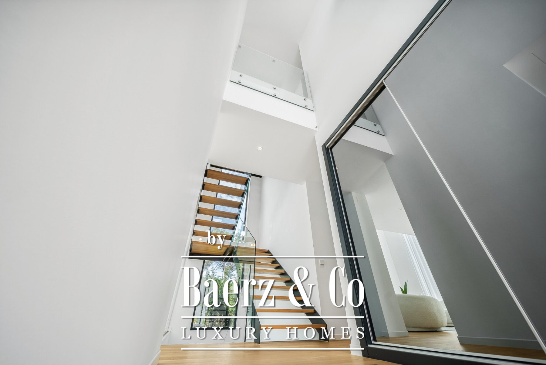 De hoofdverdieping is een open ruimte waar wonen en dineren naadloos samenvloeien met een op maat gemaakte keuken, uitgerust met hoogwaardige apparatuur voor bescheiden verfijning. De terrassen sluiten natuurlijk aan op het interieur en bieden diverse plekken voor dineren in de buitenlucht of rustgevende ontspanning. Het zwembad in de tuin vormt een sereen middelpunt, omringd door strakke, moderne details.