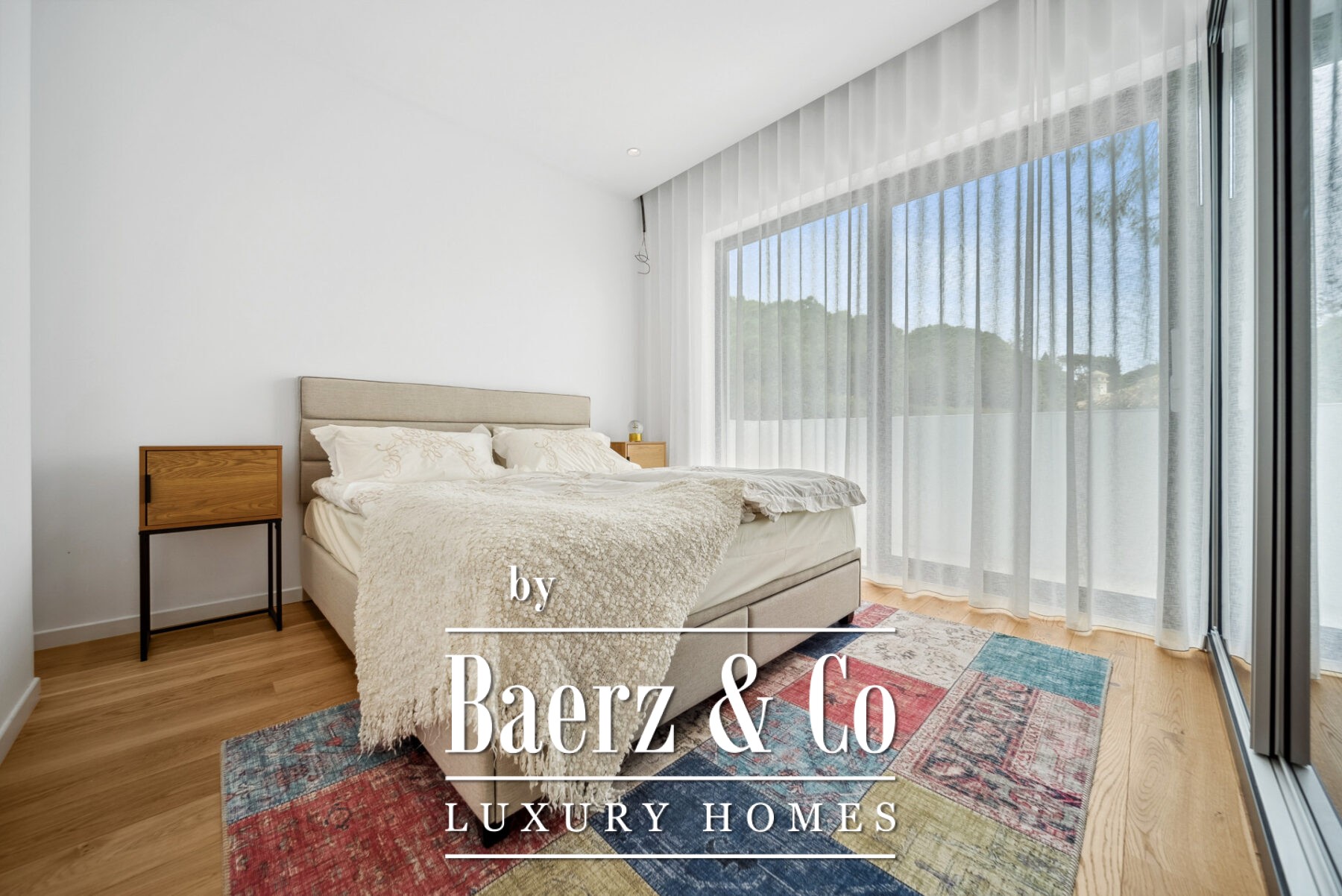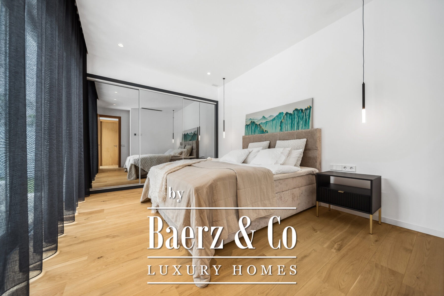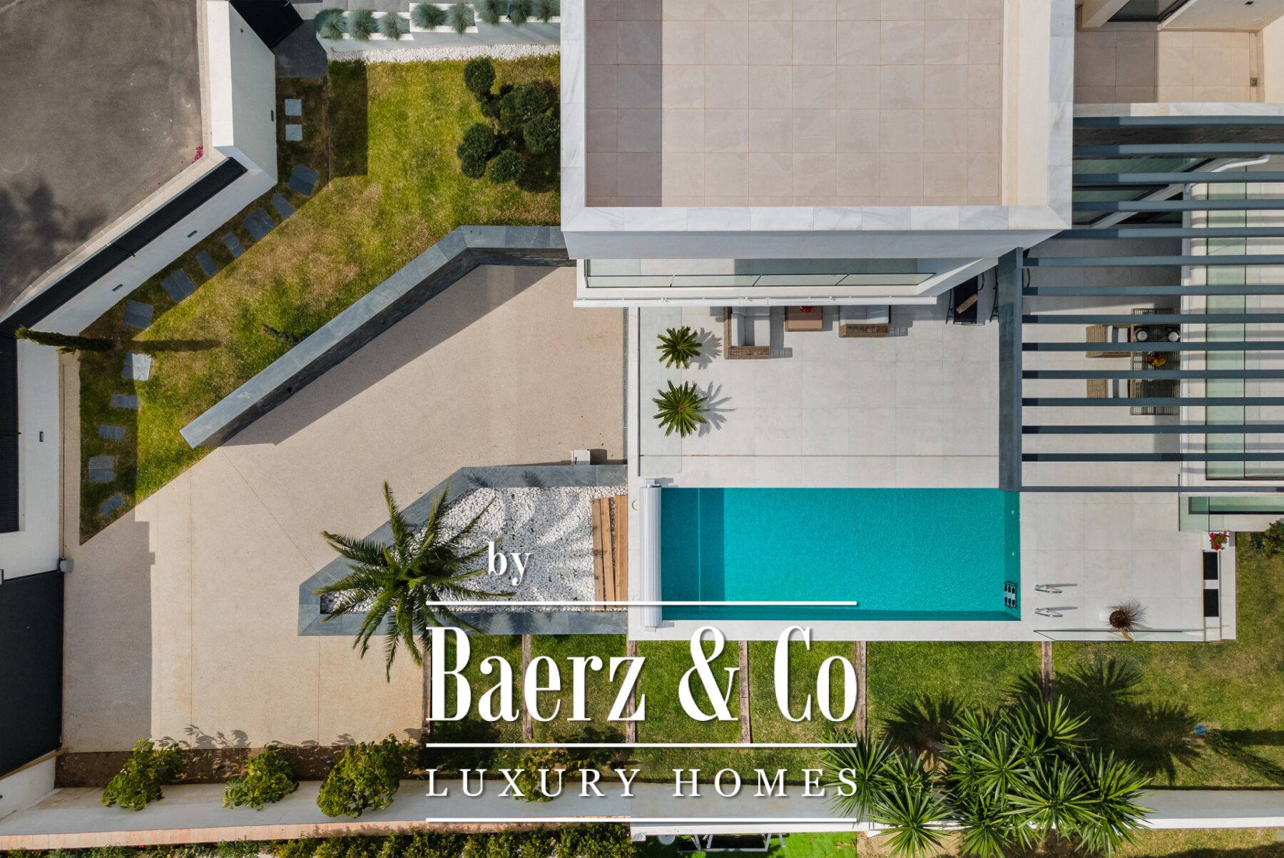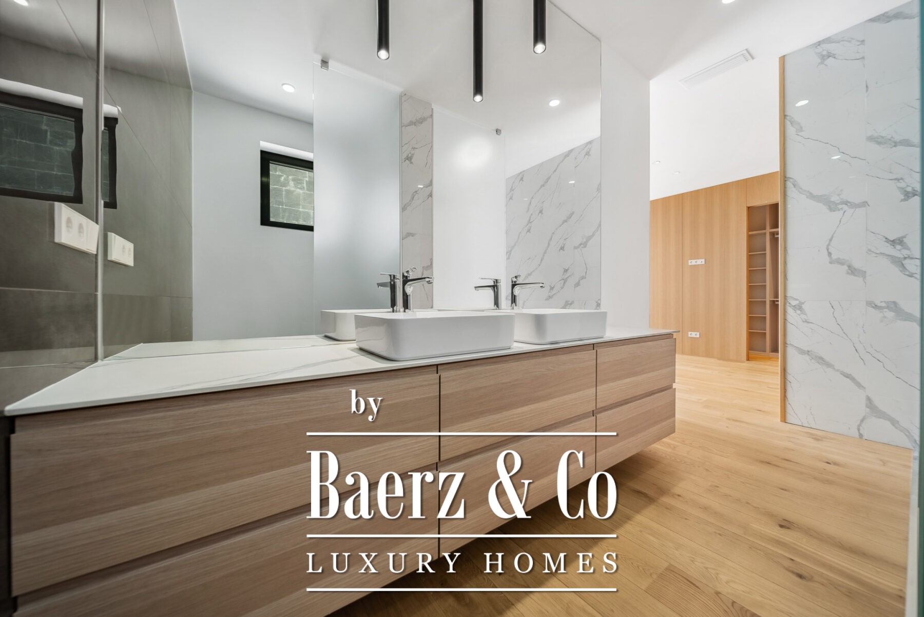 De hoofdverdieping is een open ruimte waar wonen en dineren naadloos samenvloeien met een op maat gemaakte keuken, uitgerust met hoogwaardige apparatuur voor bescheiden verfijning. De terrassen sluiten natuurlijk aan op het interieur en bieden diverse plekken voor dineren in de buitenlucht of rustgevende ontspanning. Het zwembad in de tuin vormt een sereen middelpunt, omringd door strakke, moderne details.