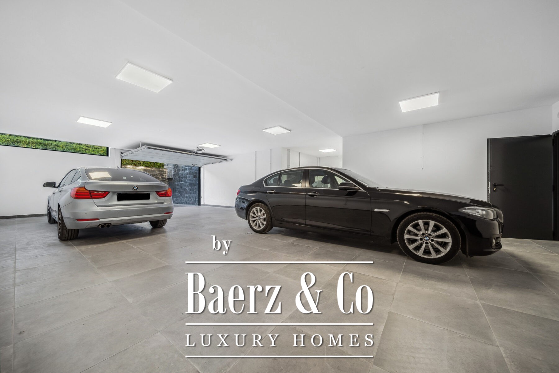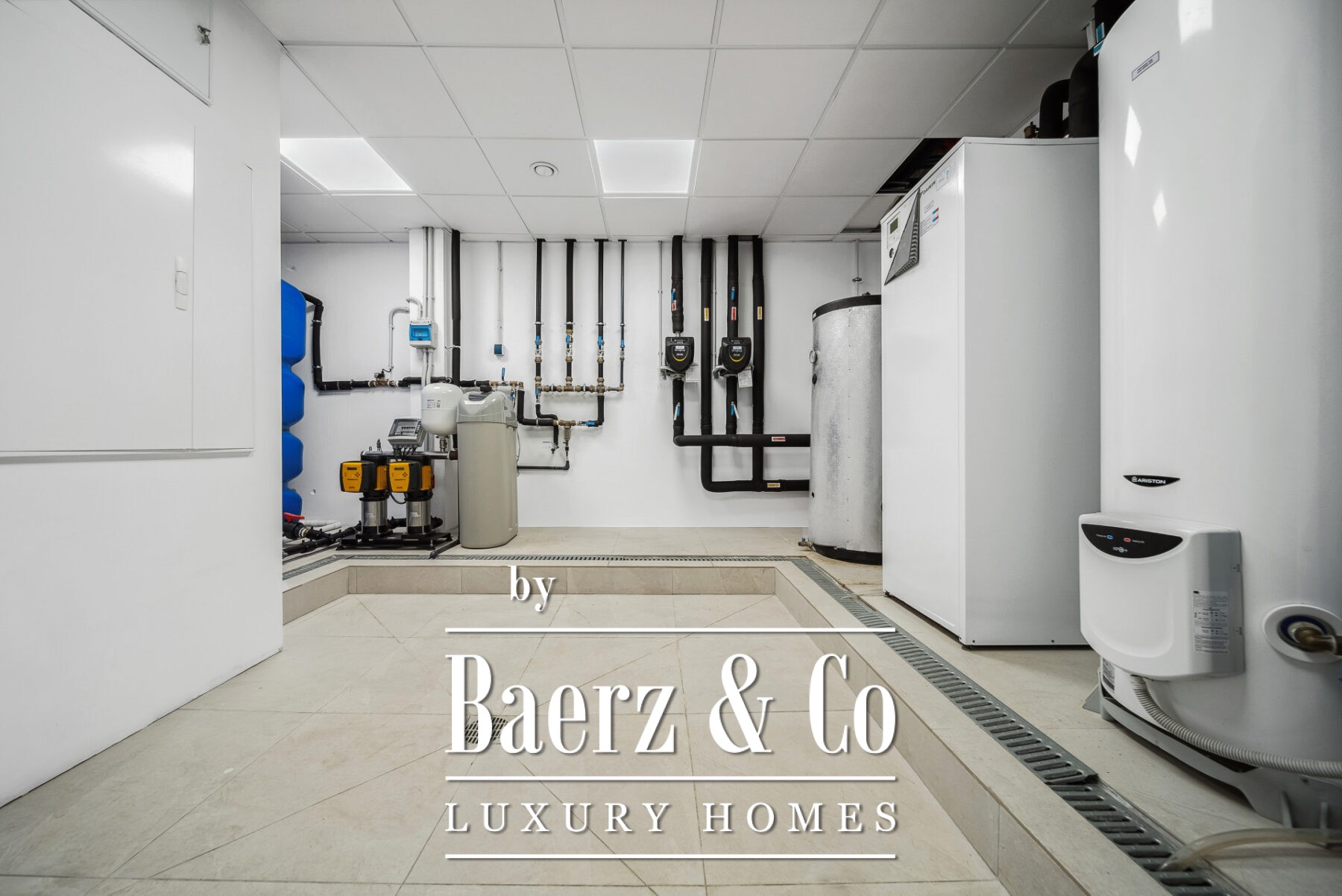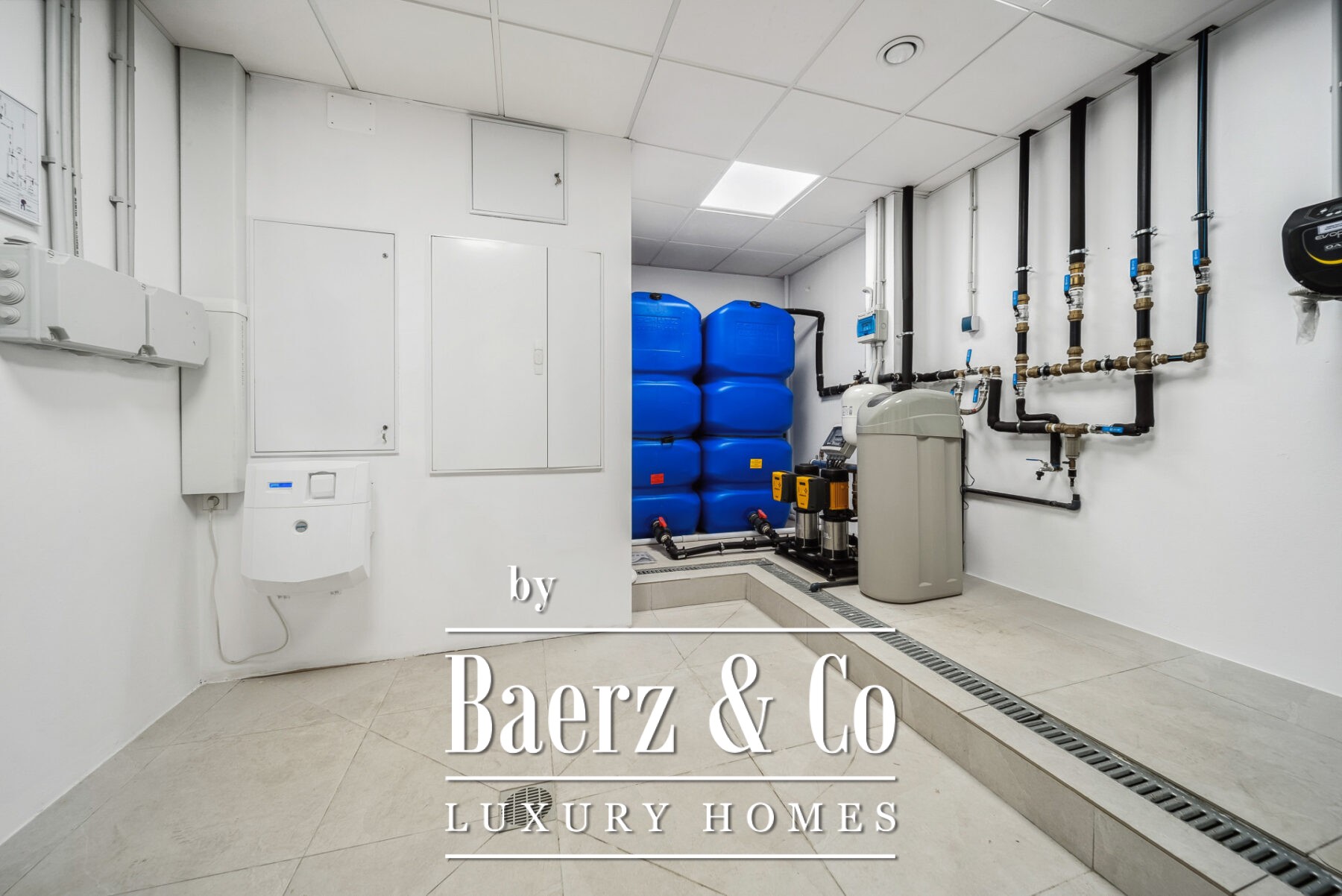 Voorzieningen zoals vloerverwarming, individueel regelbare klimaatbeheersing en een privé lift verbinden de drie verdiepingen. De bovenste etage is ingericht als solarium met panoramisch uitzicht over zee en de omliggende bergen. Er is een garage voor drie auto's en extra faciliteiten zoals een sauna en een speciale BBQ-plek.