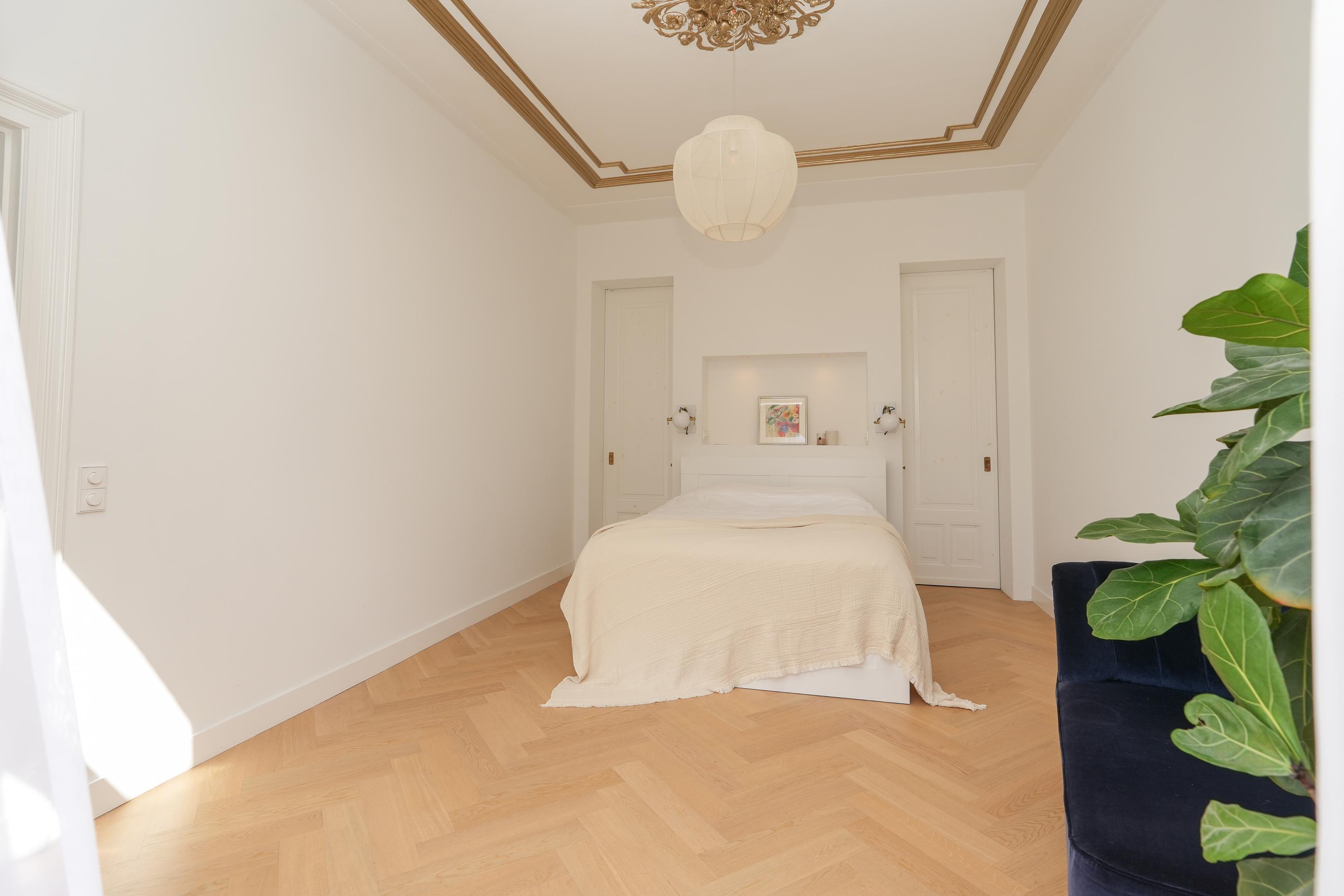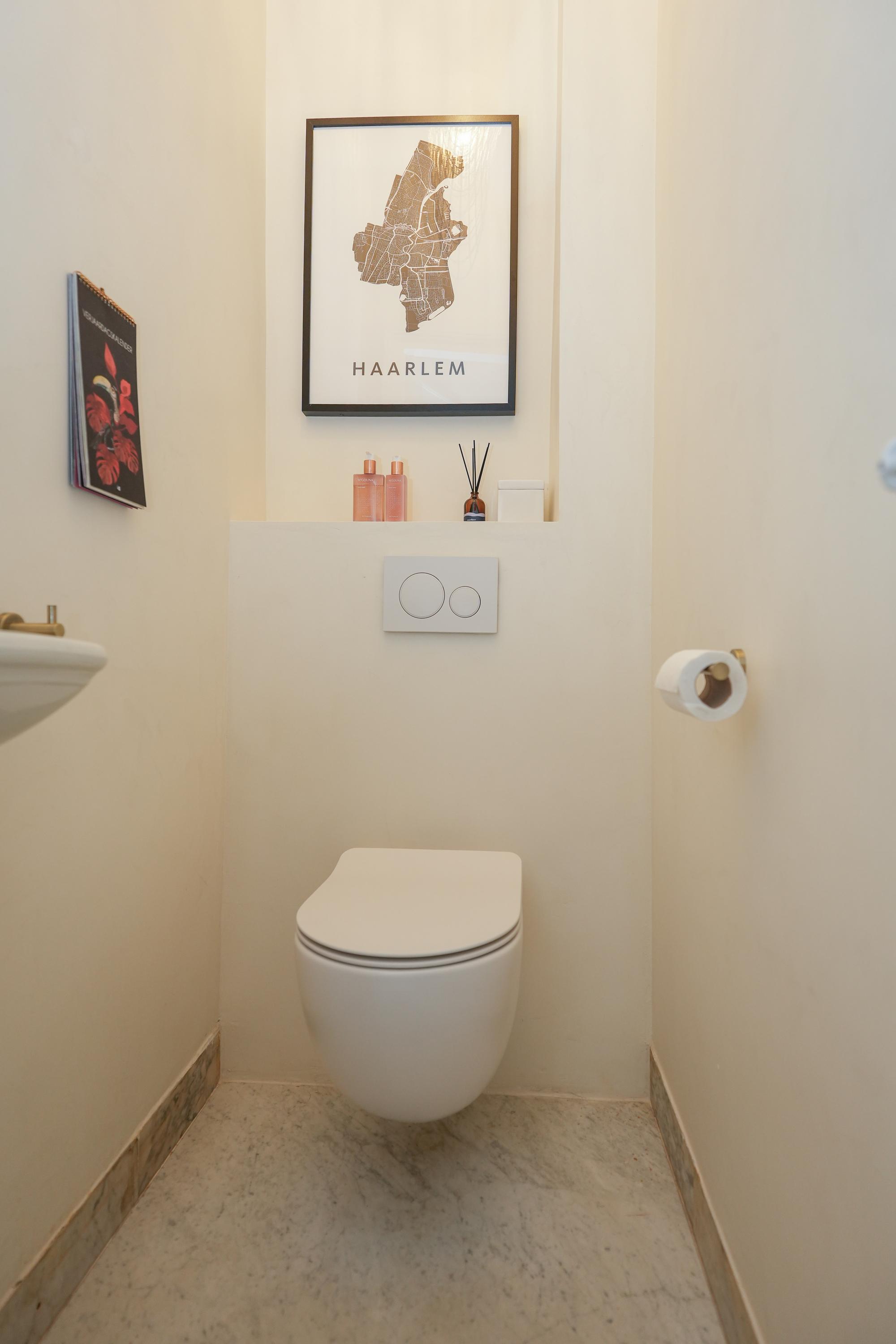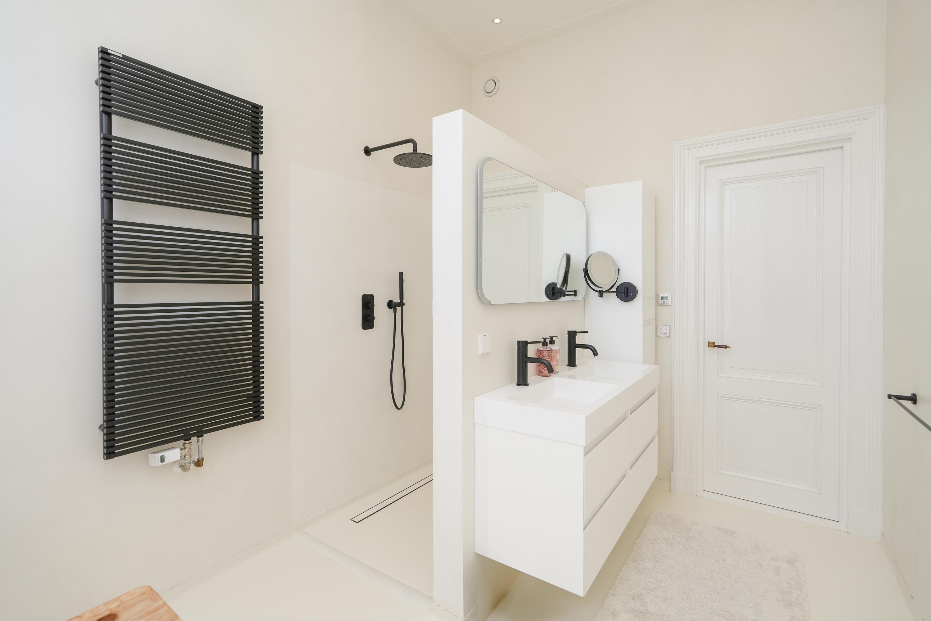 Lichte overloop met vaste trap naar de bovenste verdieping. Op de eerste verdieping bevinden zich twee slaapkamers, een moderne badkamer en een separaat toilet met fonteintje. De masterbedroom heeft airconditioning en een riante walk-in closet, bereikbaar via twee schuifdeuren naast het bed. Aan de voorzijde ligt een breed balkon bij de walk-in closet en aan de achterzijde een ruim, zonnig dakterras bij de masterbedroom. Oorspronkelijk vormden de masterbedroom en walk-in closet twee aparte slaapkamers, deze indeling is weer eenvoudig terug te brengen. De tweede slaapkamer is ook voorzien van airconditioning. De luxe, moderne badkamer is zowel bereikbaar vanuit de masterbedroom als de overloop en beschikt over een vrijstaand ligbad, dubbele inloopdouche, dubbele wastafel in een badmeubel en vloerverwarming. Het toilet en de badkamer zijn voorzien van automatische mechanische ventilatie.