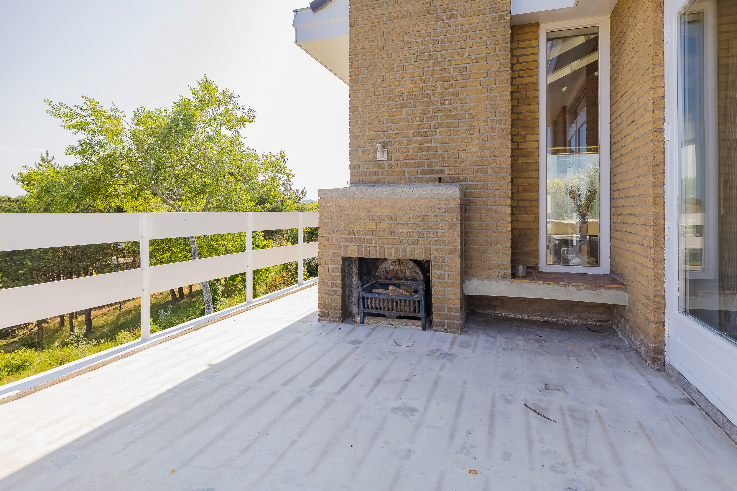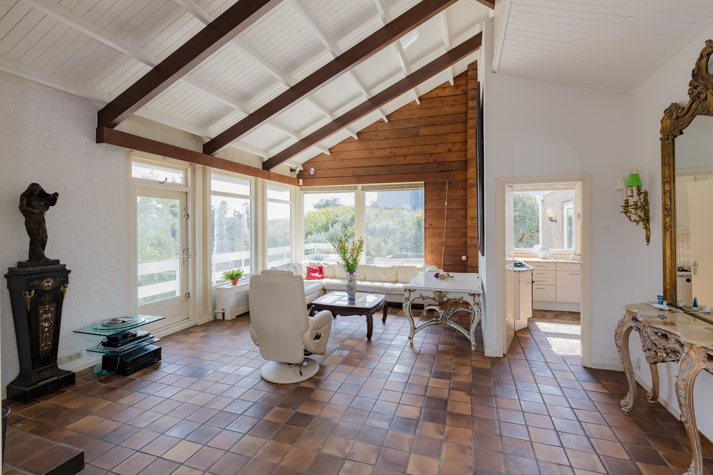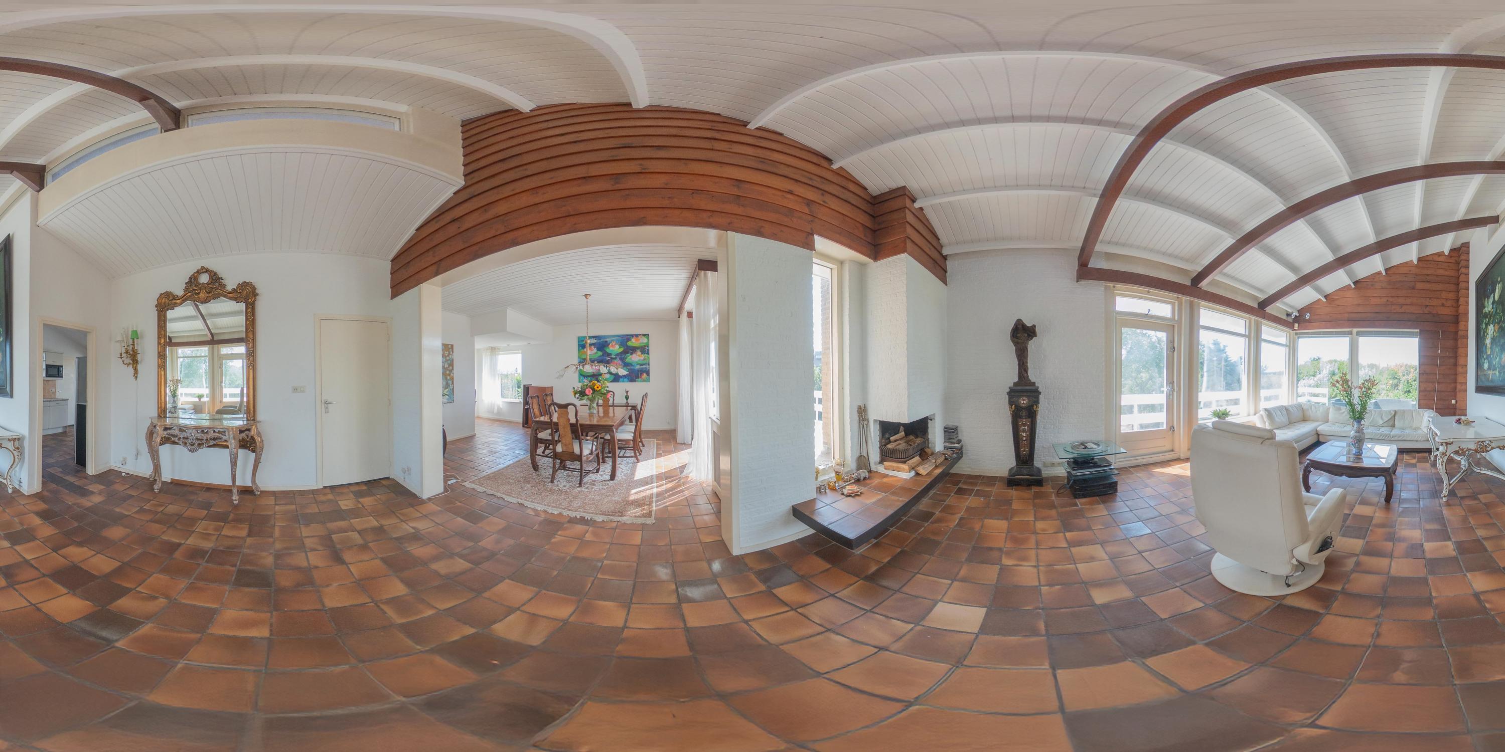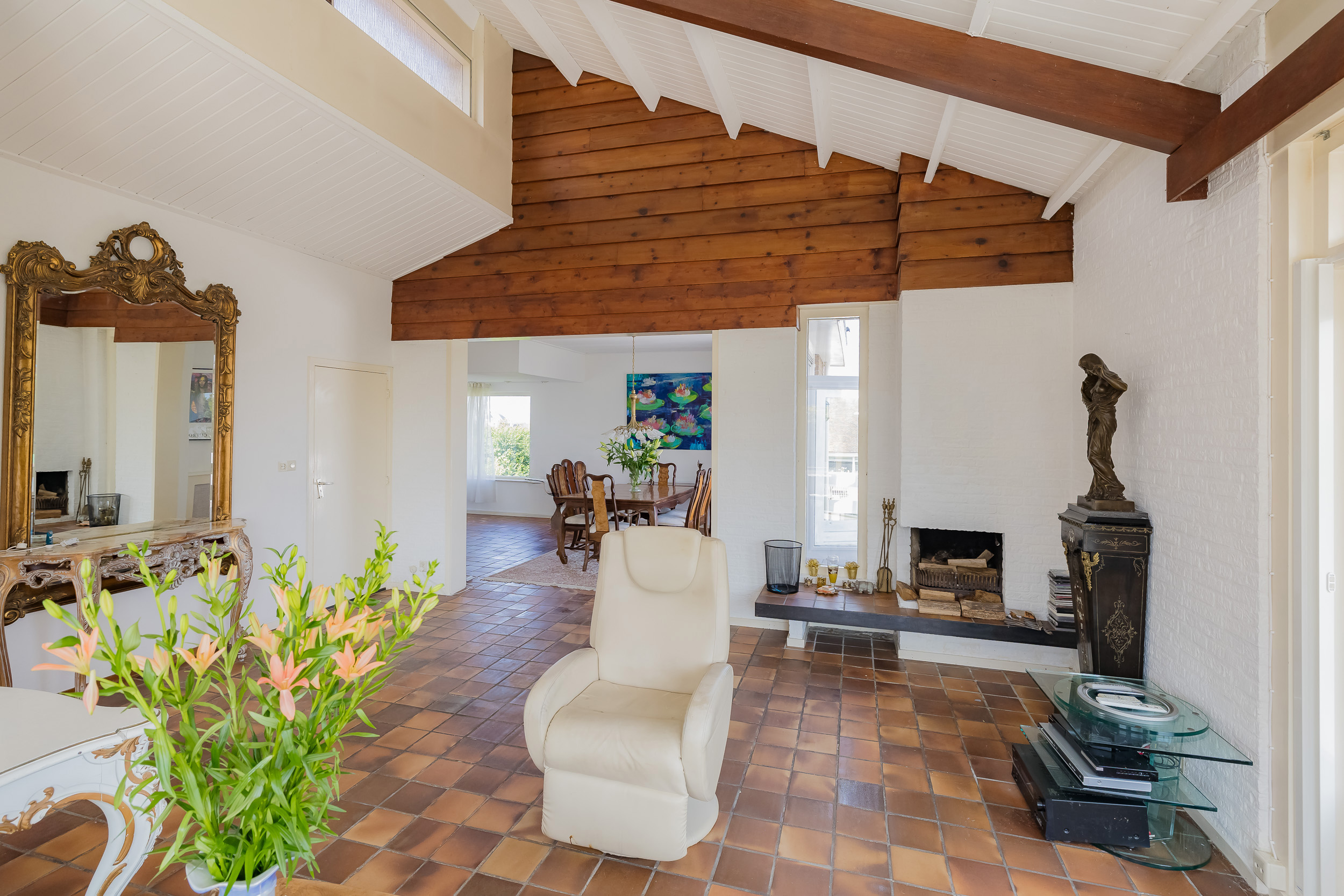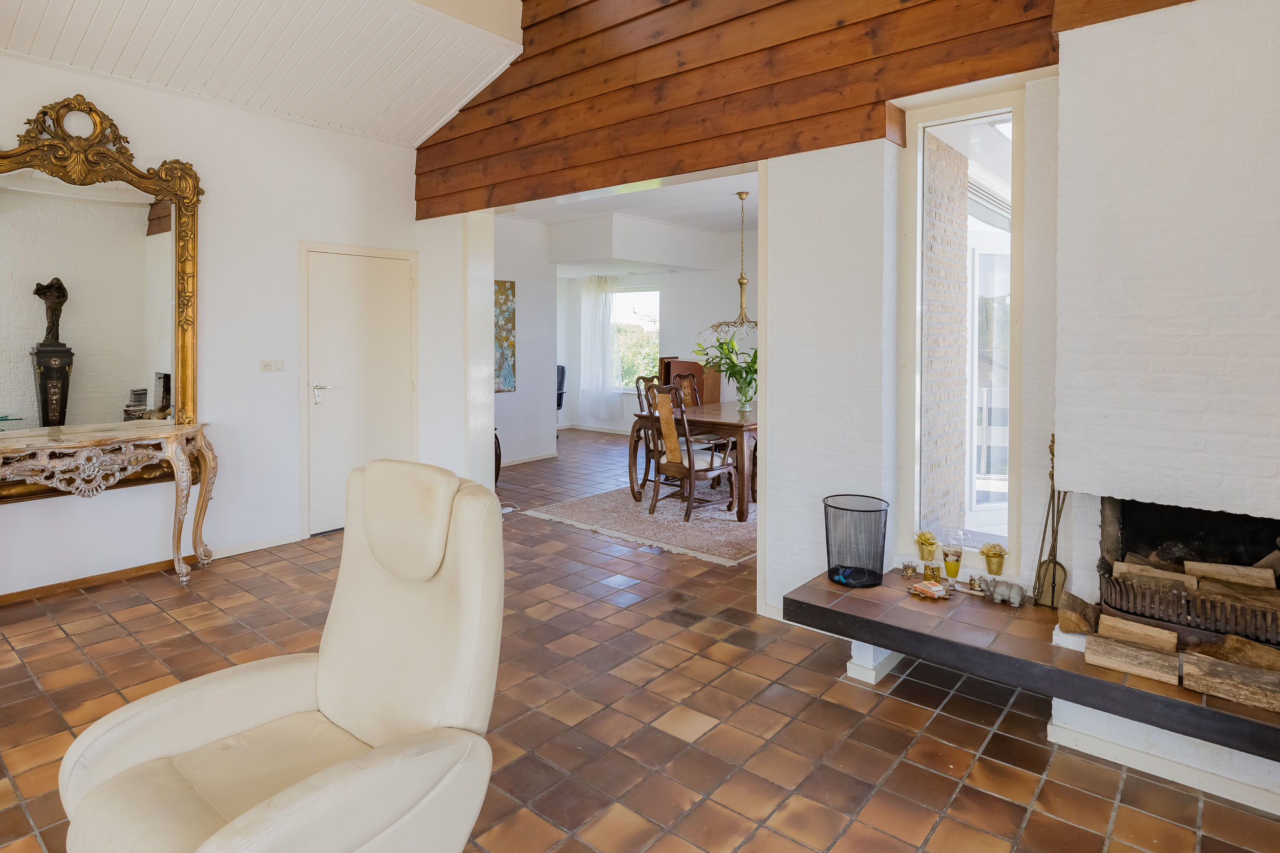 De villa biedt een royale living met grote raampartijen, waardoor het natuurlijke licht rijkelijk binnenvalt. Vanuit de woon- en eetkamer heeft u directe toegang tot een groot en zonnig terras, compleet met een sfeervolle buitenhaard – perfect voor lange zomeravonden of knusse wintermomenten buiten. In de ruime eetkeuken is plaats voor een royale eettafel voor gezellige diners. Achter de keuken is een bijkeuken met toegang tot een inpandige berging.