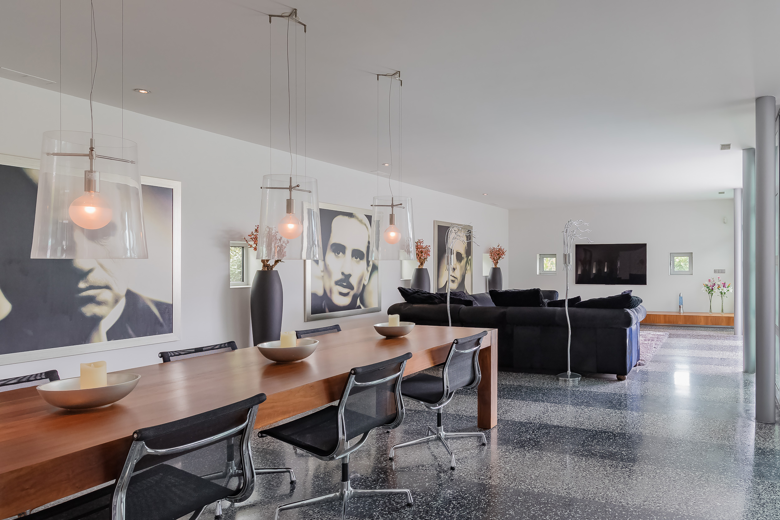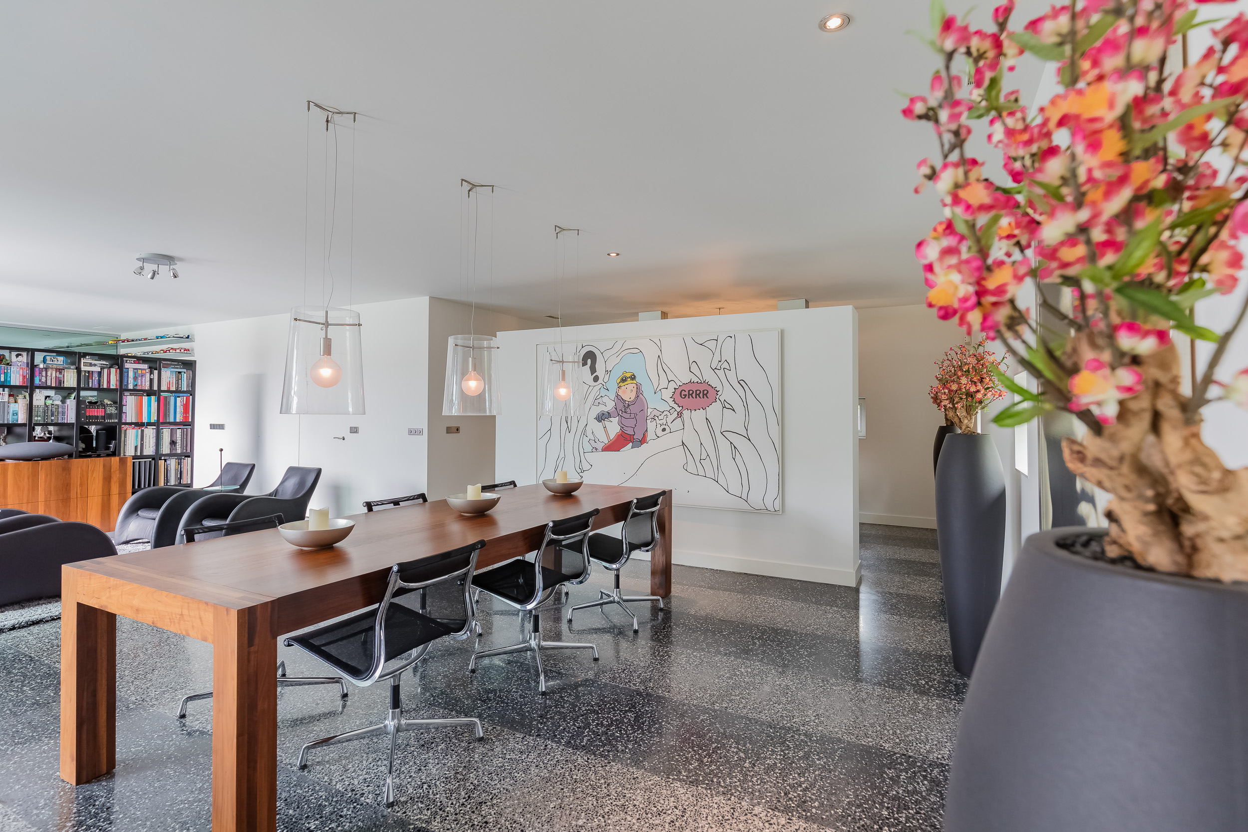 De gehele begane grond is voorzien van een terrazzovloer met vloerverwarming. Om de binnen/buiten beleving te versterken geven grote schuifpuien toegang tot de tuin en is de Terrazzovloer naar buiten doorgetrokken.