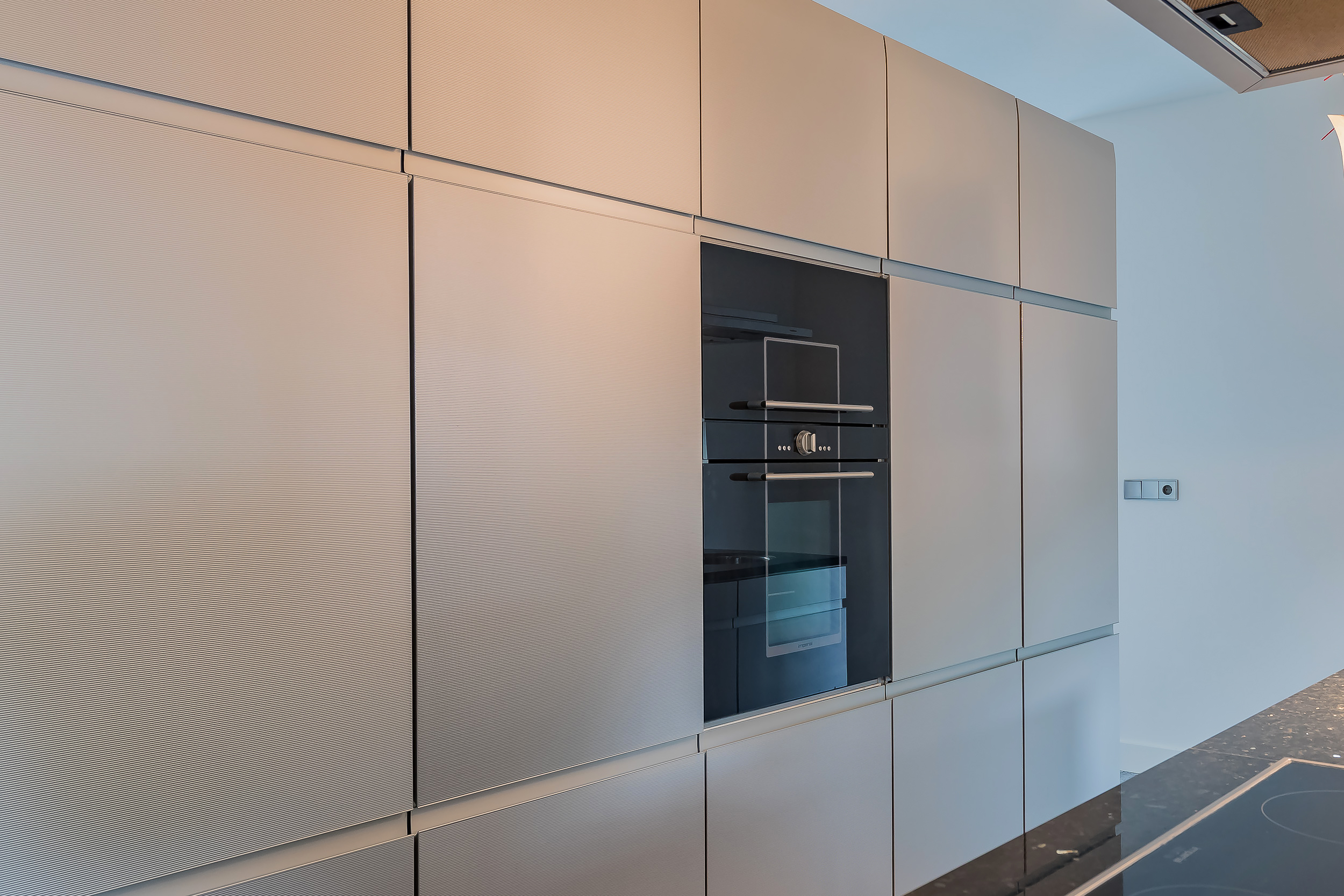 De keuken, waar de symmetrie ook terugkomt, is voorzien van luxe inbouwapparatuur en als roomdivider afgescheiden van de eetkamer.