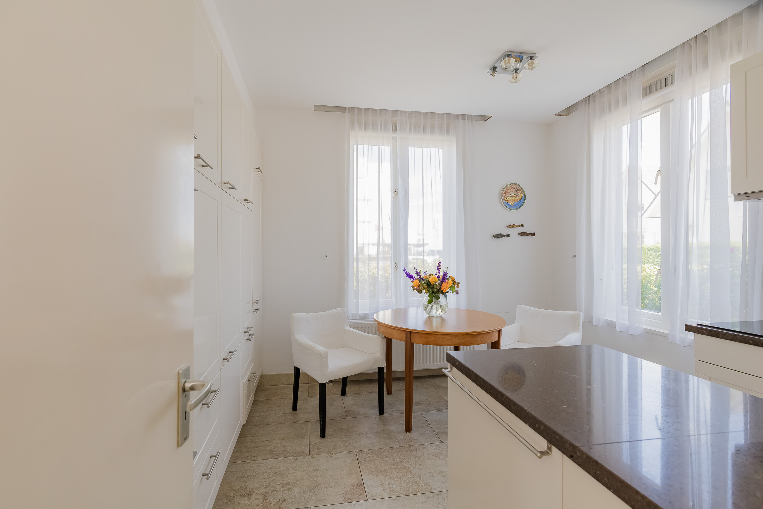 De keuken, voorzien van inbouwapparatuur, is praktisch ingericht met veel kastruimte. Verder vind je op de begane grond een lichte 2e woonkamer met een gashaard, ideaal voor ontspanning of als ruime werkkamer. Daarnaast beschikt de begane grond over een comfortabele slaapkamer met inbouwkast. Het ruime zonnige terras op het zuiden is bereikbaar via de beide woonkamers. De badkamer in de hal is ideaal om na een dagje strand het zand direct van je af te spoelen.