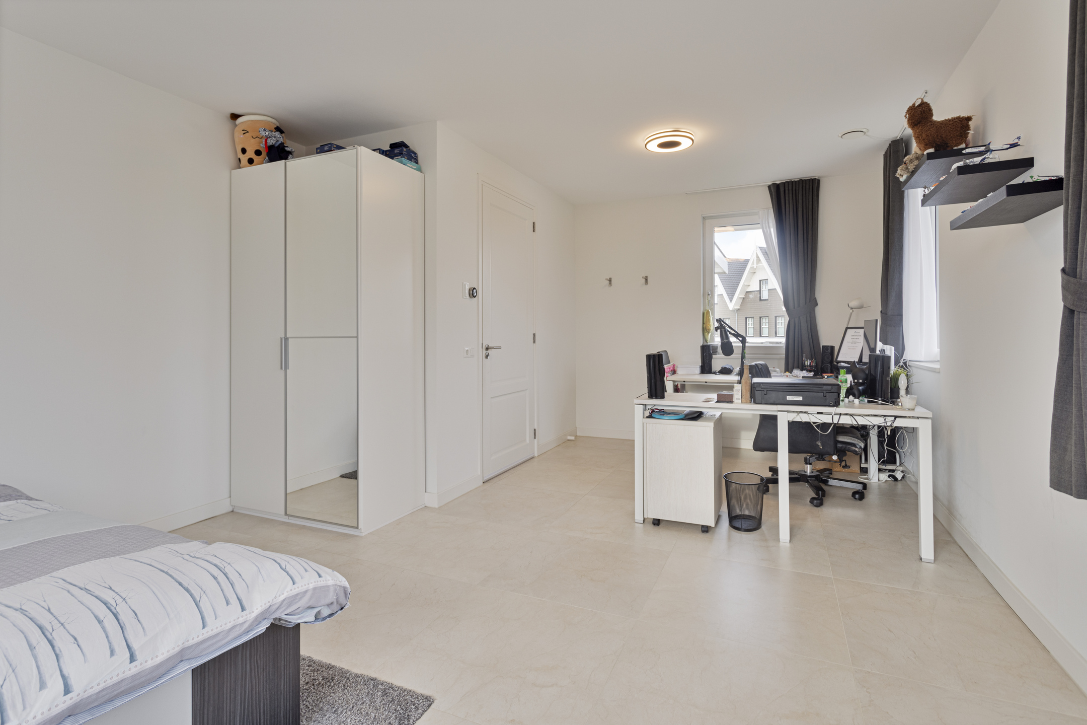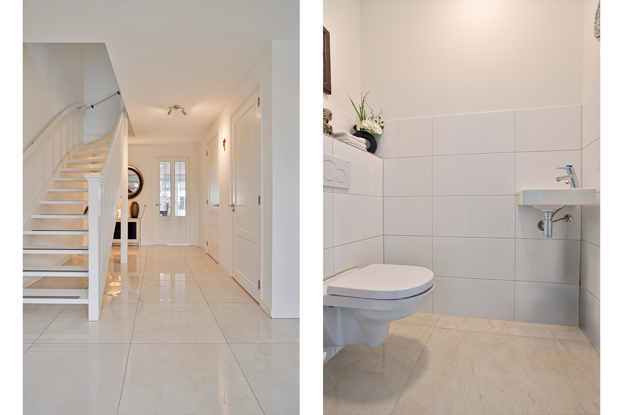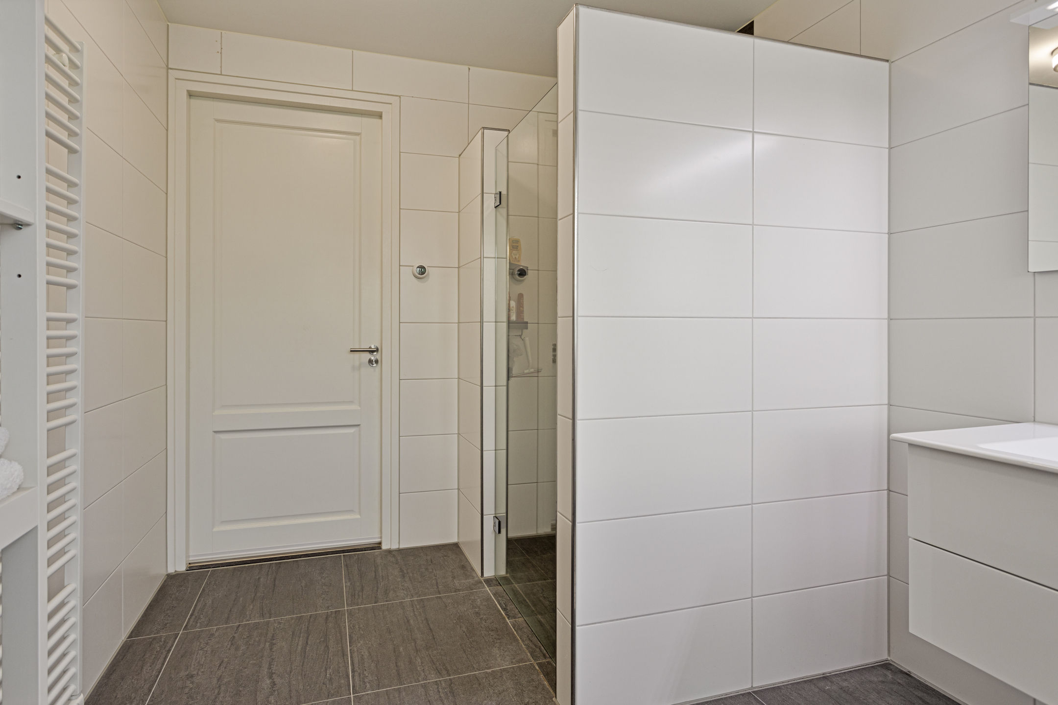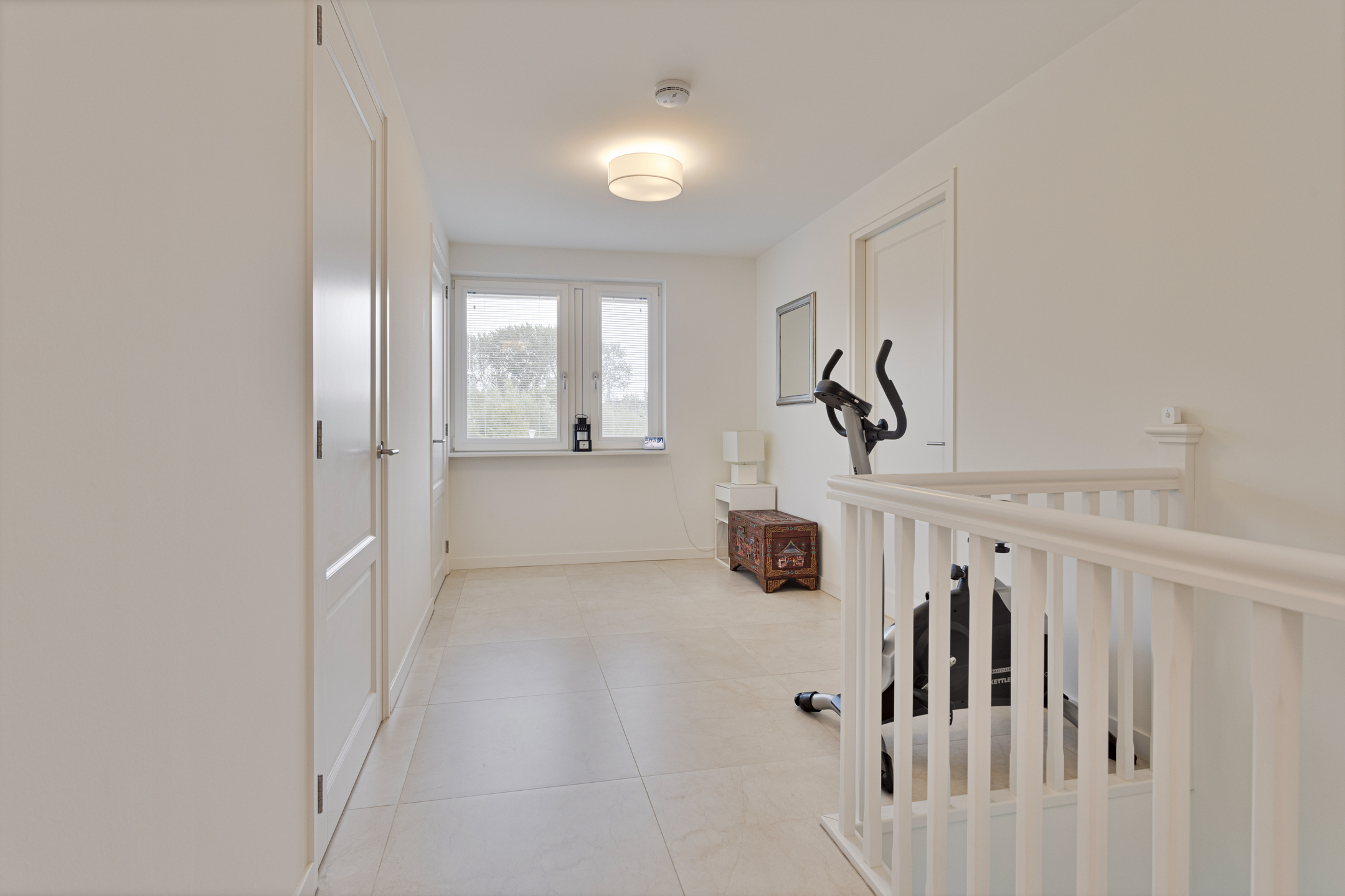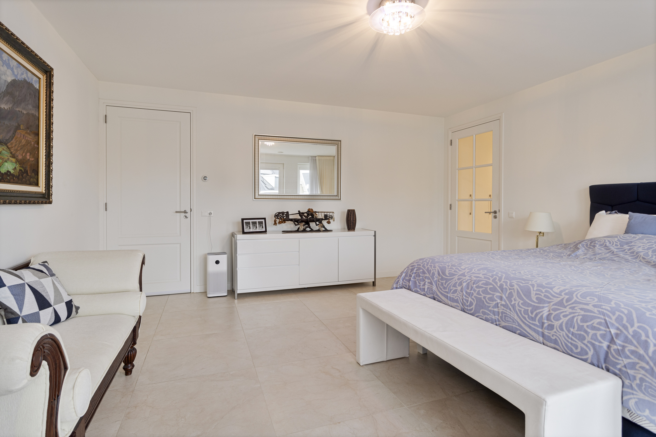 Ruime overloop met aparte wasruimte en technische ruimte. Verder treft u op deze woonlaag 4 zeer royale slaapkamers aan. De ouderslaapkamer beschikt over een zeer ruime inloopkledingkast met op maat gemaakte kasten en daarachter een luxe badkamer en suite voorzien van bad, douche, dubbele wastafel en toilet. Eén van de andere slaapkamers beschikt ook over een badkamer en suite (met douche, wastafel en toilet). De andere twee slaapkamers delen een prachtige ruime (3e!) badkamer met douche, dubbele wastafel en toilet. Een luik op de overloop geeft toegang tot een zeer ruimte bergzolder.