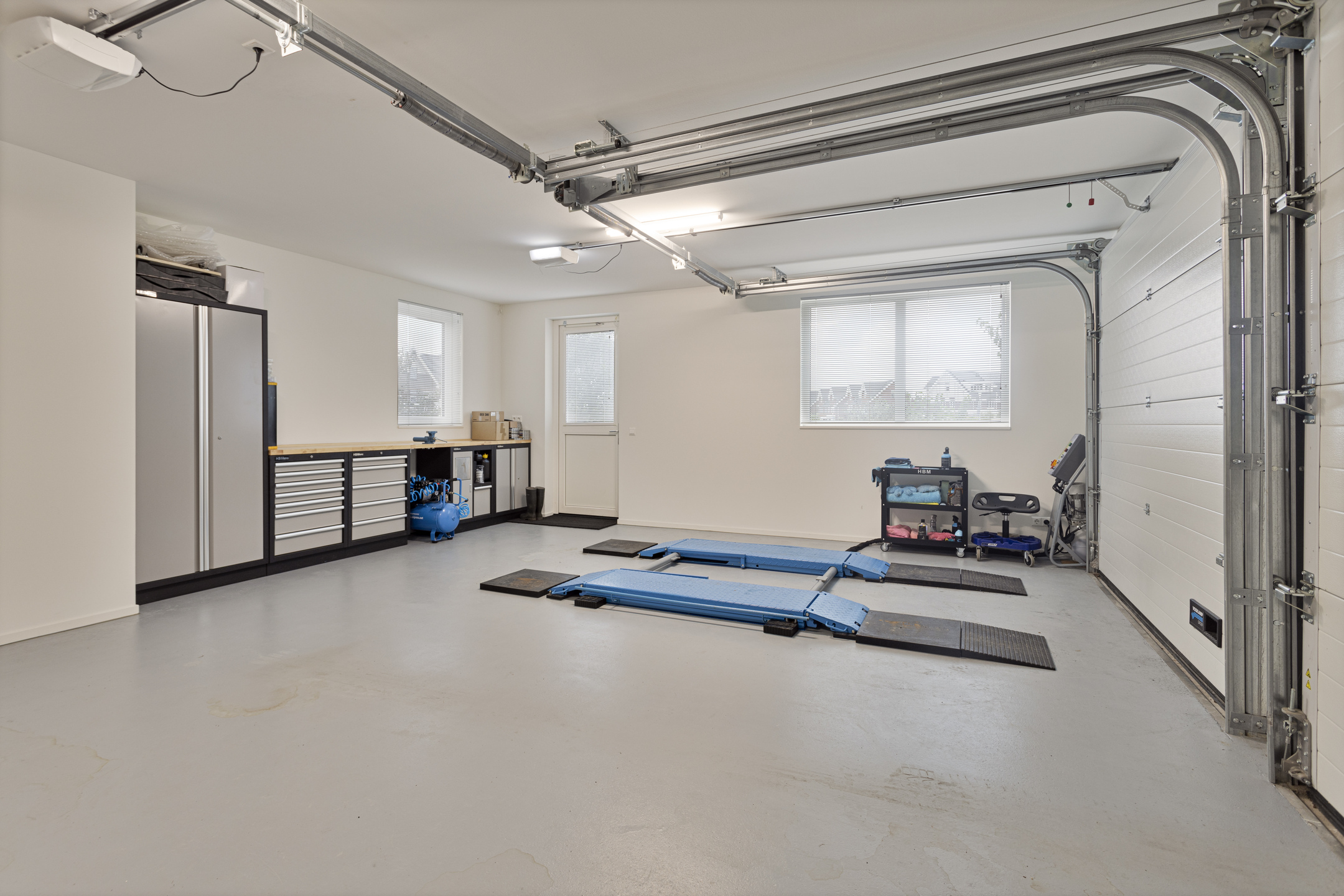 Aan de buitenzijde van de woning valt op dat deze beschikt over een zeer ruime oprit met elektrisch bedienbaar toegangshek. Aan het einde van de oprit bevindt zich een dubbele inpandige garage. Naast de woning staat de houten berging, die ook handig is voor de dagelijkse fietsen. De achtertuin is fraai aangelegd en heeft een riant terras direct aan de woning én een groot ‘deck’ aan het water. Aan de lange zijde van de tuin bevinden zich meerdere afmeerplekken voor boten, waarvan één afmeerplek is voorzien van een bootlift.