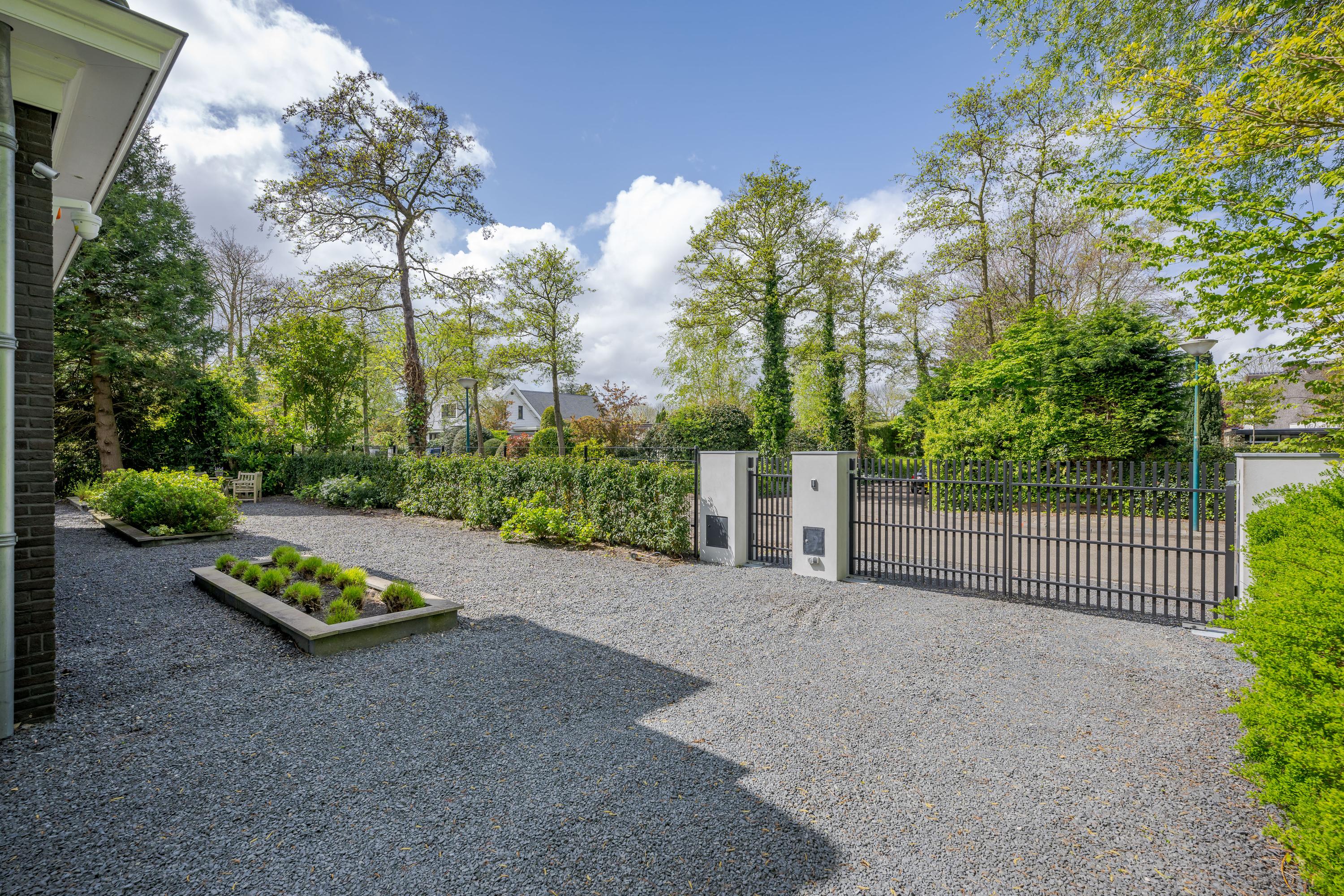 De oprit naar de garage toe is bereikbaar middels het elektrische hek en biedt plaats aan meerdere auto's. Achteraan de oprit ligt de garage, welk is voorzien van dubbele openslaande deuren, een venster en een zijdeur. De garage is geschikt voor een auto, alsmede fietsen en tuingereedschap. Achter de garage bevinden zich de afvalcontainers.
