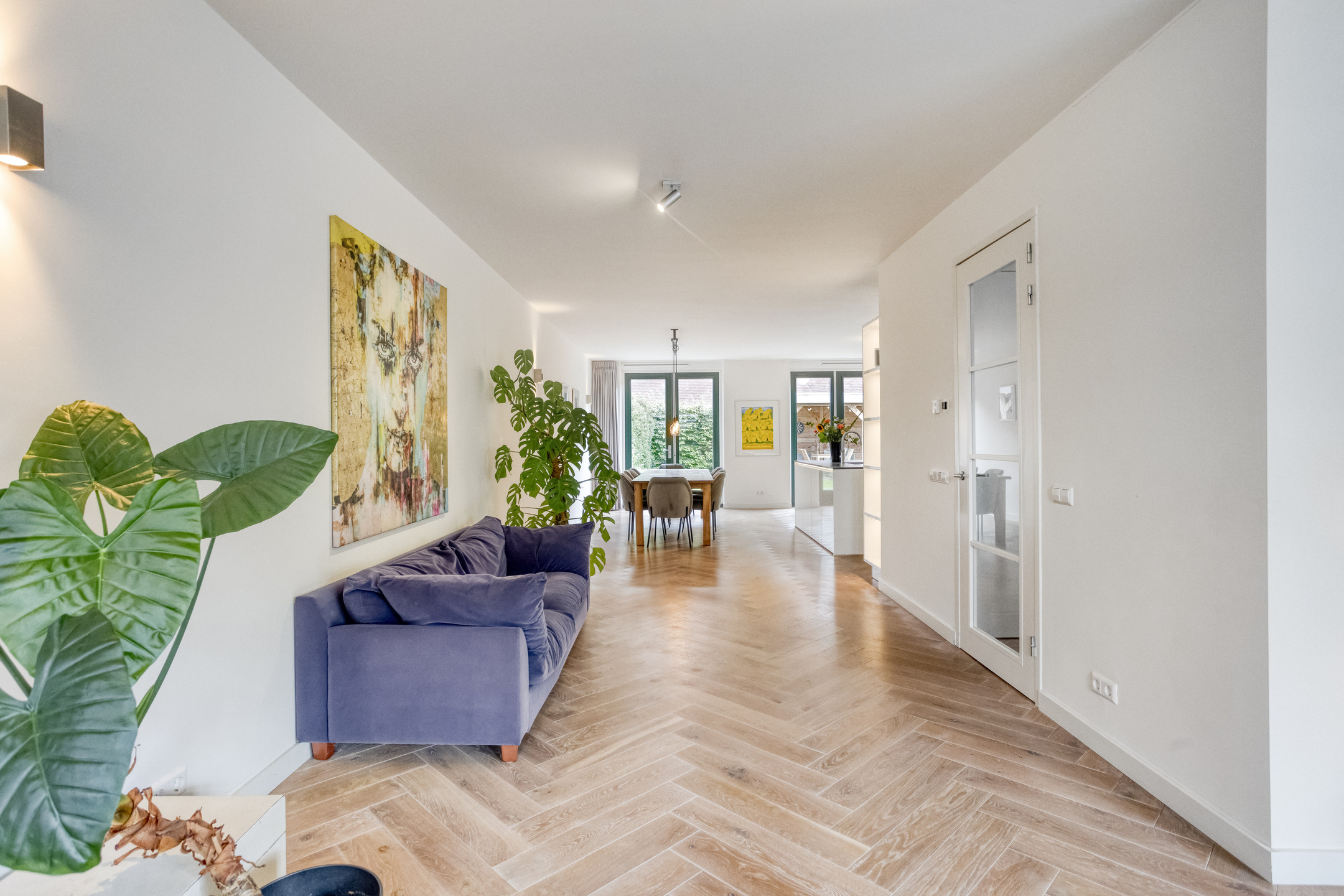 • Begane grond: entree, ruime hal met modern toilet en garderobekast onder de trap. Aan de voorzijde de lichte en ruime L-vormige woonkamer. Aan de achterzijde de riante woonkeuken met kookeiland en luxe inbouwapparatuur (dubbele oven, wijnklimaatkast, fornuis met Bora-afzuigsysteem, Quooker) met twee keer openslaande deuren naar de tuin.