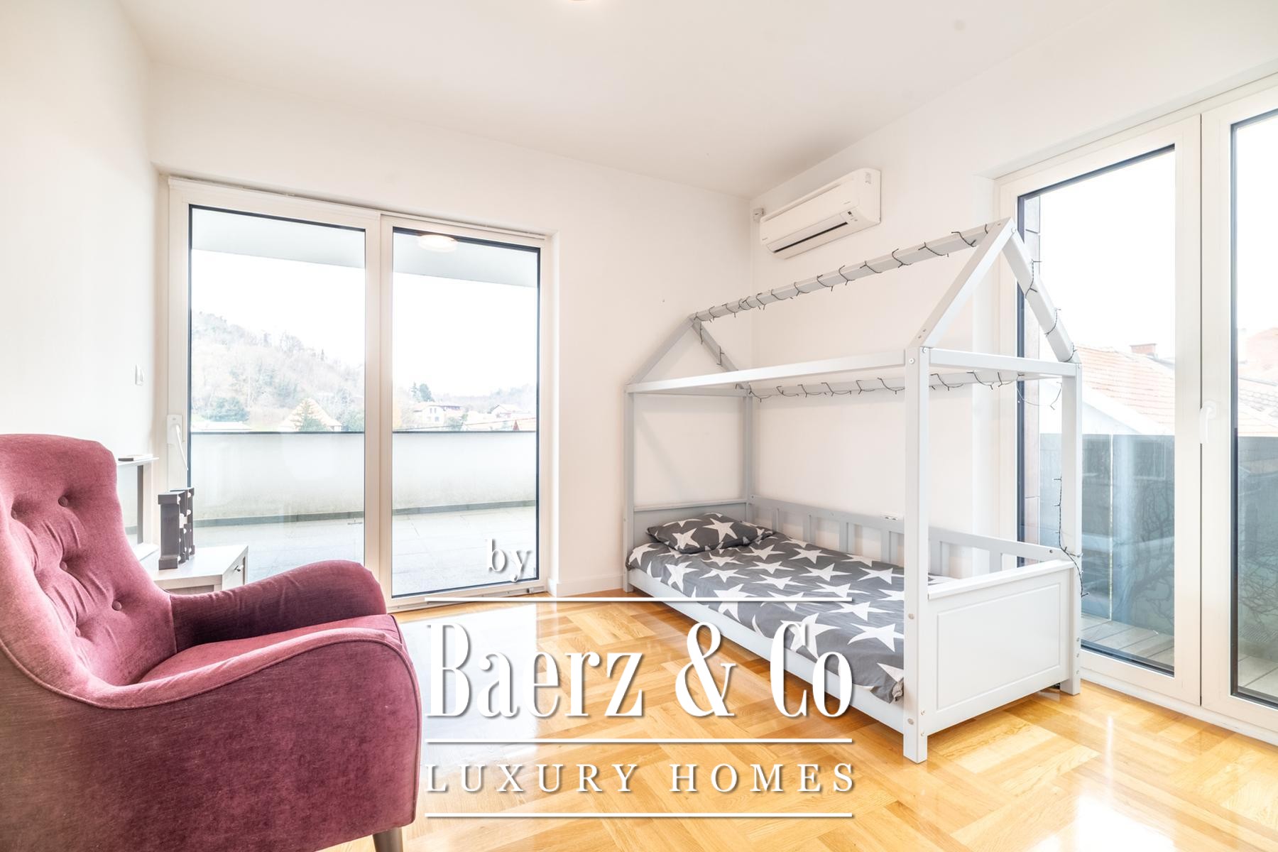 De begane grond herbergt een garage voor twee auto's, een wasruimte, wijnkelder, stookruimte en een binnenzwembad met douche, wat discreet comfort en gebruiksgemak garandeert. Op de verhoogde begane grond bevindt zich de hoofdentree, een royale woon- en eetruimte, een keuken met bijkeuken, gastentoilet en directe toegang tot het terras en de tuin. Eén slaapkamer en een badkamer completeren deze verdieping. De eerste etage biedt drie slaapkamers, elk met toegang tot een eigen terras of balkon, aangevuld met twee badkamers. Op de bovenste verdieping bevinden zich nog twee slaapkamers, een badkamer en terrassen met wijds uitzicht over de Medvednica en de oostelijke skyline.