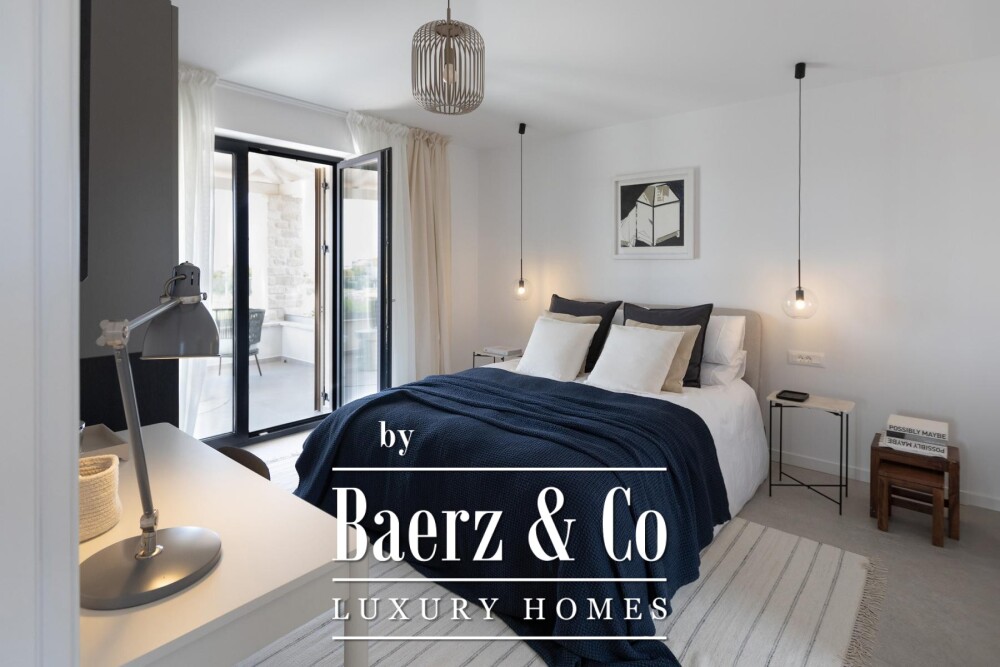 Op de eerste verdieping zijn twee slaapkamers, elk voorzien van stijlvolle keramische vloeren met vloerverwarming en ontworpen voor comfort en privacy. Eén slaapkamer opent naar een terras met uitzicht op zee. Vloerverwarming via een warmtepomp verzekert het hele jaar door comfort.
