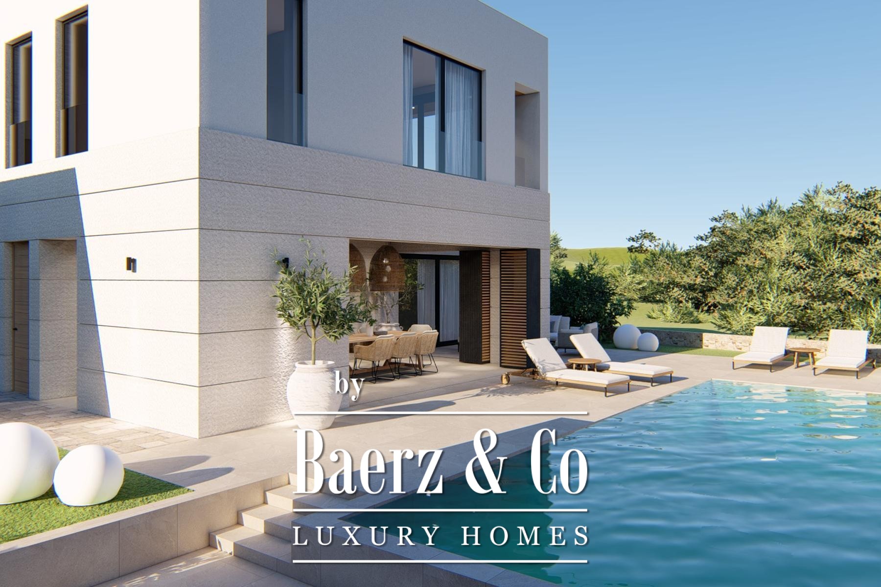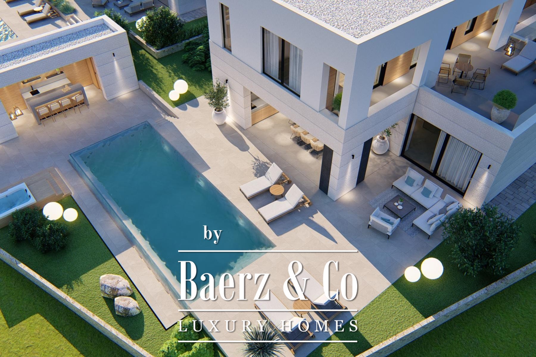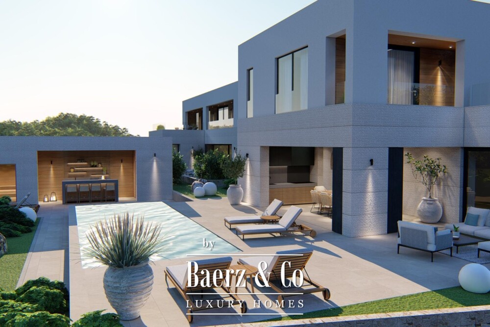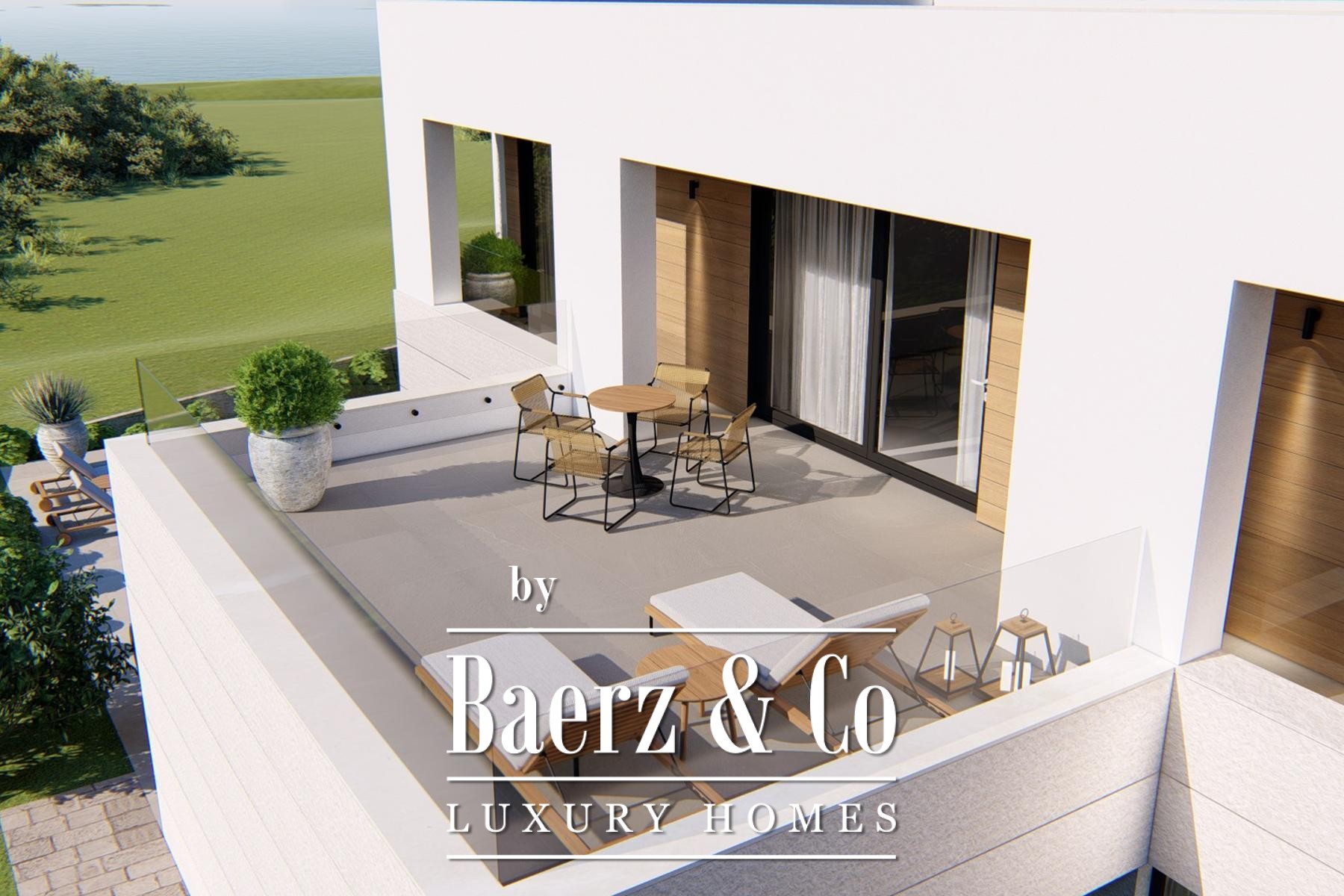 De hoofdverdieping verwelkomt u met een open woonkamer, keuken en eetruimte, aansluitend op een overdekt terras met barbecue. Grote glazen schuifdeuren omlijsten het uitzicht op zee en laten veel daglicht binnen. De begane grond beschikt over een slaapkamer met eigen badkamer; de eerste verdieping telt drie extra slaapkamers, elk met en-suite badkamers en toegang tot de loggia. De bovenste verdieping opent naar een royaal terras, waardoor binnen en buiten naadloos in elkaar overlopen.