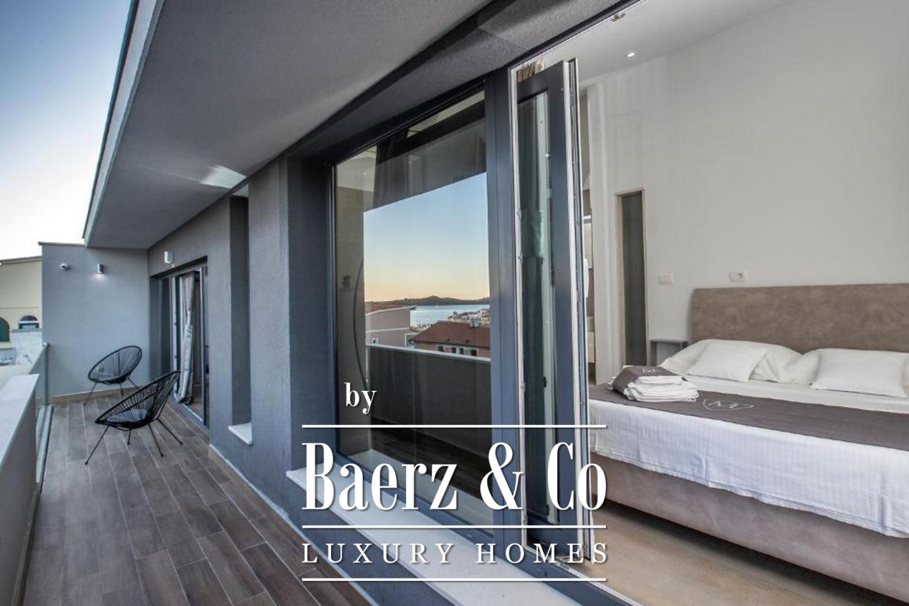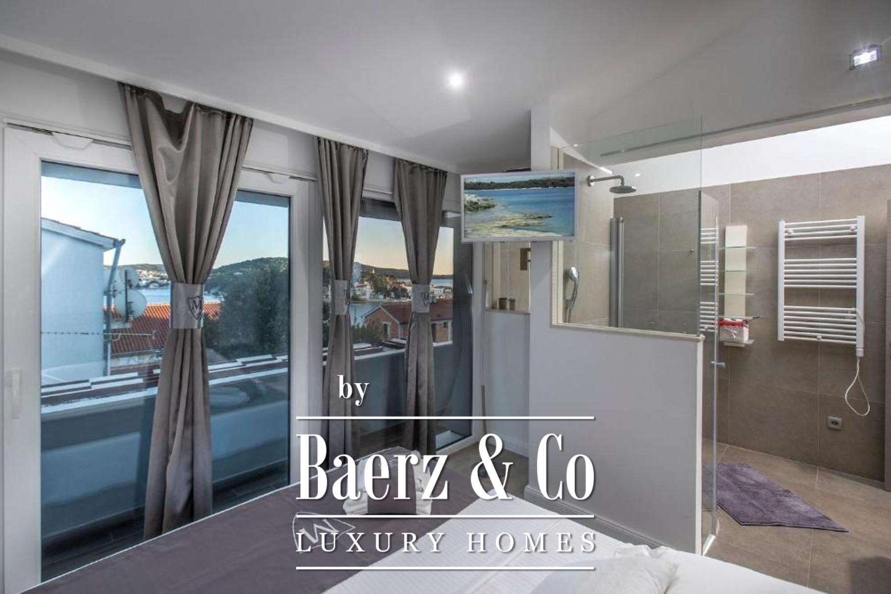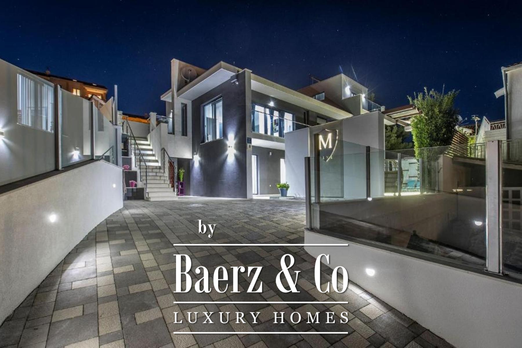 De bovenverdieping biedt een lichte leefruimte met keuken en eetgedeelte, twee slaapkamers en twee badkamers, waarbij elke hoofdruimte toegang biedt tot balkons met uitzicht op zee en zwembad. Flexibiliteit staat centraal, want de eerste verdieping kan worden gescheiden in zelfstandige appartementen om tegemoet te komen aan diverse woonwensen of voor eventuele gastverblijven. Verfijnde afwerkingen en hoogwaardige inrichting kenmerken elk detail, terwijl doordachte voorzieningen zoals een taverne met barbecue, een uitnodigende eet- en ontmoetingsruimte en een zonnige tuin bijdragen aan het wooncomfort. Drie parkeerplaatsen maken het geheel compleet, voor ontspanning en mogelijkheden aan de prachtige Kroatische kust.