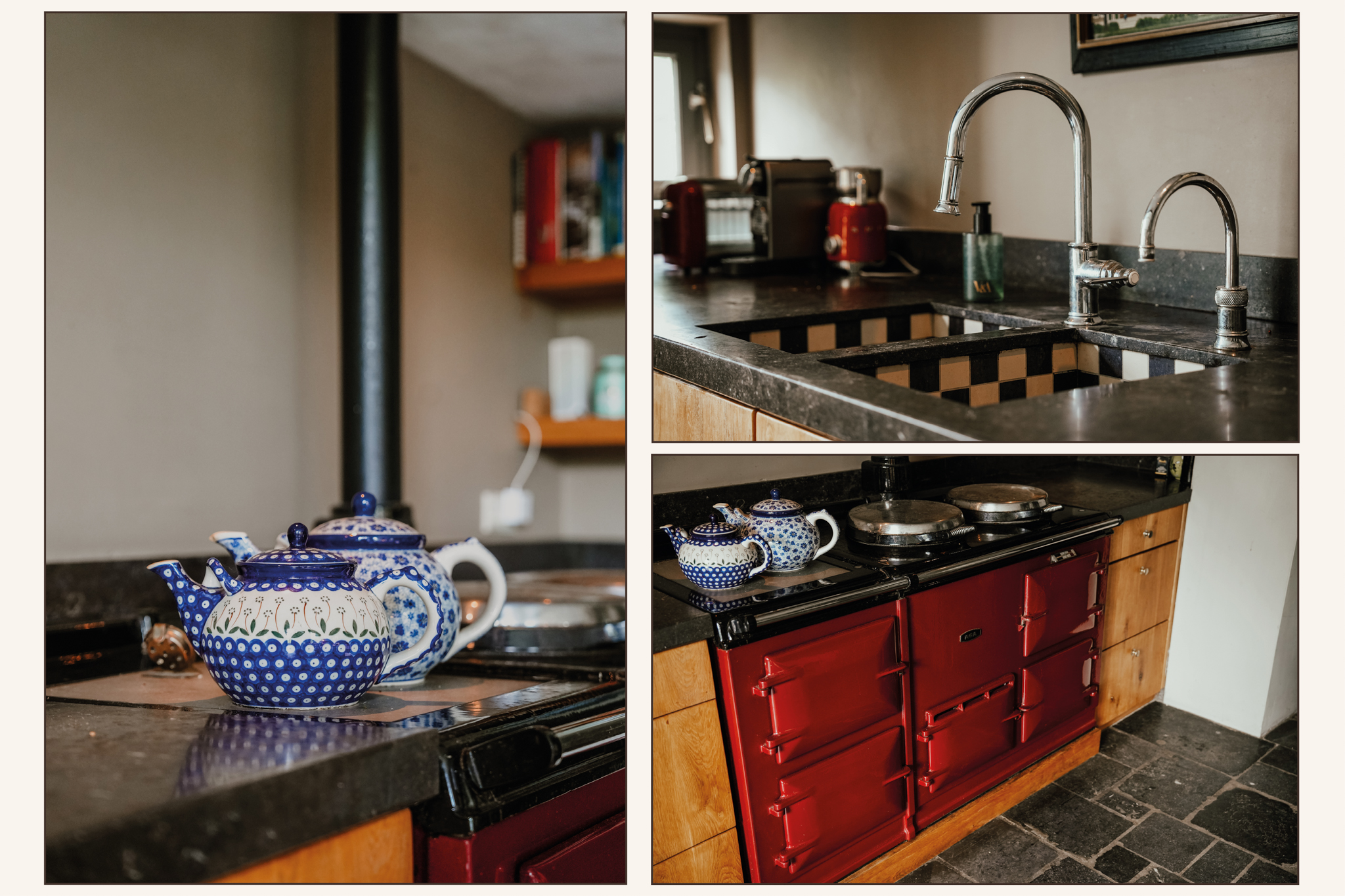 De grote woonkeuken vormt het hart van de woning en geeft zicht op de tuin. Er is een antieke hardstenen vloer met vloerverwarming en onder de brede schouw staat een dubbel AGA-fornuis. De eiken maatwerkkeuken voorzien van hardstenen werkblad past perfect in de sfeer van deze leefruimte. Bonus in de woonkeuken is de verhoogde vuurplaats die als openhaard maar ook als grill gebruikt kan worden.