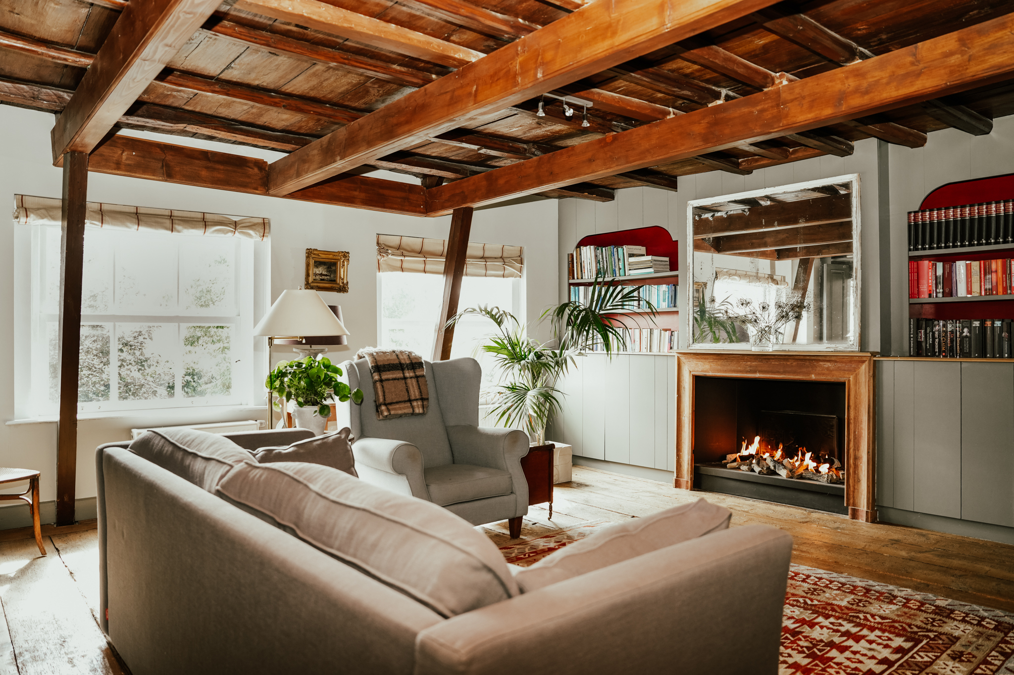 Aan de linkerzijde van de hal ligt de woonkamer. Door de hoge roederamen met binnenluiken en het witgeschilderde balkenplafond een heerlijke lichte ruimte. Er is een schouw met openhaard, brede eiken vloerdelen en een diepe vaste kast.