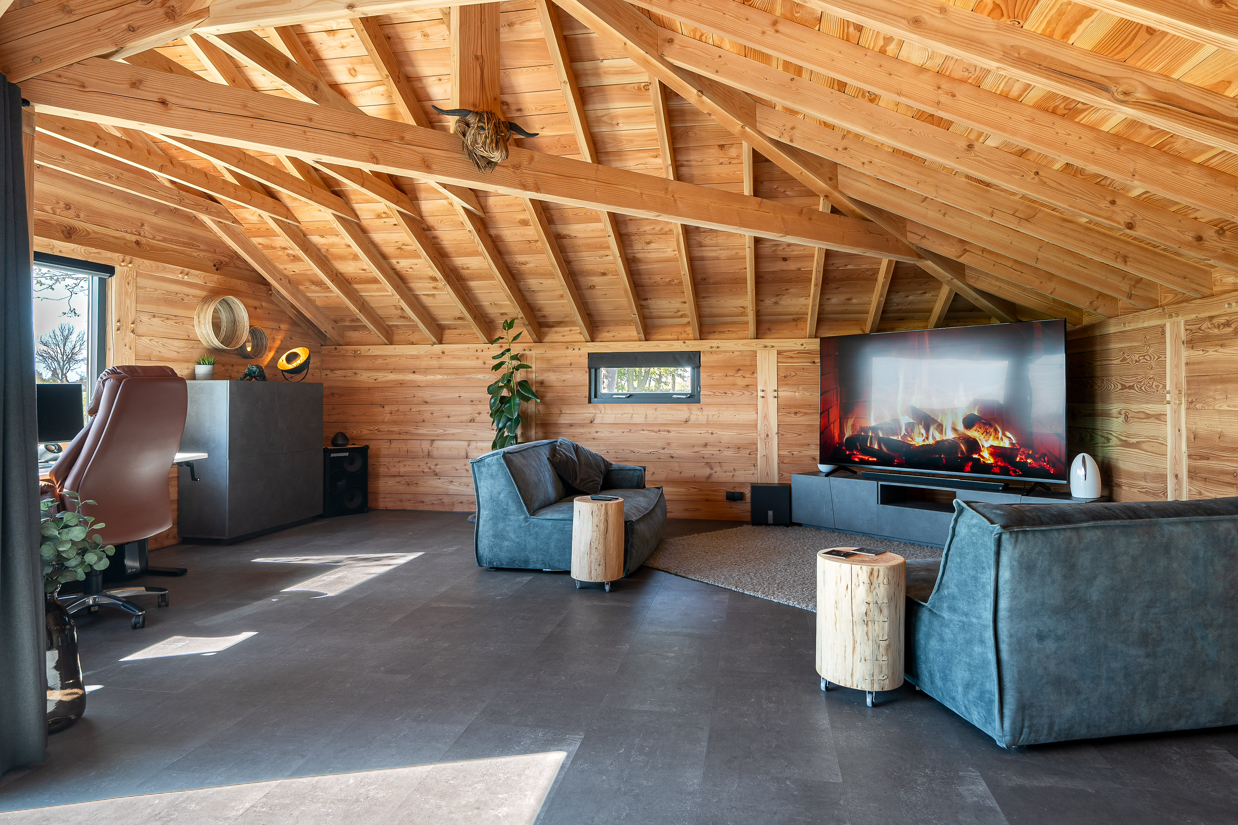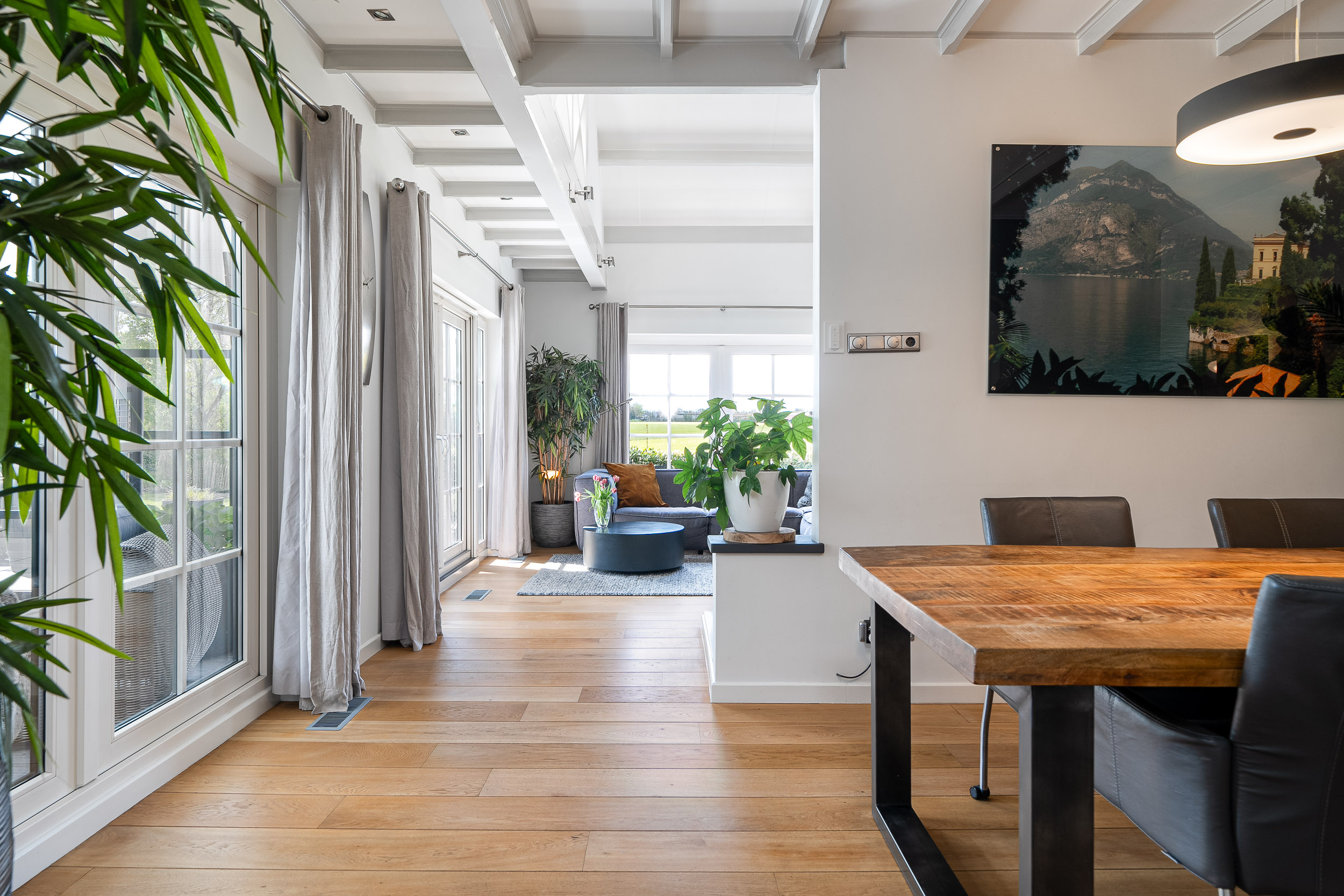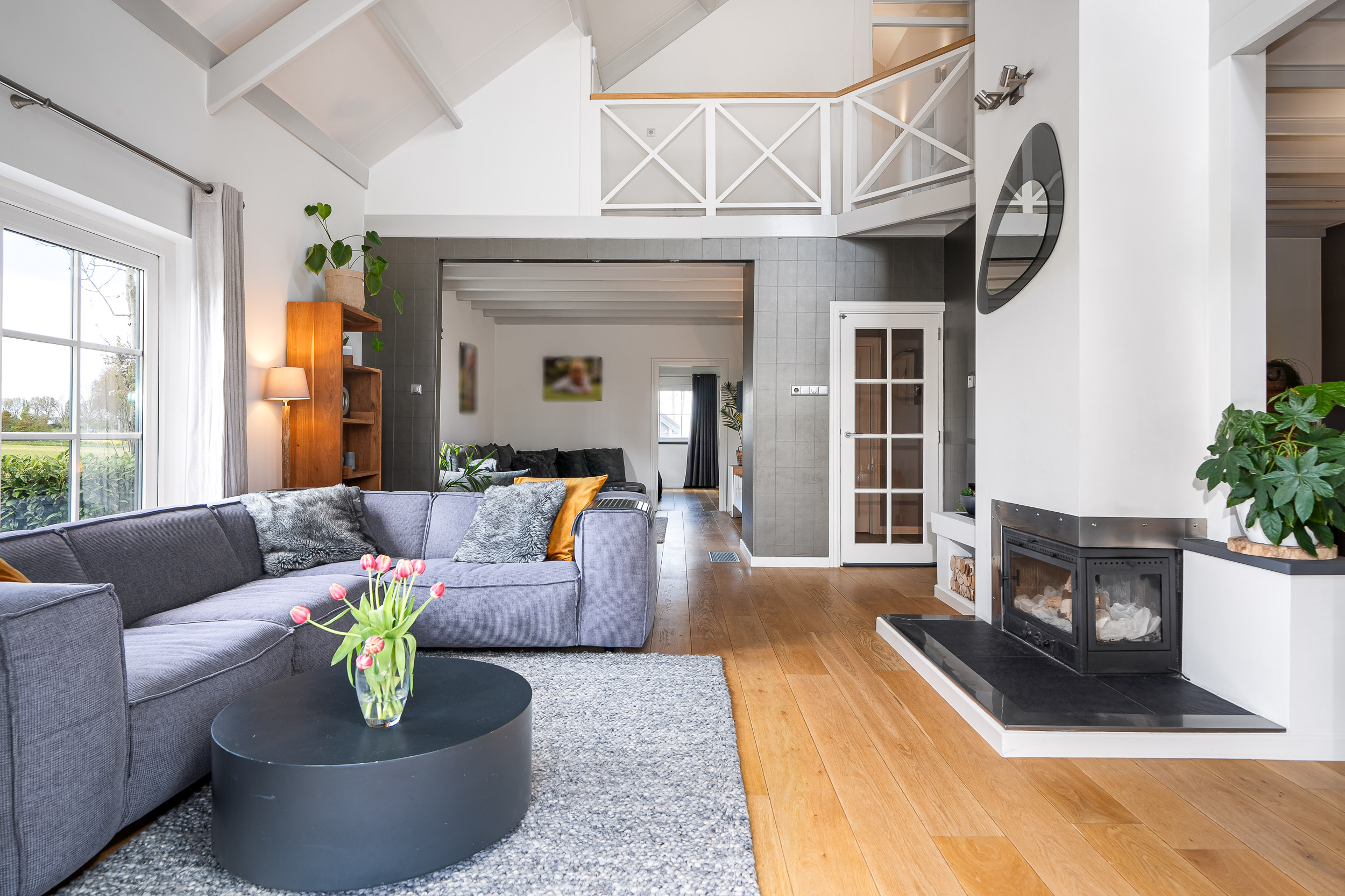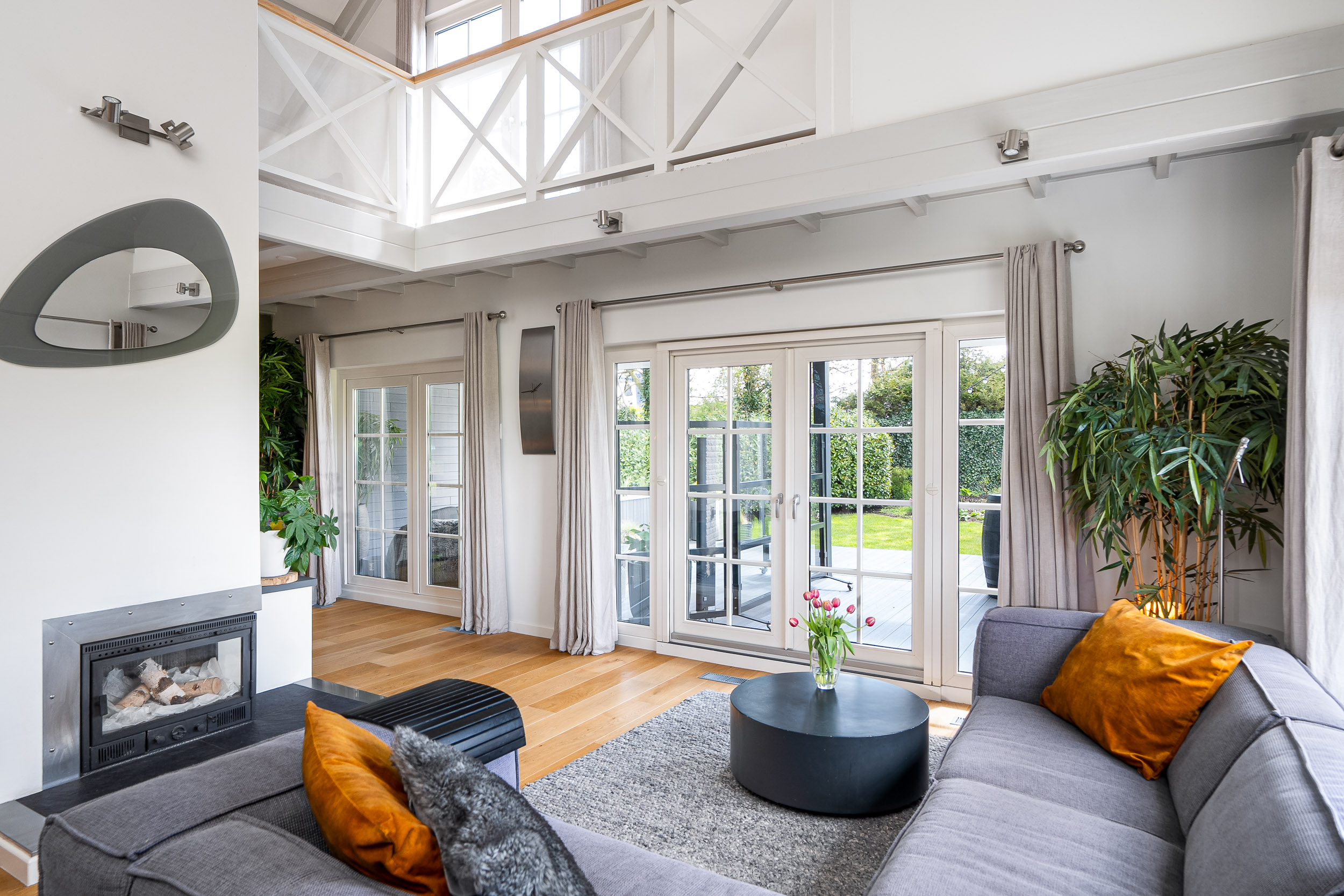 De woonkamer krijgt door de vele raampartijen en de vide veel licht en het uitzicht door elk raam is gefocust op de natuur. De adembenemende vergezichten vervelen hier nooit. De woonkamer heeft diverse sfeerhoeken als een zithoek rond de houthaard, een entertainment hoek en een eethoek. Er ligt een prachtige warme houten vloer voorzien van hete lucht verwarming en de openslaande tuindeuren geven direct toegang tot de gezellige veranda en het terras dat rondom alle privacy biedt.
