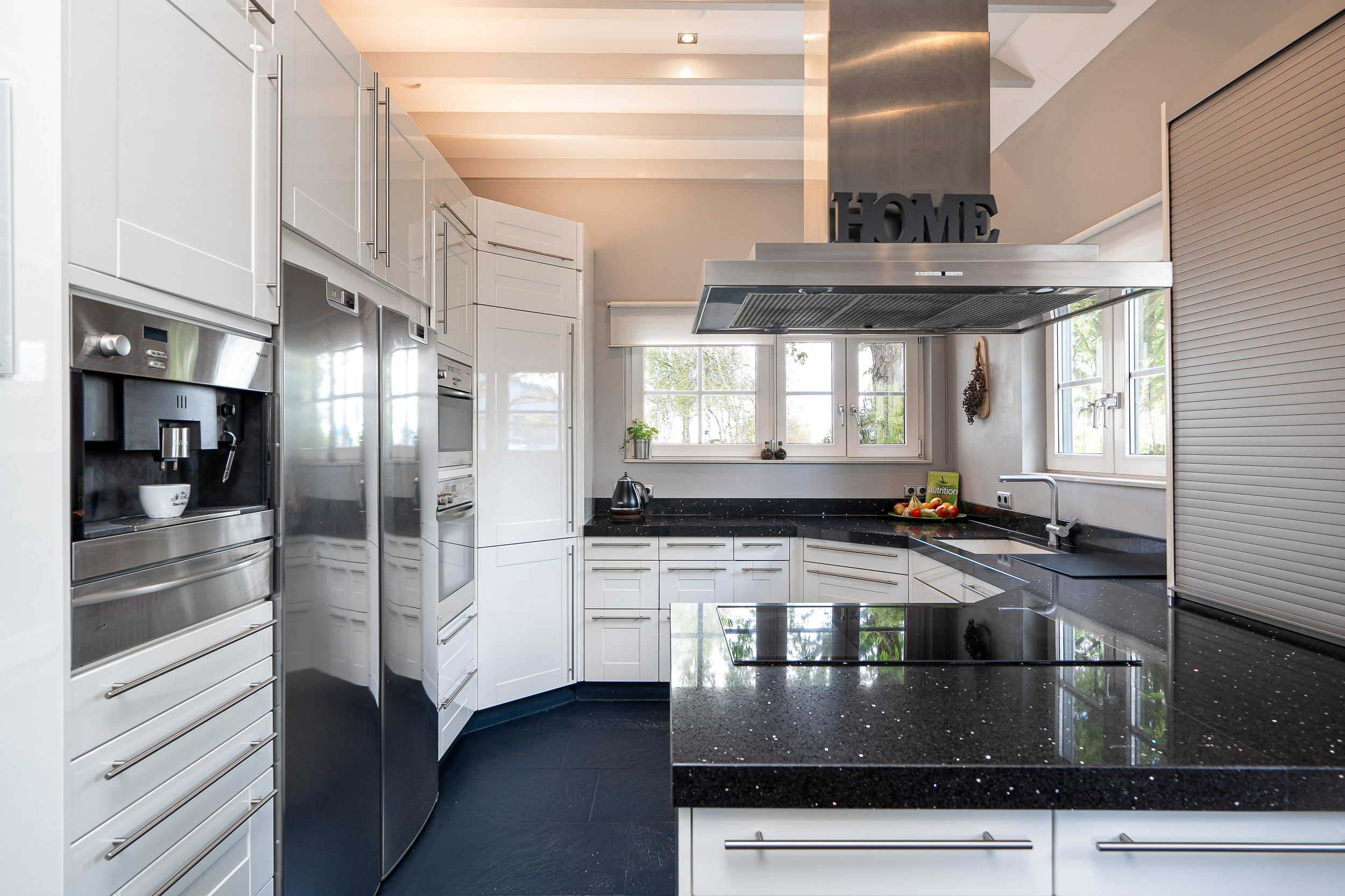 De halfopen woonkeuken is voorzien van diverse inbouwapparatuur en ook hier is een deur naar de tuin. Verwarming middels vloerverwarming. Er is voldoende plaats voor een eethoek in de keuken, maar ook het direct naast de halfopen keuken gelegen knusse woonkamer gedeelte biedt uitstekend ruimte voor een lange eettafel.