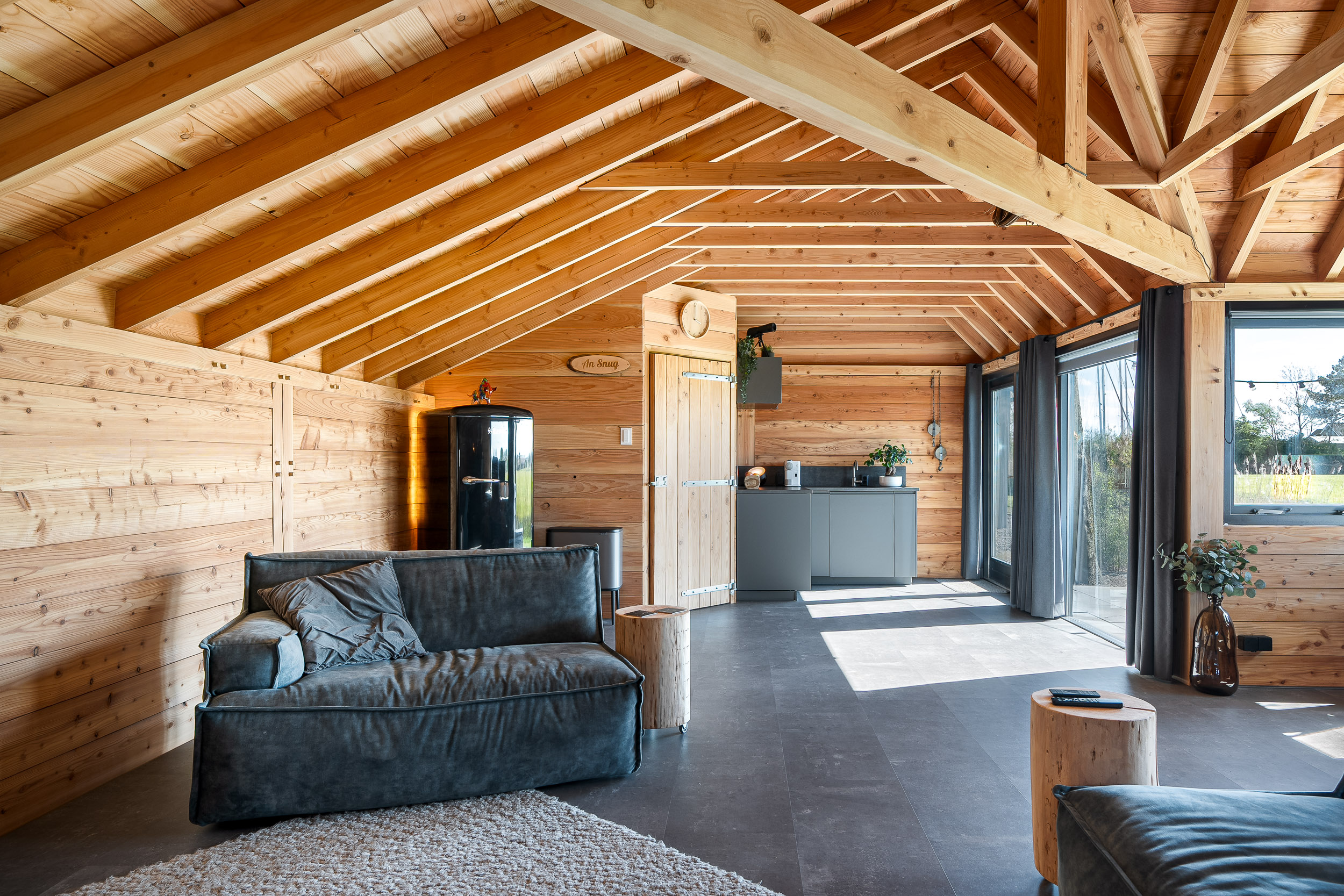 Recentelijk is in de tuin een volledig geïsoleerd gastenverblijf/atelier/thuiskantoor gebouwd. Deze beschikt over een kitchenette- en badkamerruimte waardoor het voor verschillende doeleinden gebruikt kan worden. De op het zuidwesten gerichte extra grote raampartijen van dit verblijf bieden inspirerende vergezichten op de natuur richting het IJsselmeer met de steeds veranderende Friese luchten.