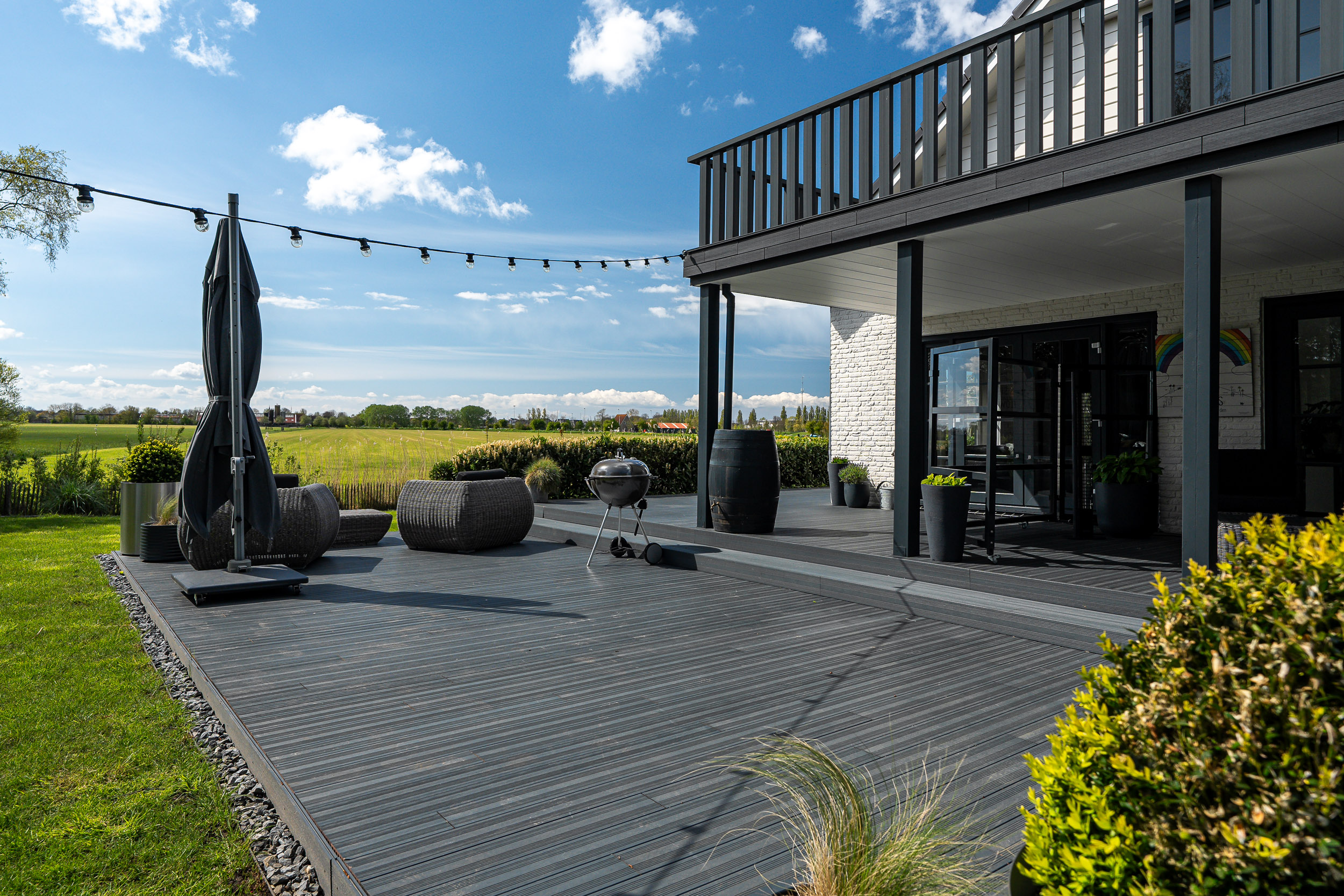 De onder architectuur aangelegde tuin met de robotmaaier is praktisch in onderhoud en speels aangelegd met diverse (fruit) boompartijen, hagen en rietkragen langs het water. De stijlvol aangelegde bestrating van de oprijlaan en toegangspoort accentueren de overgang naar de jaarrond groene tuin. Zowel het woonhuis als het gastenverblijf hebben het terras aan de zonkant waar je kunt genieten van de prachtige vergezichten over het Friese landschap en tot laat in de avond de meest spectaculaire zonsondergangen kunt zien.