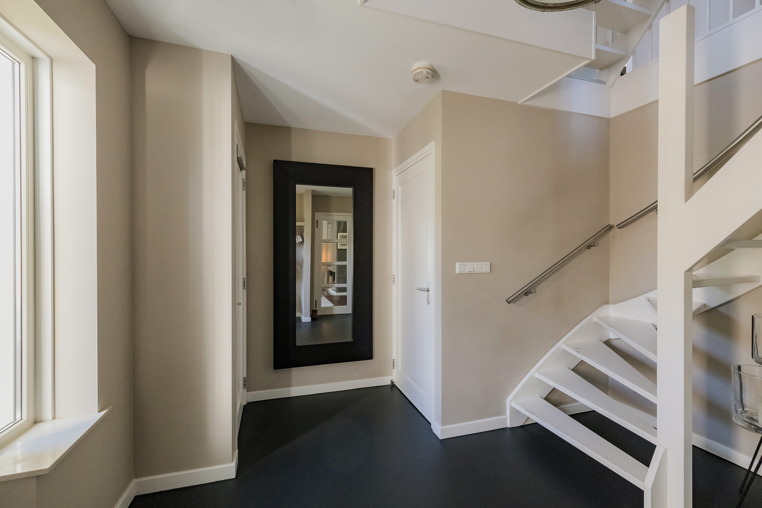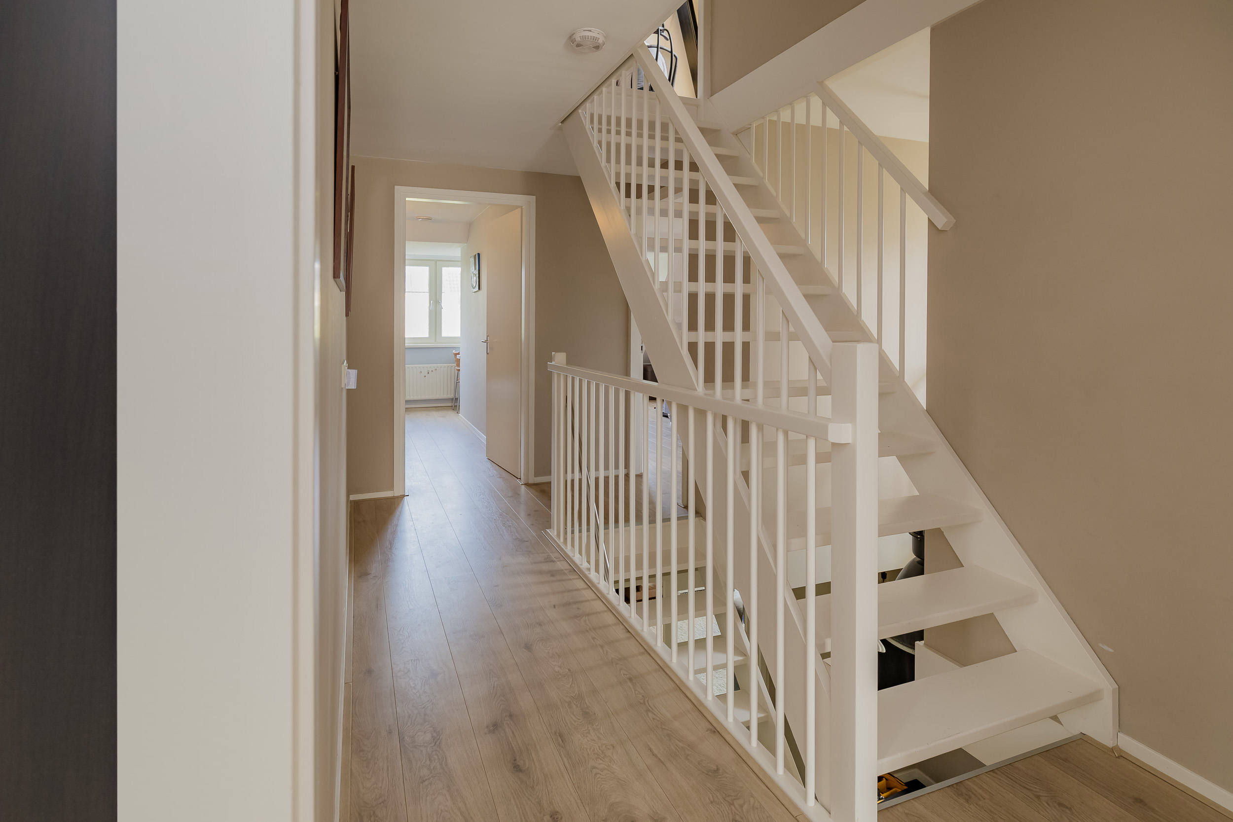Je komt binnen in een mooie hal met vide, die meteen een gevoel van ruimte geeft. Hier vind je de garderobe, het toilet, de trap en toegang tot de woonkamer.