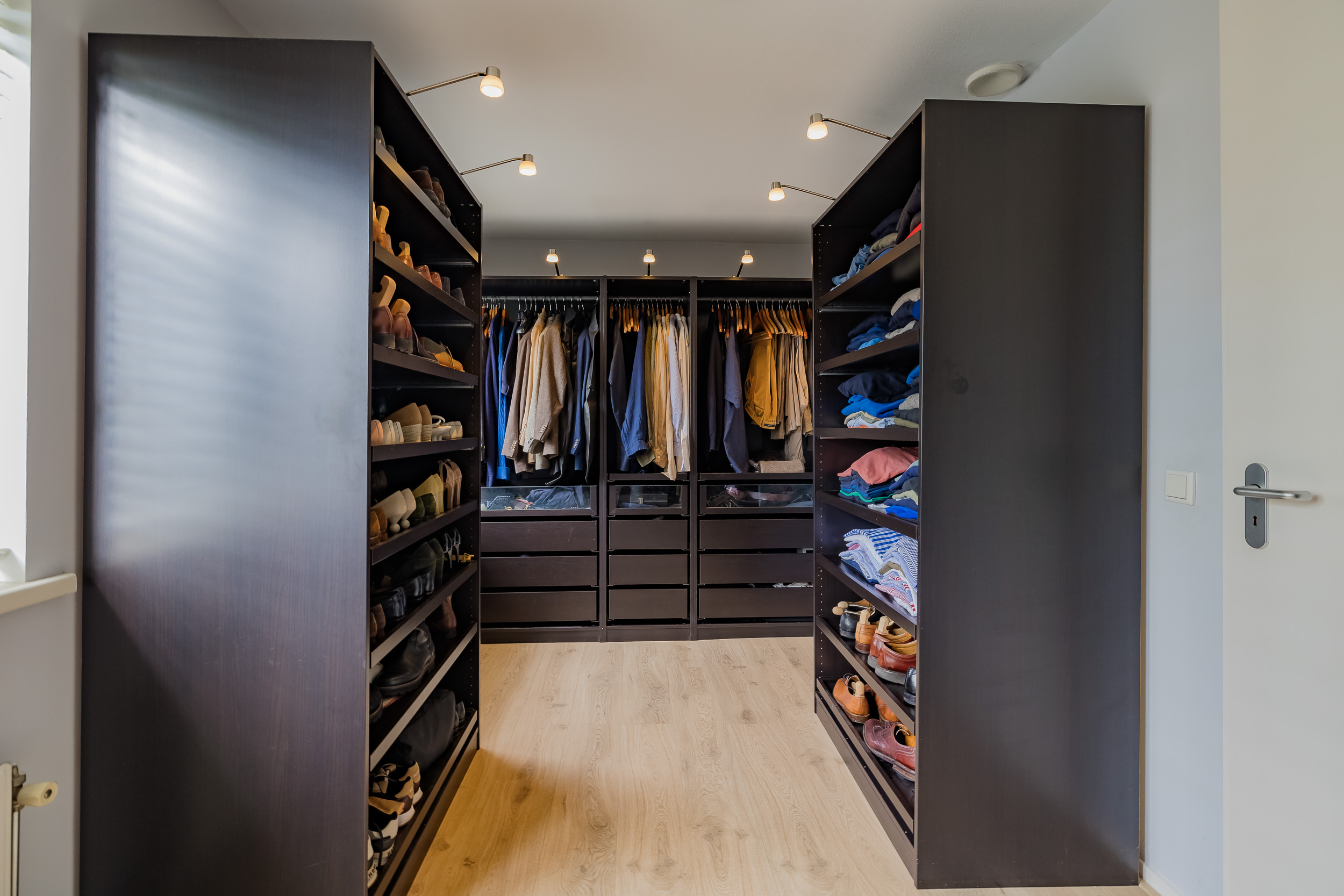 Via de open trap kom je op de eerste verdieping. De vide en overloop zorgen voor een open en ruimtelijk gevoel. Je hebt hier vier royale slaapkamers waarvan er één momenteel in gebruik is als kleedkamer.