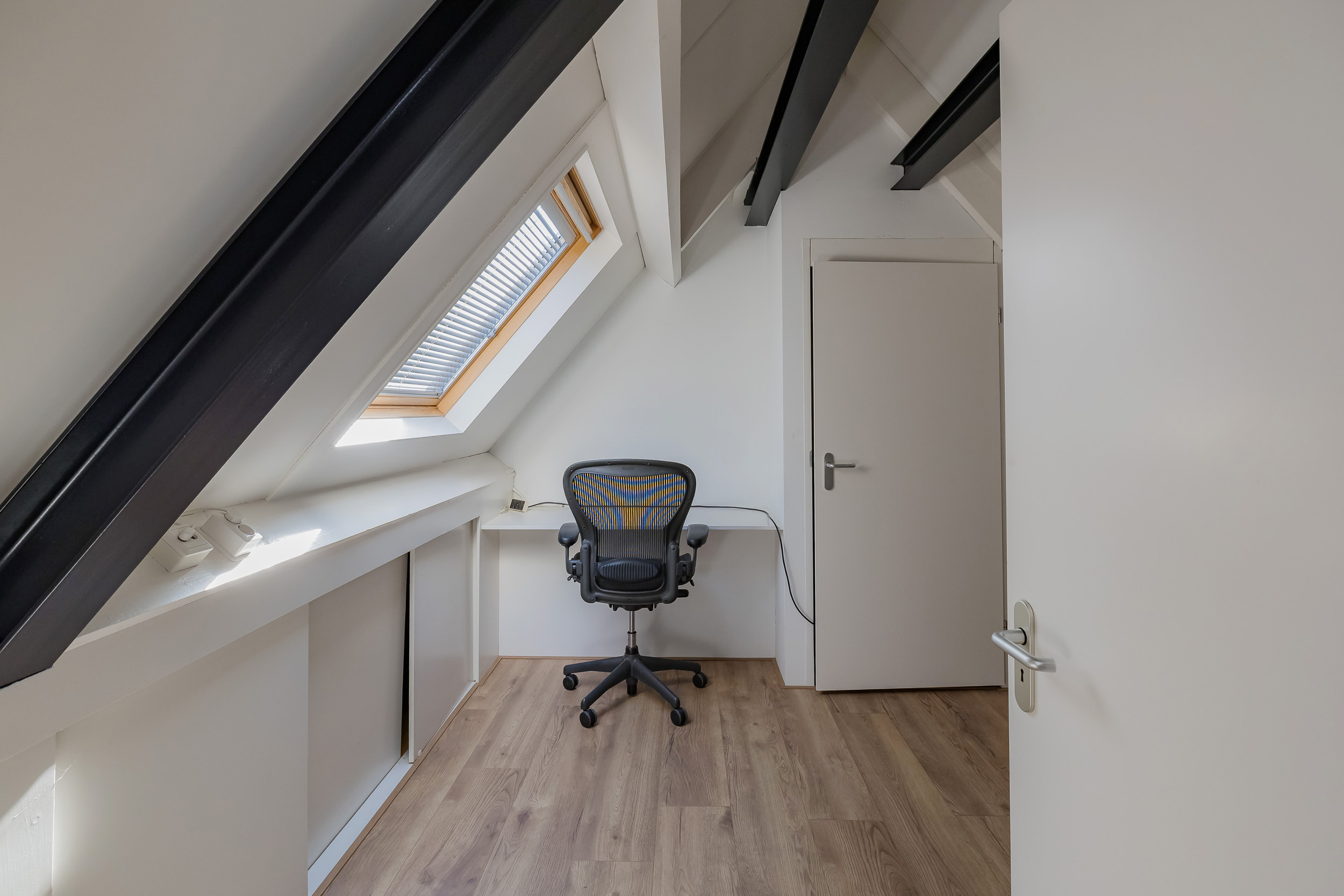 Een vaste trap brengt je naar de tweede verdieping met nog eens twee (slaap)kamers, die momenteel in gebruik zijn als kantoorruimte. Vanuit de achterkamer heb je toegang tot de stookruimte met cv-installatie (2016) en het WTW-ventilatiesysteem.
