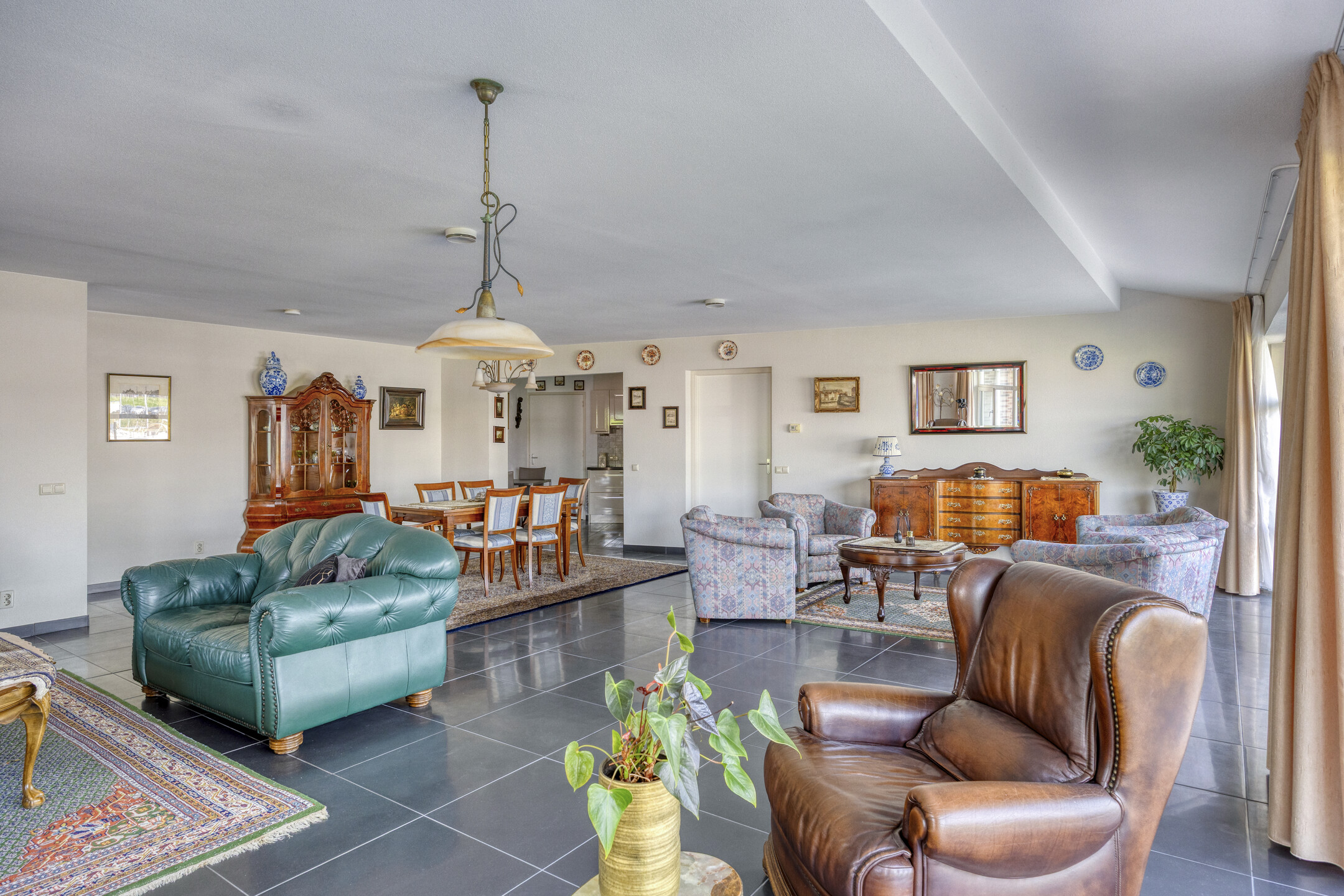 woonkamer met zicht op de haven voorzien van een schuifpui naar het royale terras van 70 m², wandafwerking sierpleister, tegelvloer, plafond afgewerkt met spuitwerk;