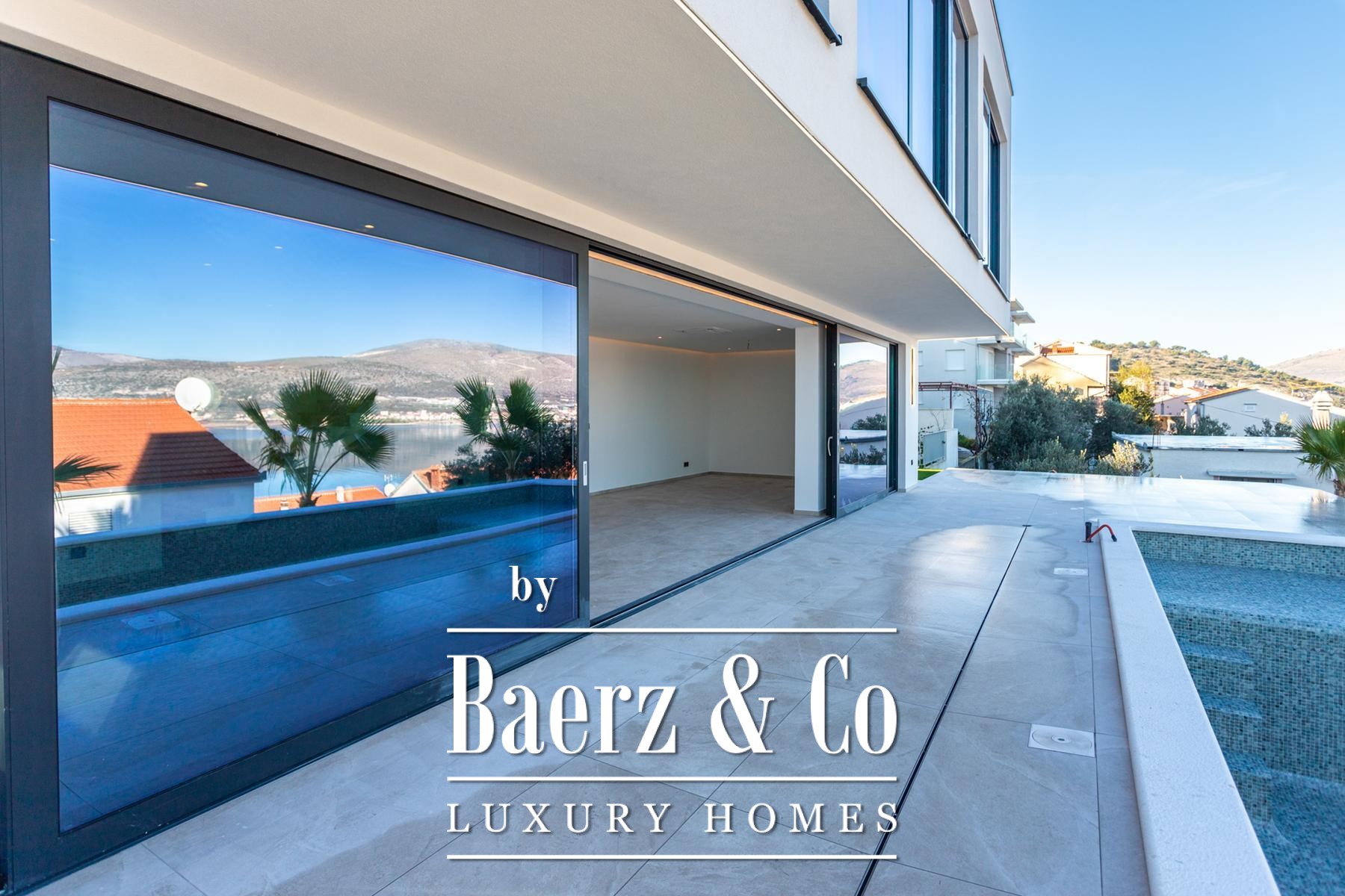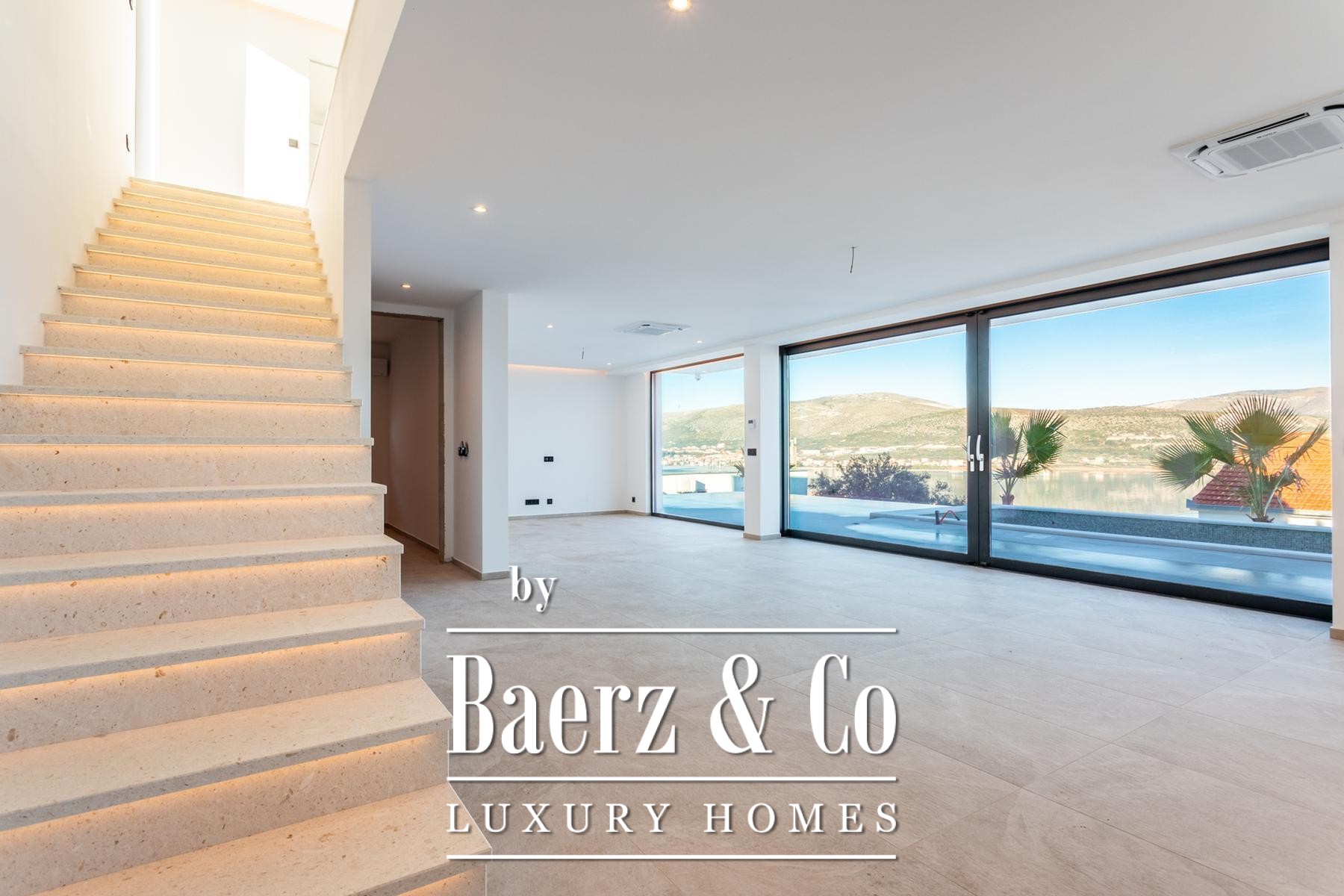 Villa Trogir Okolica biedt een onbelemmerd uitzicht op zee vanuit haar verhoogde ligging in Mastrinka, Čiovo, Kroatië. Deze nieuwgebouwde villa omvat 278 m² woonruimte, verdeeld over drie niveaus, waarbij elk detail getuigt van doordacht design.