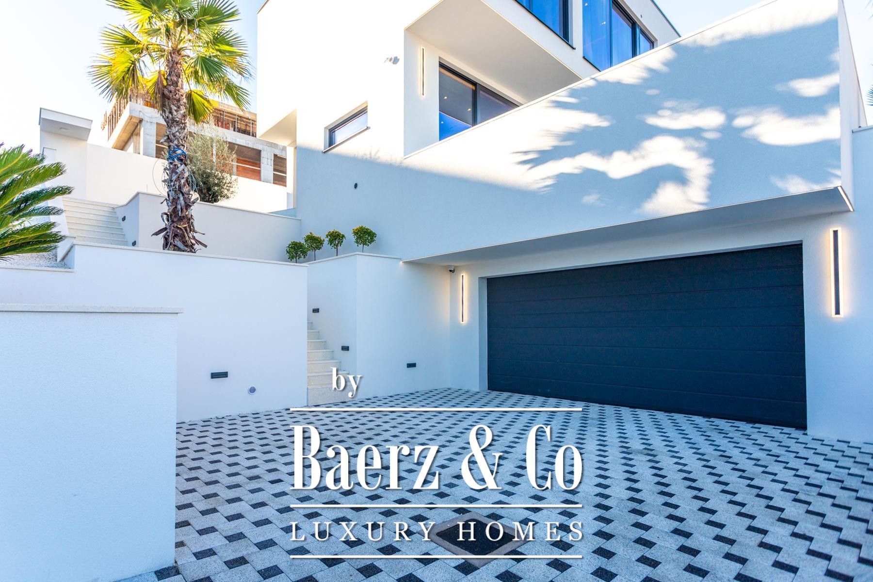 De villa verwelkomt u met een inpandige garage voor twee auto's, subtiel verbonden met een technische ruimte. De begane grond is ingericht als een open leefruimte, waar keuken, eetgedeelte en woonkamer samensmelten met vloerhoge glazen gevels. Natuurlijk licht vult elke hoek en er is een naadloze overgang naar een aangelegd terras en verwarmd zwembad.