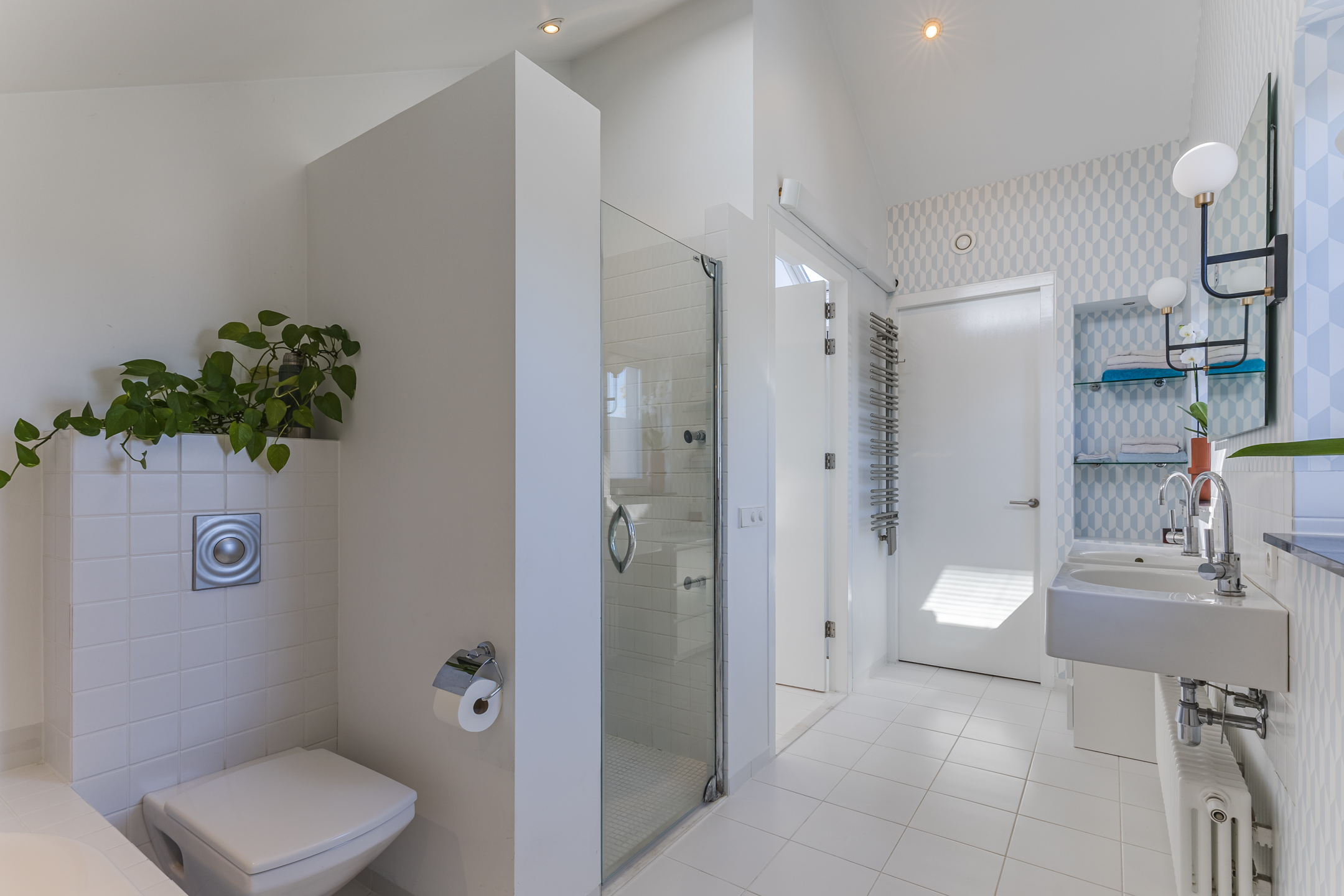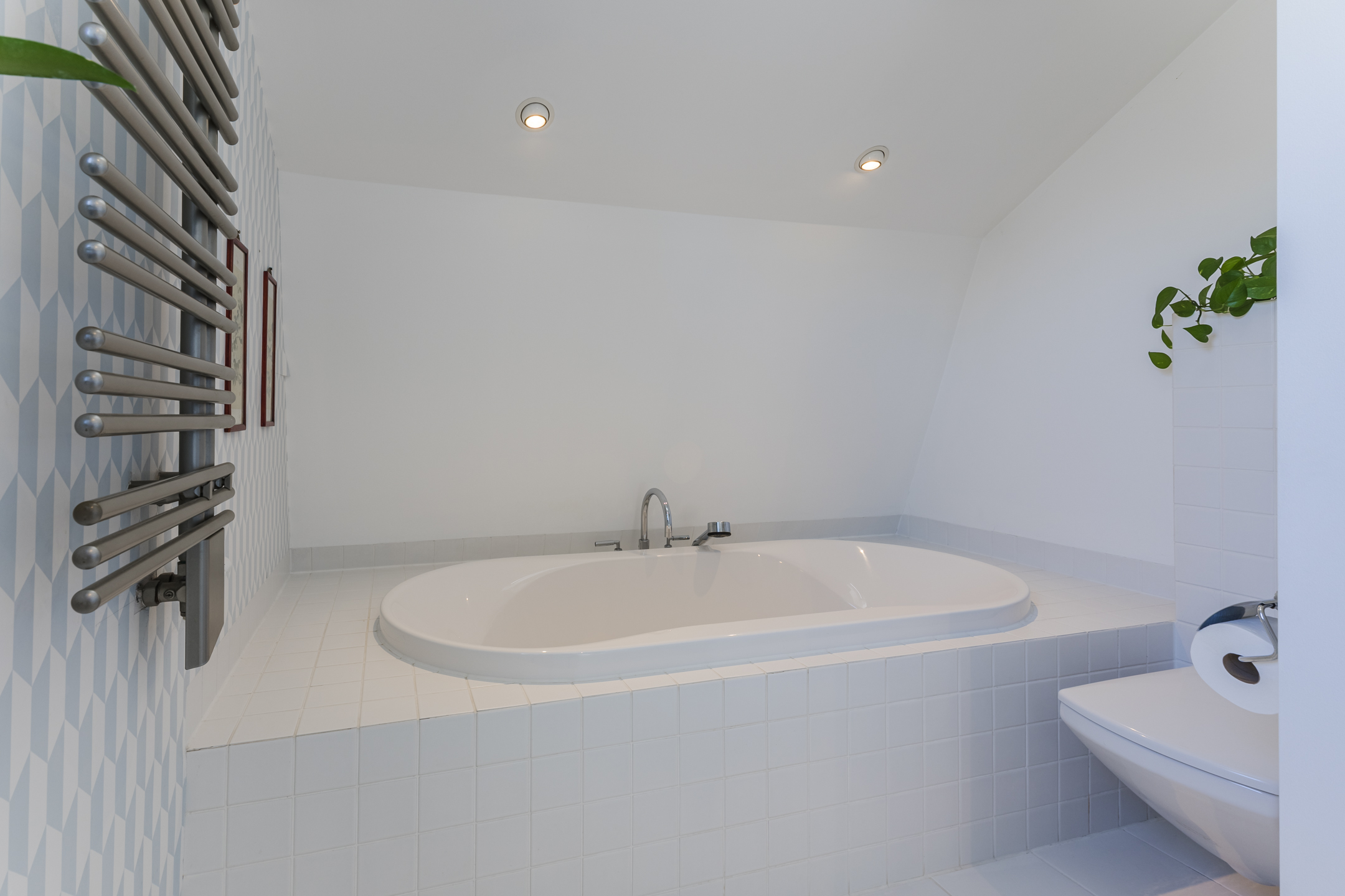 De betegelde badkamer is voorzien van vloerverwarming, een ligbad, een inloopdouche, wandcloset, wastafel, spiegelverwarming en instelbare mechanische ventilatie.