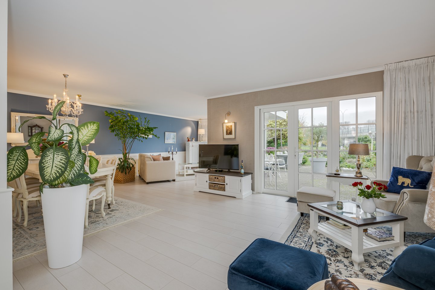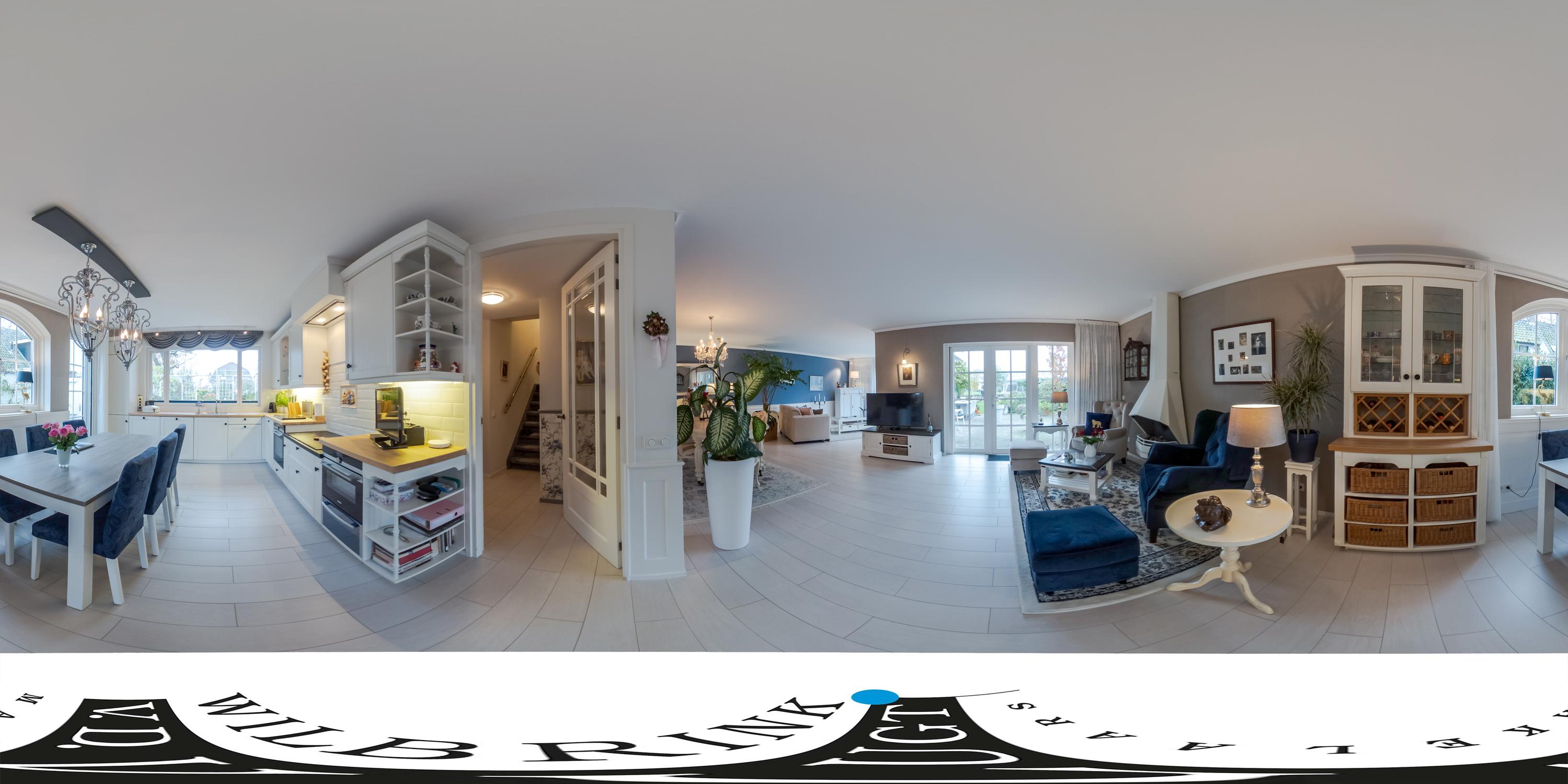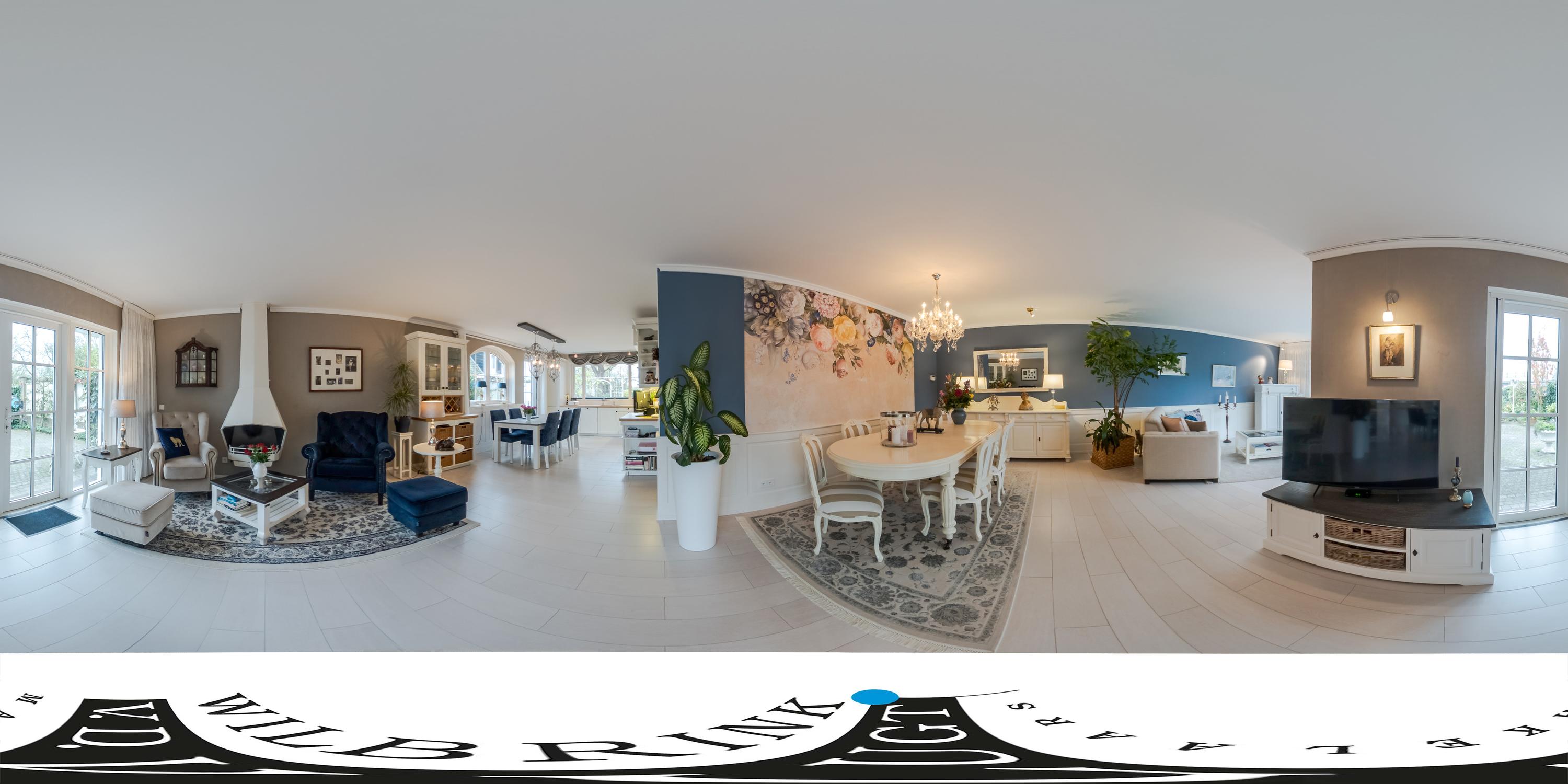 Je komt binnen in een ruime hal met garderobekast, toilet en bordestrap naar de eerste verdieping. De sfeervolle en royale living beschikt over een gasgestookte open haard en openslaande deuren naar de zonnige tuin. Grote raampartijen zorgen voor een prachtige lichtinval.