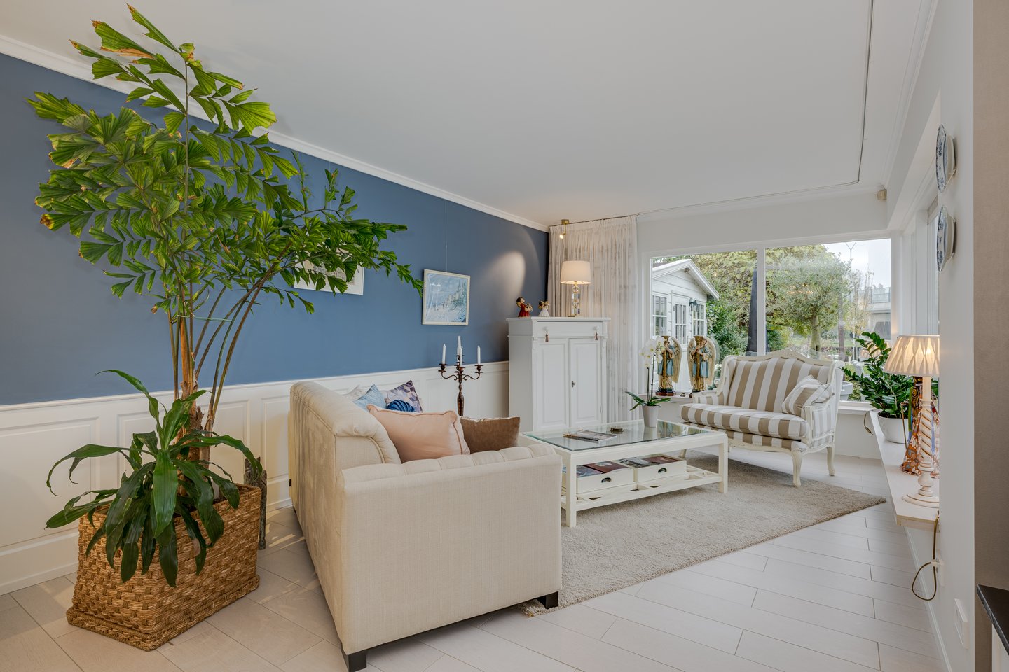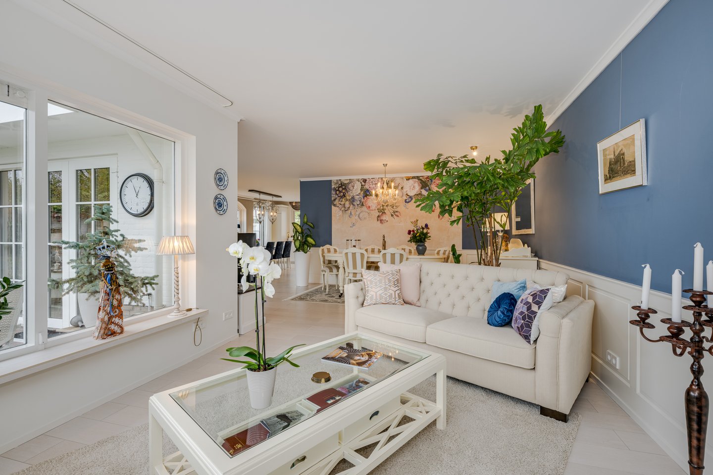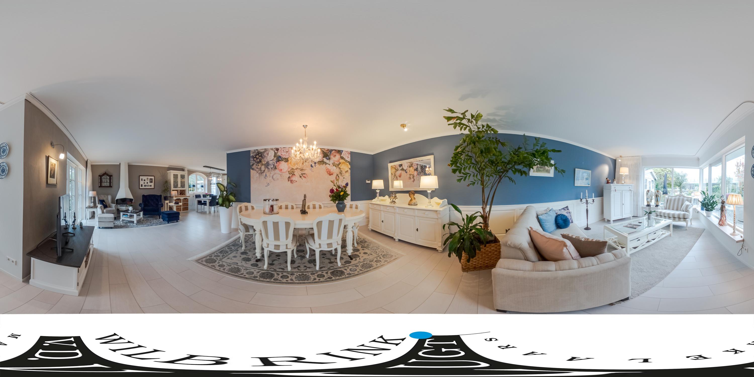 Je komt binnen in een ruime hal met garderobekast, toilet en bordestrap naar de eerste verdieping. De sfeervolle en royale living beschikt over een gasgestookte open haard en openslaande deuren naar de zonnige tuin. Grote raampartijen zorgen voor een prachtige lichtinval.