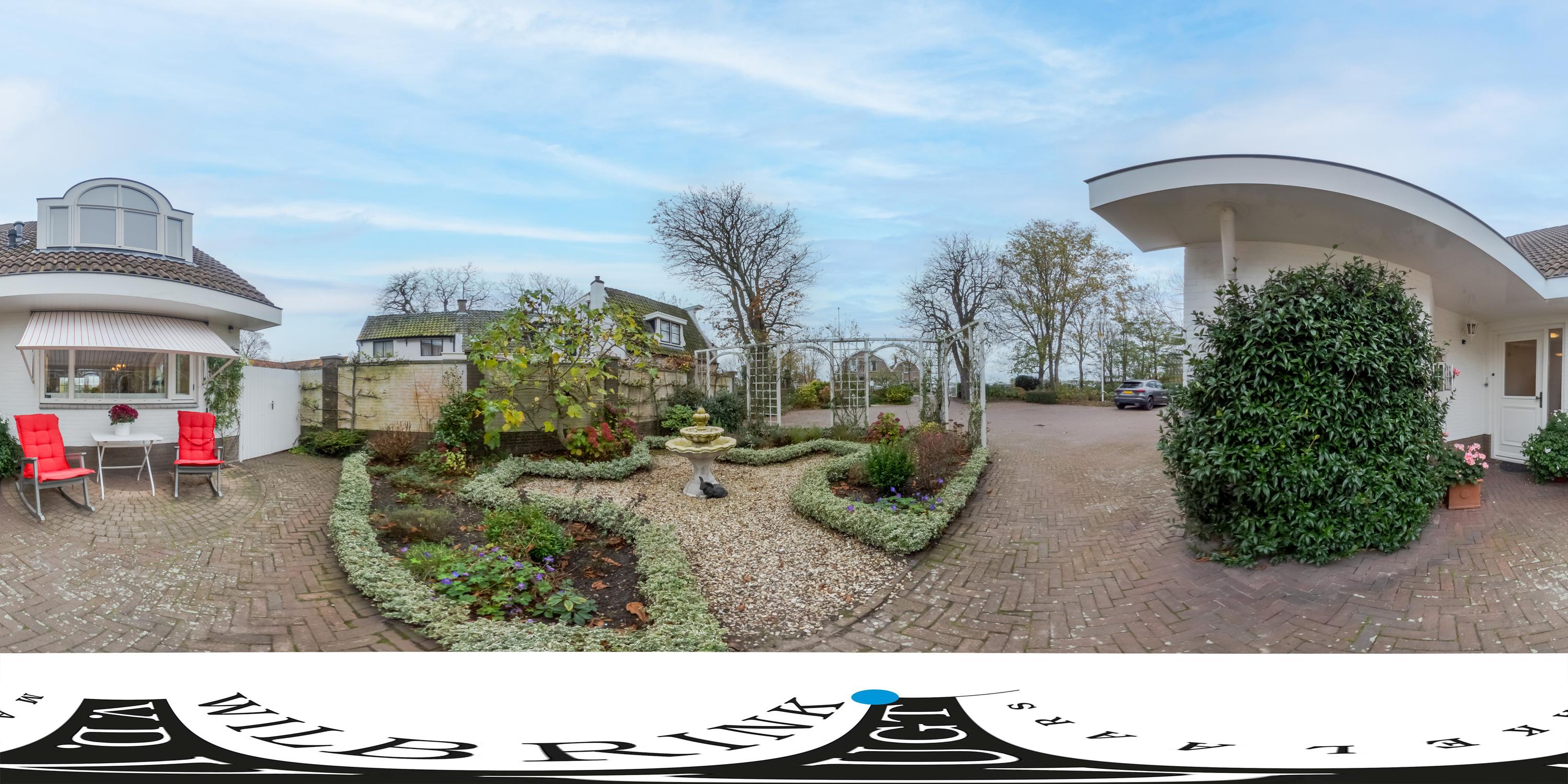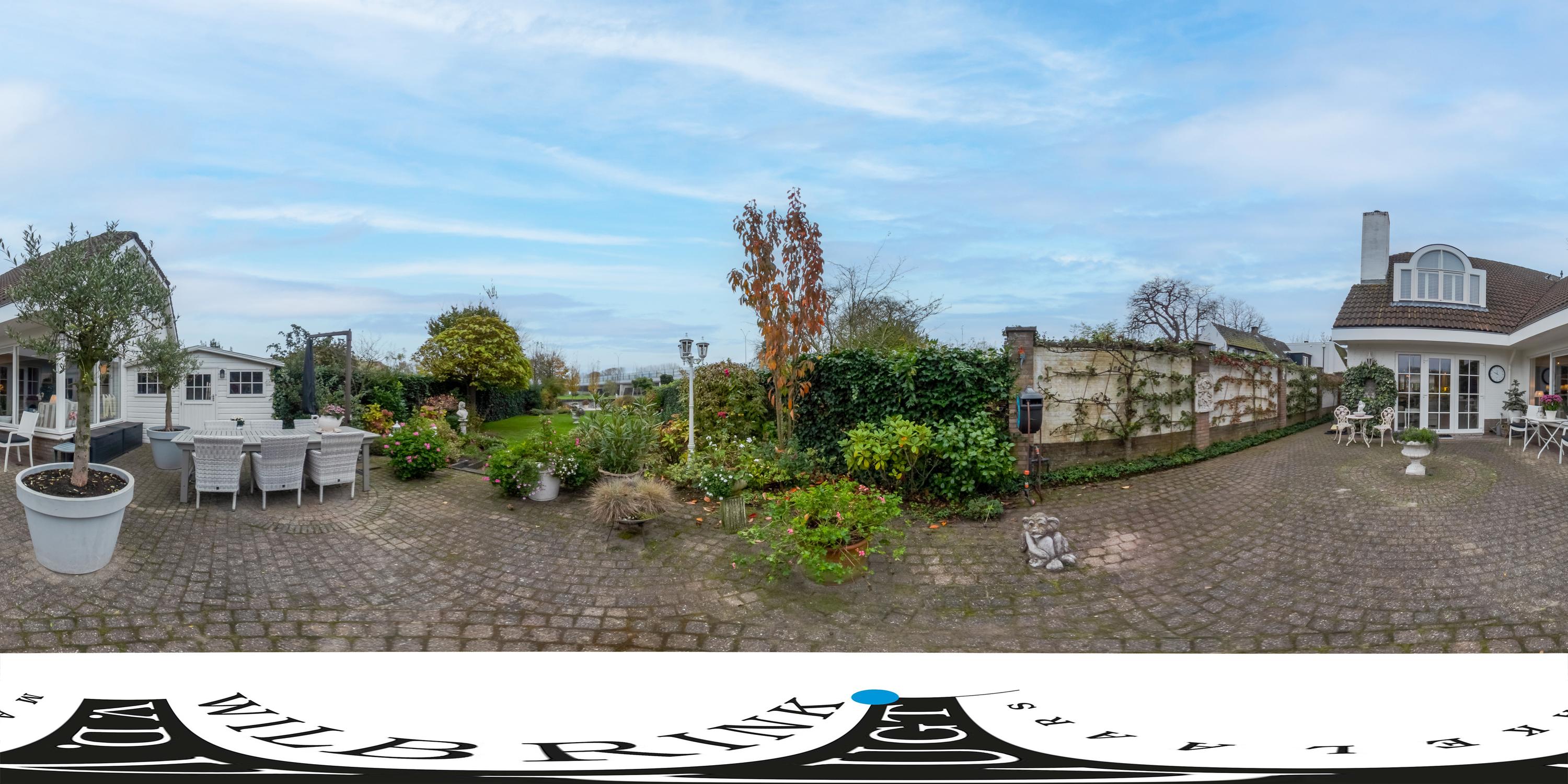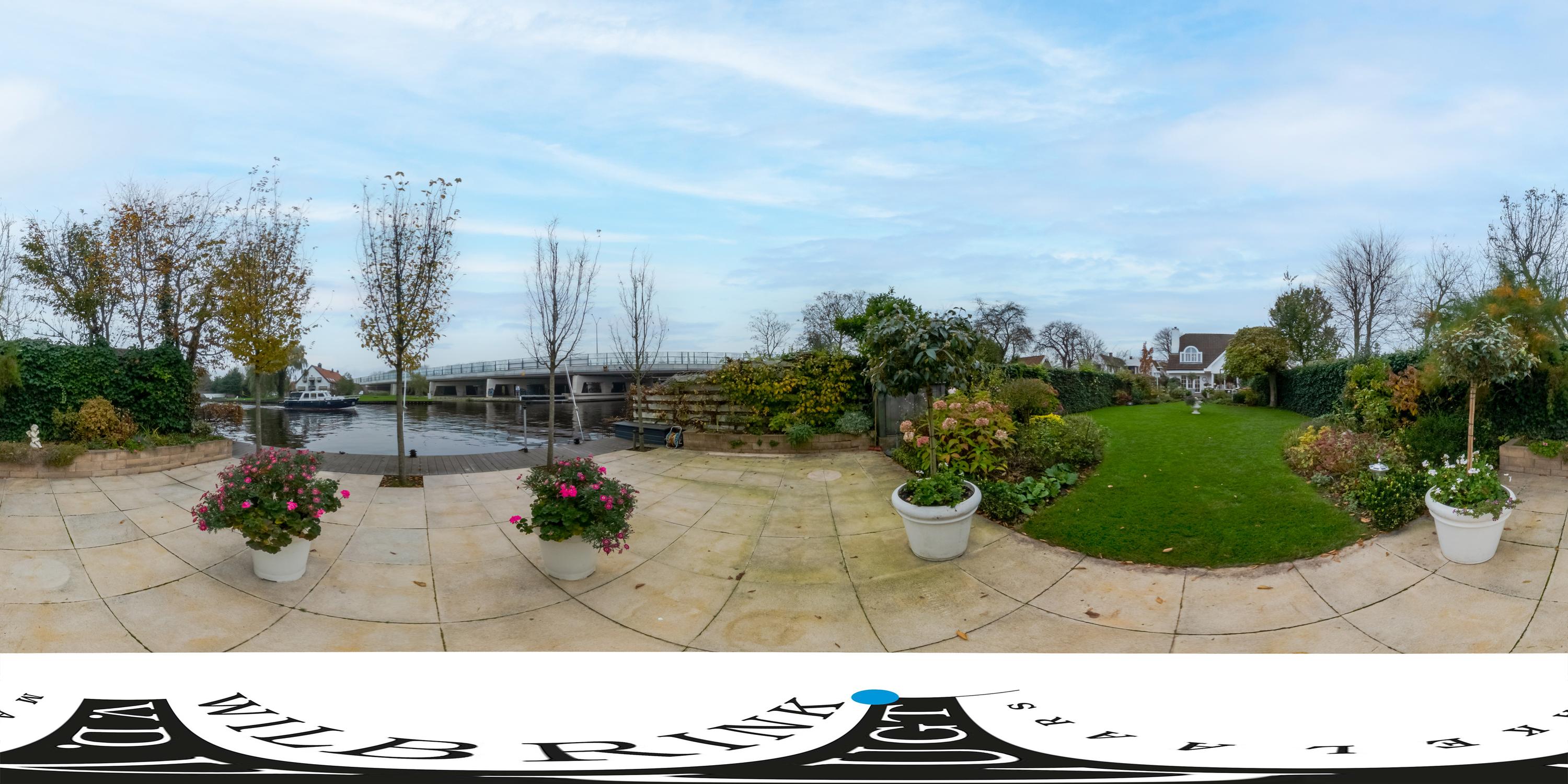 De prachtig aangelegde, zonnige achtertuin grenst direct aan vaarwater van de Oude Rijn en beschikt over een berging en een eigen aanlegsteiger. In de voortuin ligt een gezellig terras. In de middag en avond is het hier heerlijk toeven in de zon. De gehele tuin is voorzien van een sproei-installatie. In de voortuin is parkeergelegenheid voor drie auto’s op eigen terrein.